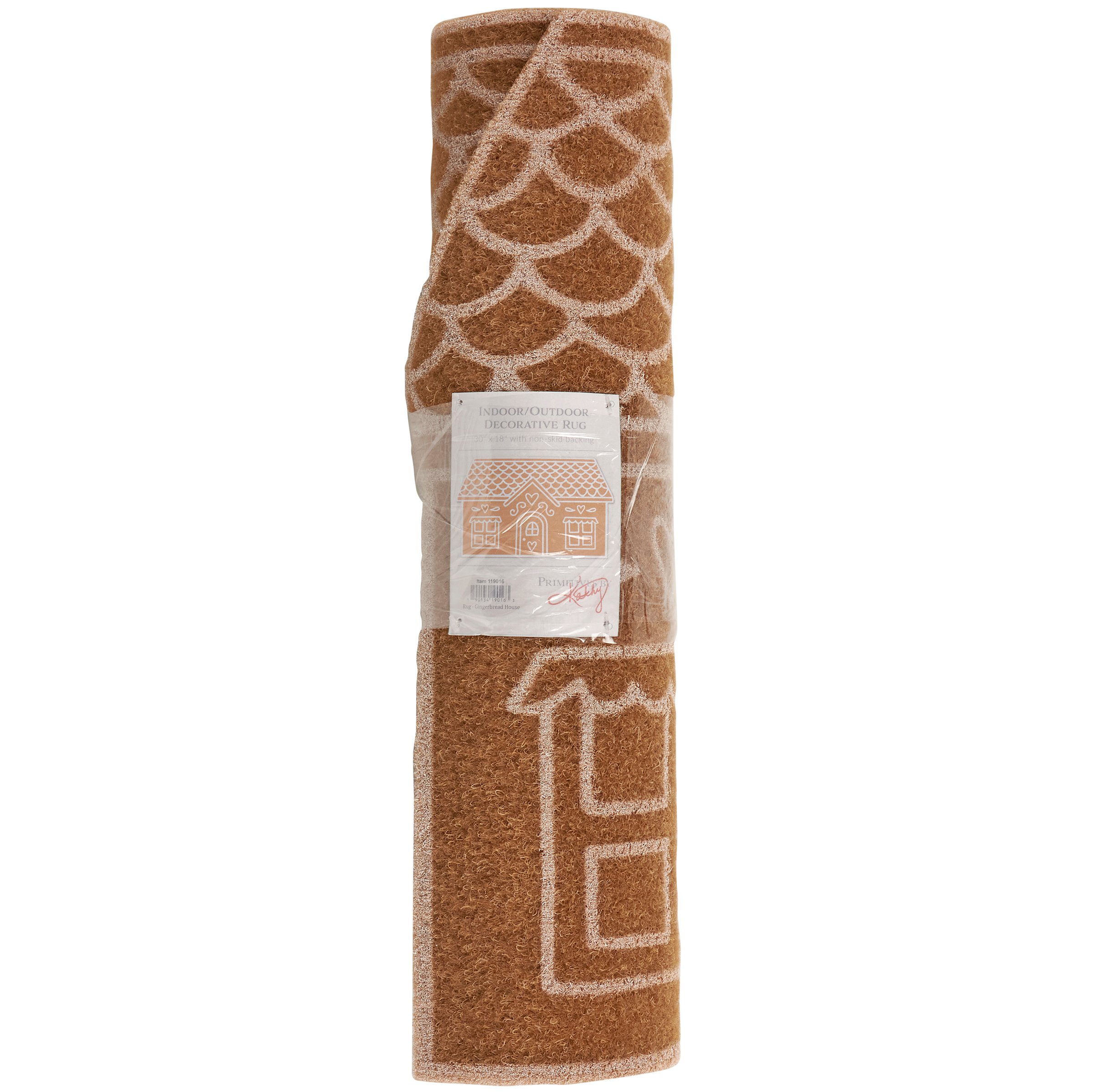 A durable faux coir rug from our Christmas Collection in the shape of the displayed gingerbread house design. Faux coir offers the benefit of not shedding over time, unlike natural coir rugs, so the integrity of the design and colors will last longer. Rug can be used indoor or outdoor and features skid-resistant backing to help stay in place. Spot cleaning recommended. Our Gingerbread House rug comes packaged neatly rolled with tag displaying full rug design. A gingerbread-themed home accent that adds functional seasonal style.