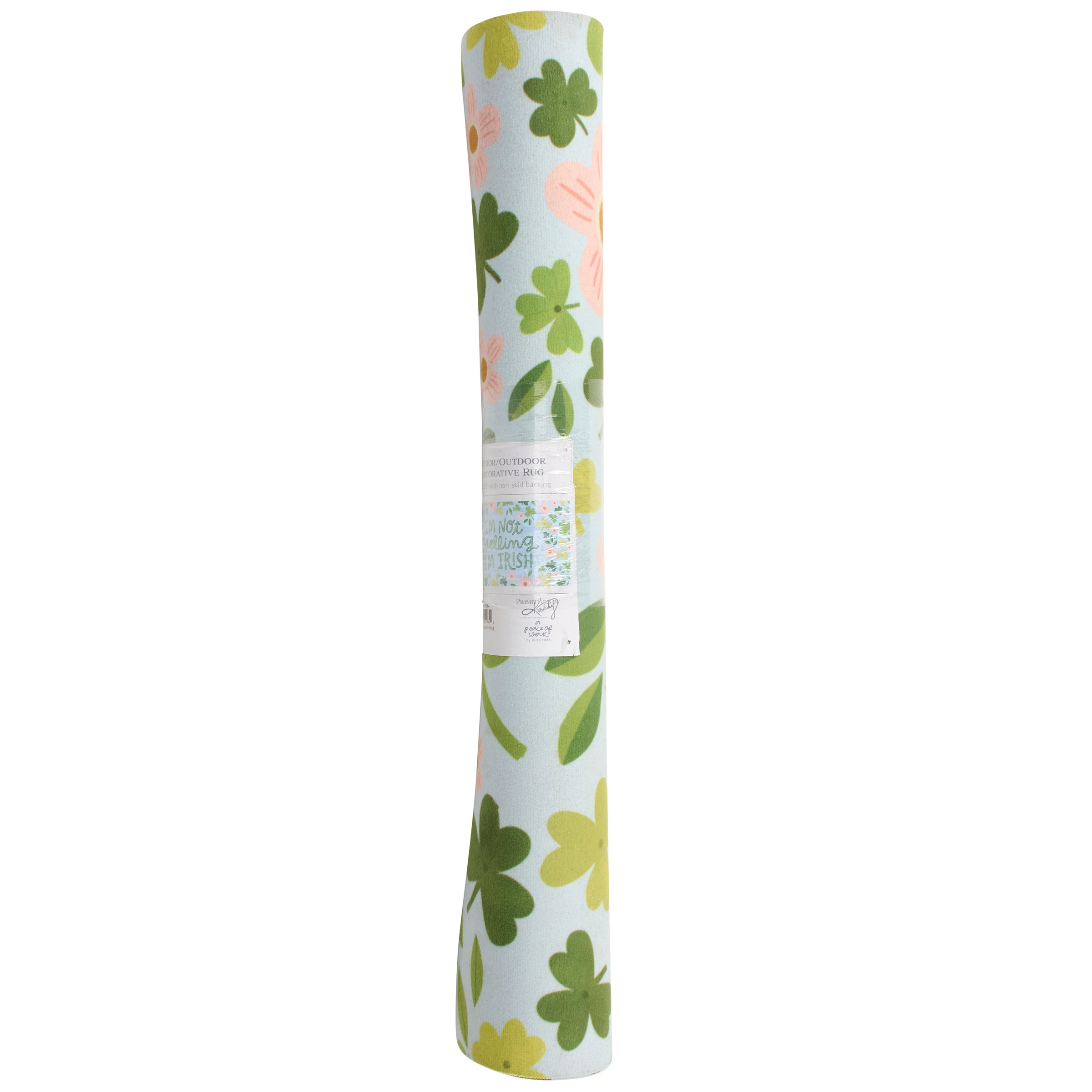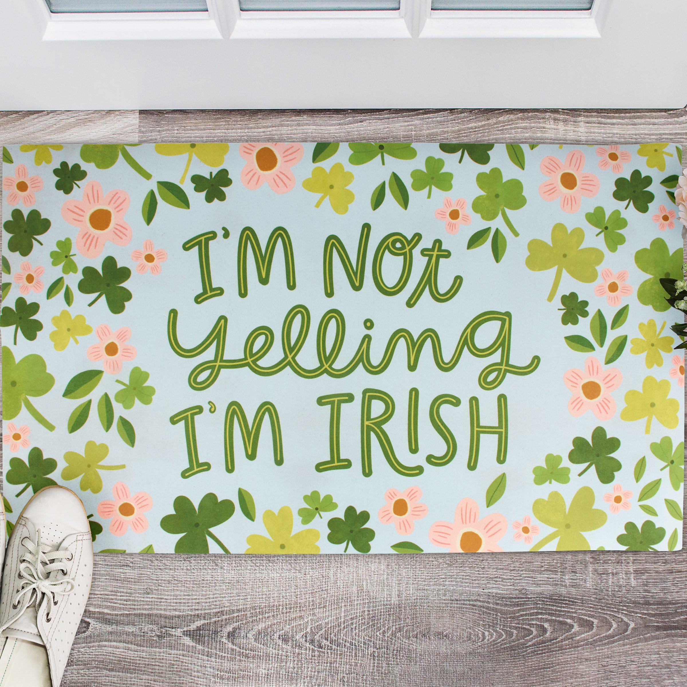 A polyester rug from our St. Patrick's Day Collection displaying a toss pattern of vibrant shamrocks and flowers around a fun St. Patrick's Day sentiment that reads "I'm Not Yelling - I'm Irish." Fun St. Patrick's Day design is replicated from original hand illustrated artwork. Seasonal rug can be used indoor or outdoor and features skid-resistant backing to help stay in place. Spot cleaning recommended. Our I'm Not Yelling I'm Irish rug comes packaged neatly rolled with tag displaying full rug design. A fun St. Patrick's Day home accent that adds functional style to any space.