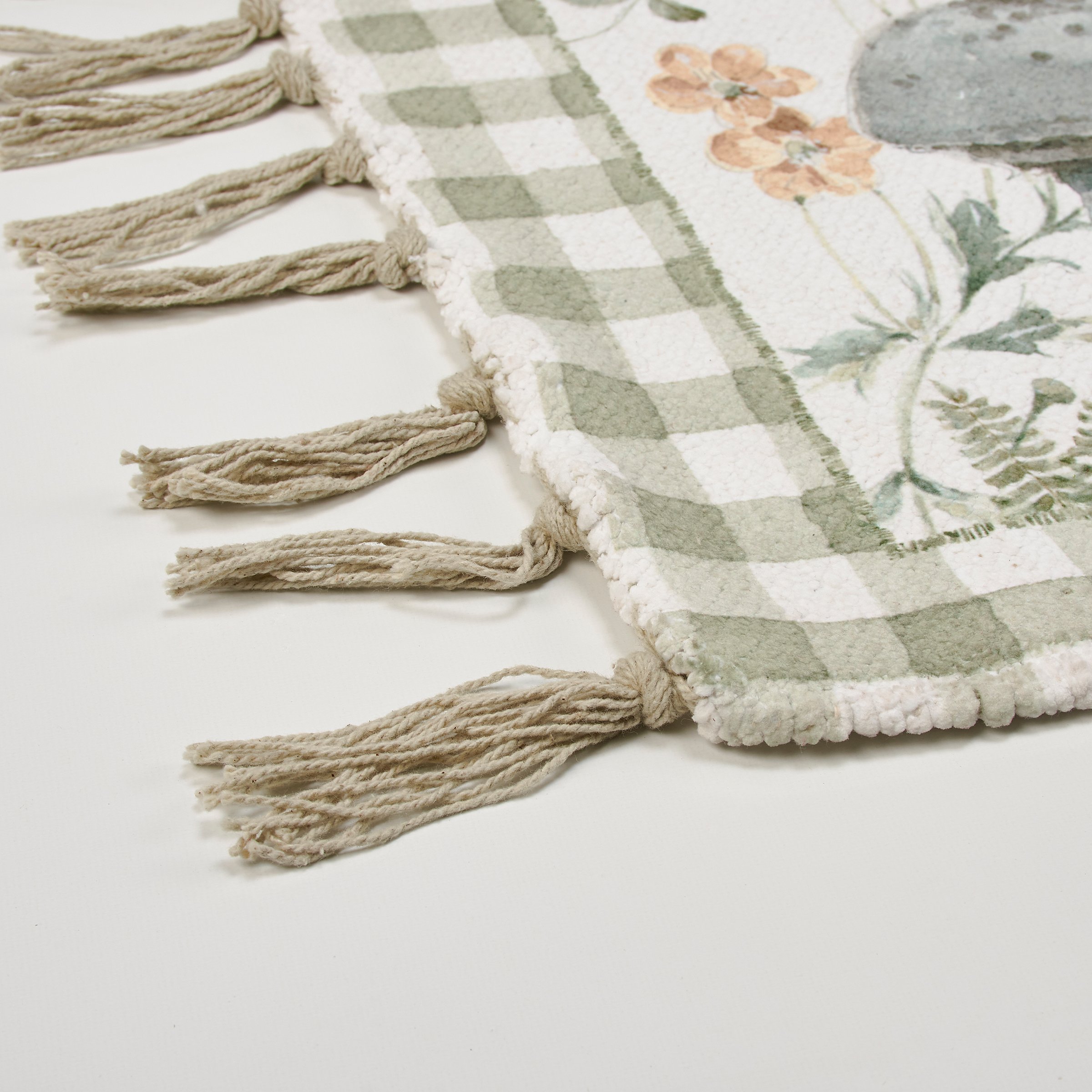 A cotton and chenille rug from our Cottagecore Collection displaying a hand painted design of mushrooms with coordinating green gingham border and tassels on the sides. Rug can be used indoor or outdoor and features skid-resistant backing to help stay in place. Our Mushroom Study rug comes packaged neatly rolled tied with cotton tape and includes tag displaying full rug design. A rustic everyday home accent. Spot cleaning recommended.