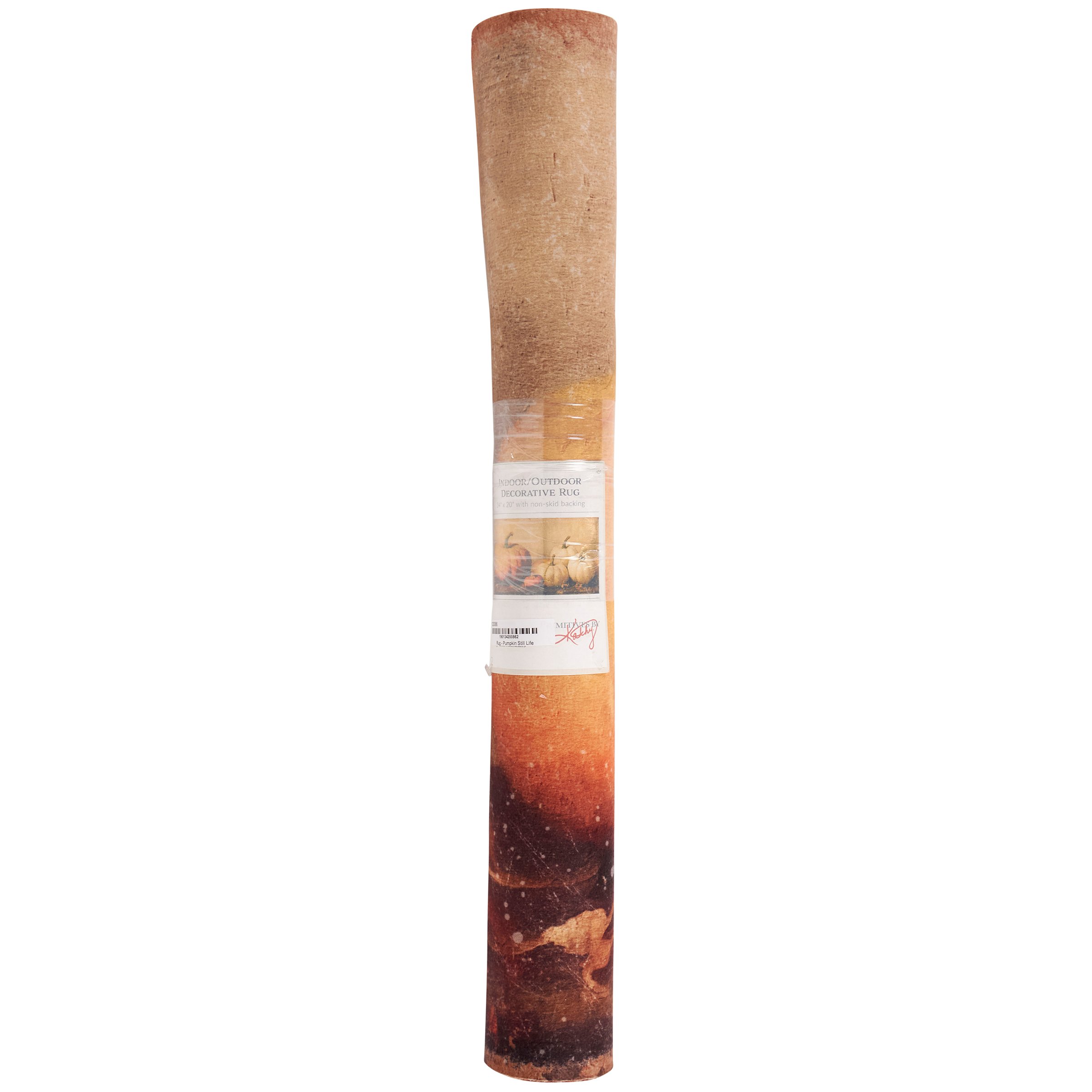 A polyester rug from our Halloween Collection displaying still life art of a group of pumpkins with textured rustic details. Seasonal rug can be used indoor or outdoor and features skid-resistant backing to help stay in place. Spot cleaning recommended. Our Pumpkin Still Life rug comes packaged neatly rolled with tag displaying full rug design. A Halloween home accent that adds functional rustic style.