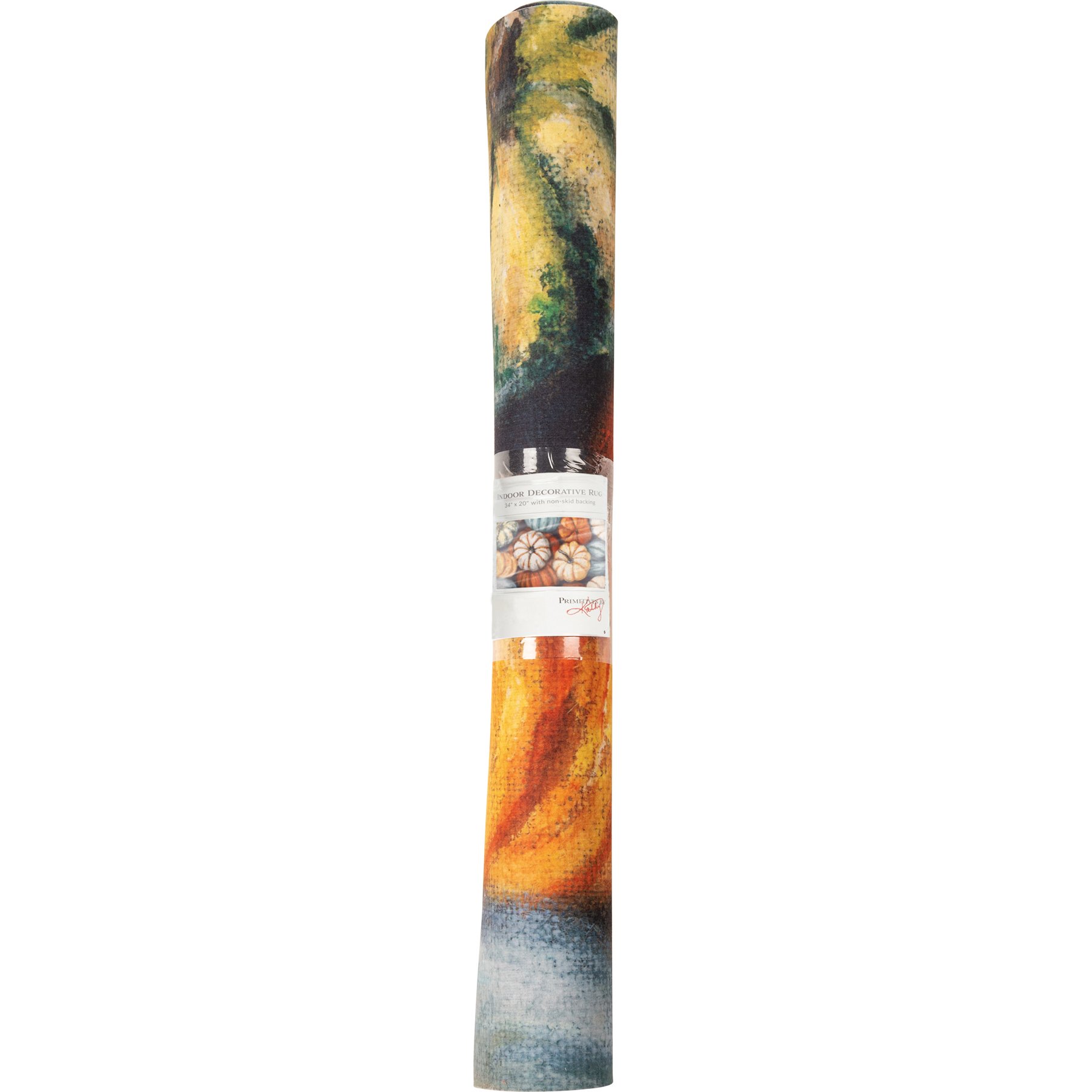 A polyester rug from our Fall & Harvest Collection featuring colorful pumpkin designs and skid-resistant PVC backing. Design is replicated from original artwork painted onto burlap canvas, giving the art a unique depth and texture. Rug is neatly rolled with tag featuring full design. Our Pumpkins rug is intended for indoor or sheltered outdoor use. Spot cleaning is recommended.