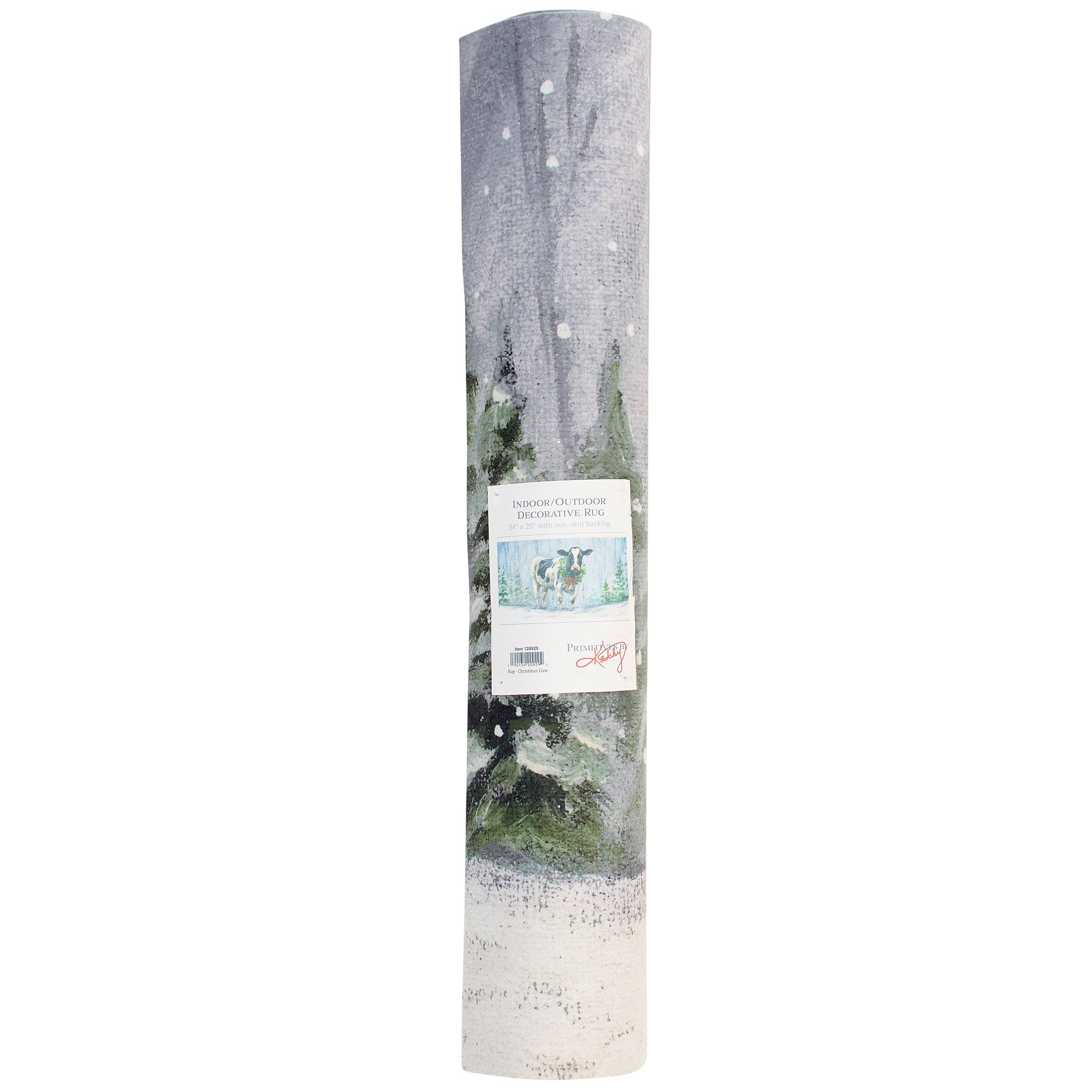 A polyester rug from our Christmas Collection displaying a charming winter scene of a dairy cow wearing a holiday wreath in a snowy forest. Christmas cow design is replicated from original artwork painted onto burlap canvas, giving the art a unique depth and texture. Seasonal rug can be used indoor or outdoor and features skid-resistant backing to help stay in place. Spot cleaning recommended. Our Snowy Cow rug comes packaged neatly rolled with tag displaying full rug design. A farm-themed Christmas home accent that adds functional rustic style.
