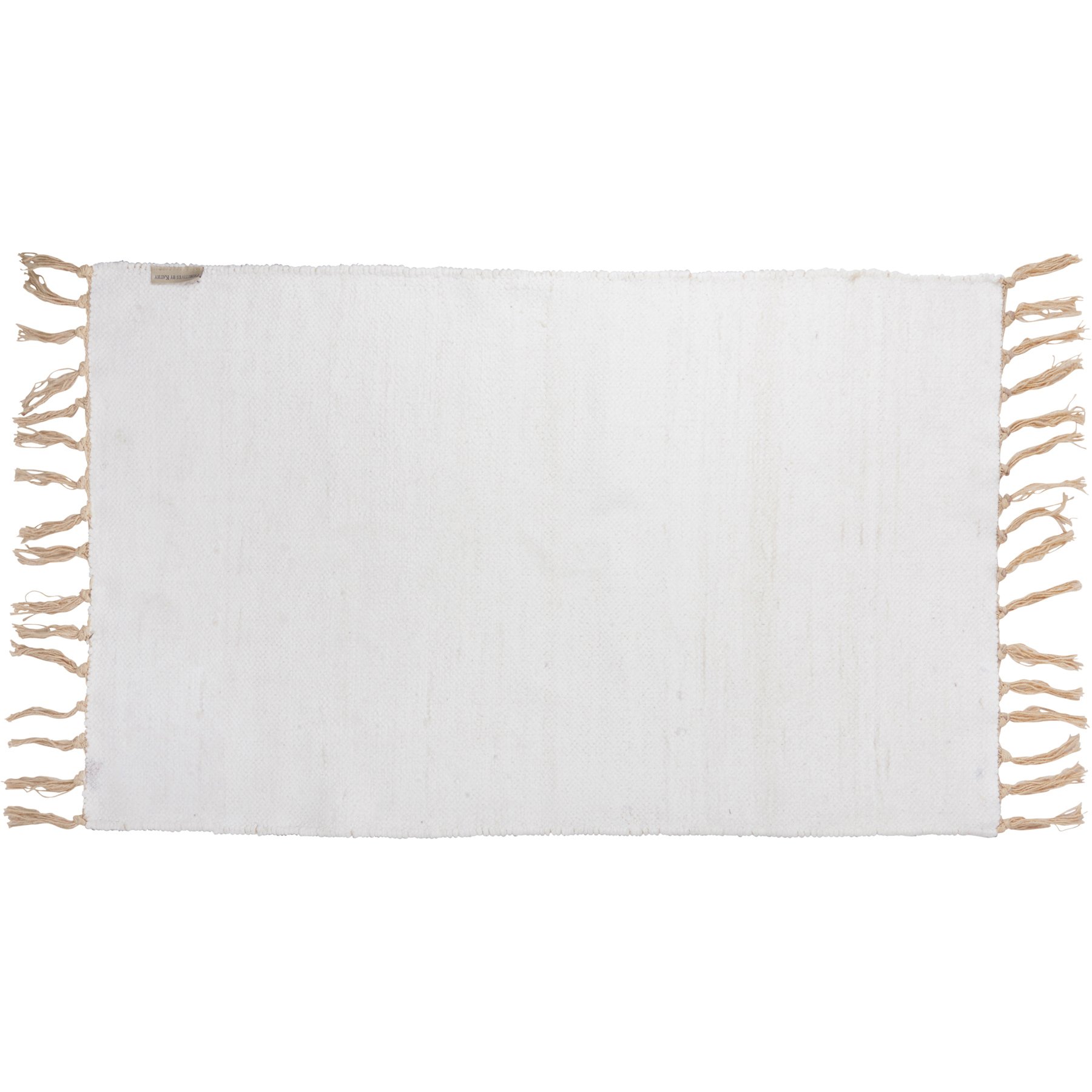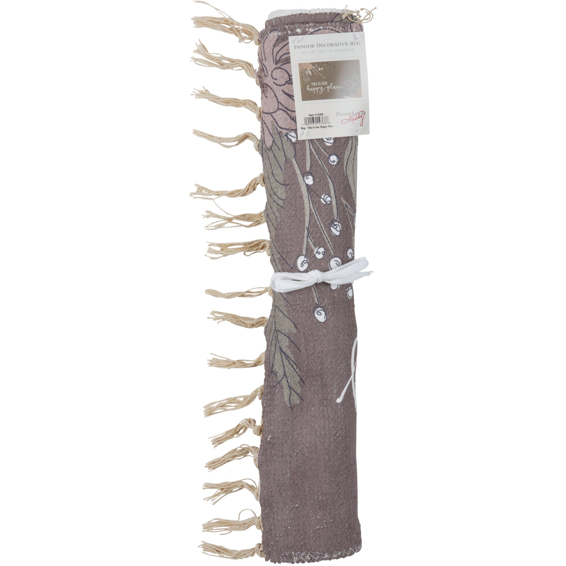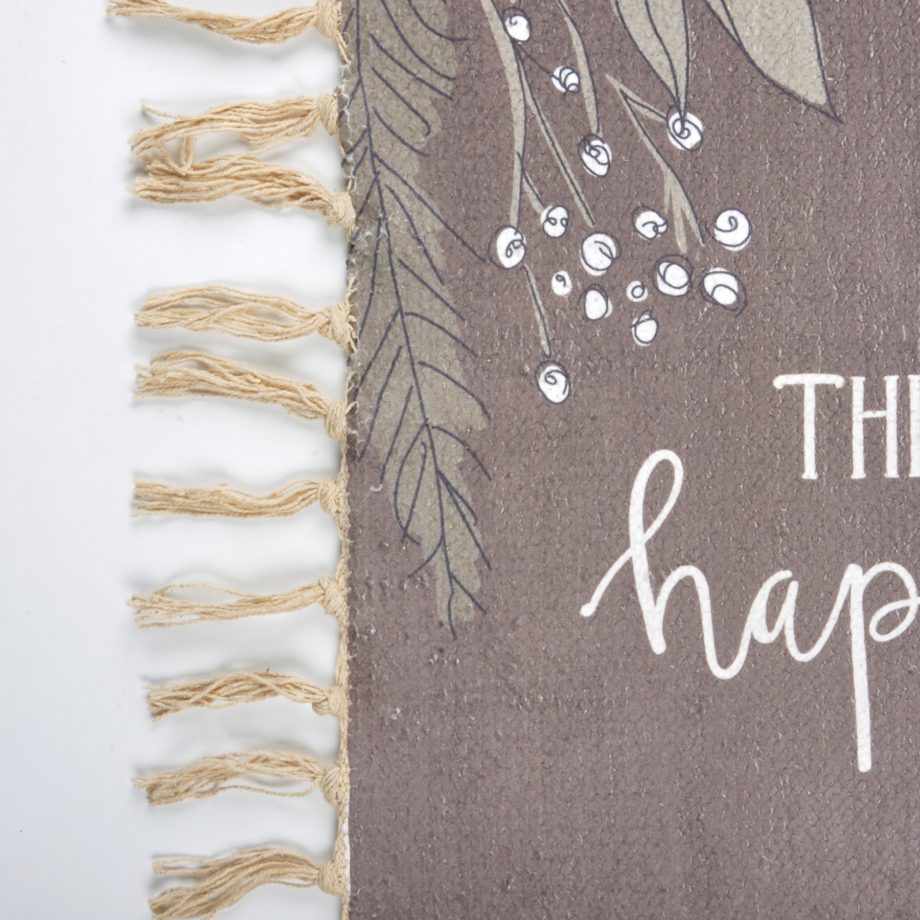 A cotton and chenille blend rug from our Cottagecore Collection displaying comforting hand illustrated flower designs with "This Is Our Happy Place" sentiment. Rug features tassel details on both ends for added interest. Includes skid-resistant backing and is neatly rolled with a tag displaying full design. The Happy Place rug is intended for indoor use. Spot cleaning recommended.