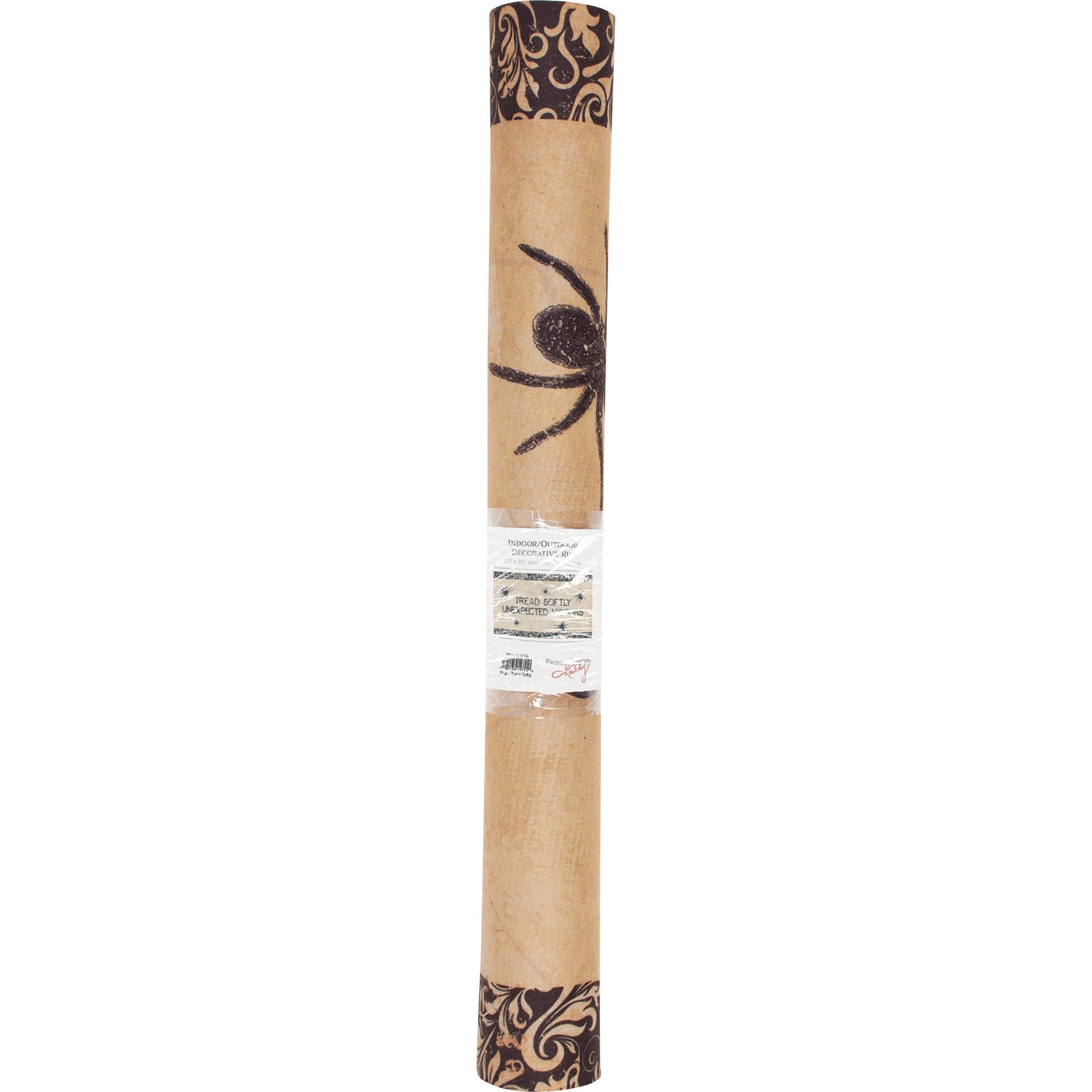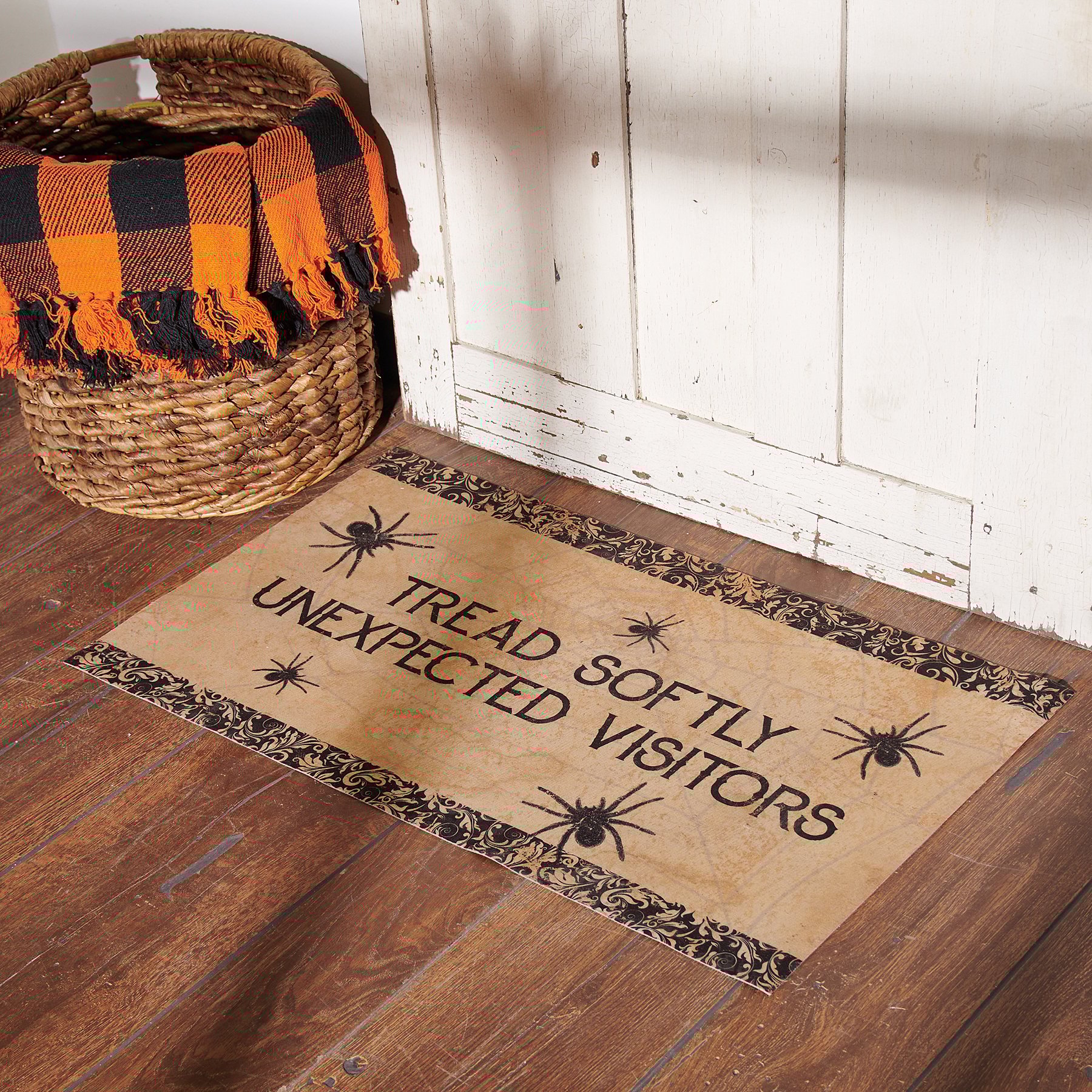 A polyester rug from our Halloween Collection displaying rustic spider designs and "Tread Softly Unexpected Visitors" sentiment between a top and bottom ornate pattern border. Rug can be used indoor or outdoor and features skid-resistant backing to help stay in place. Our Tread Softly Unexpected Visitors rug comes packaged neatly rolled with tag displaying full rug design. A rustic seasonal home accent.