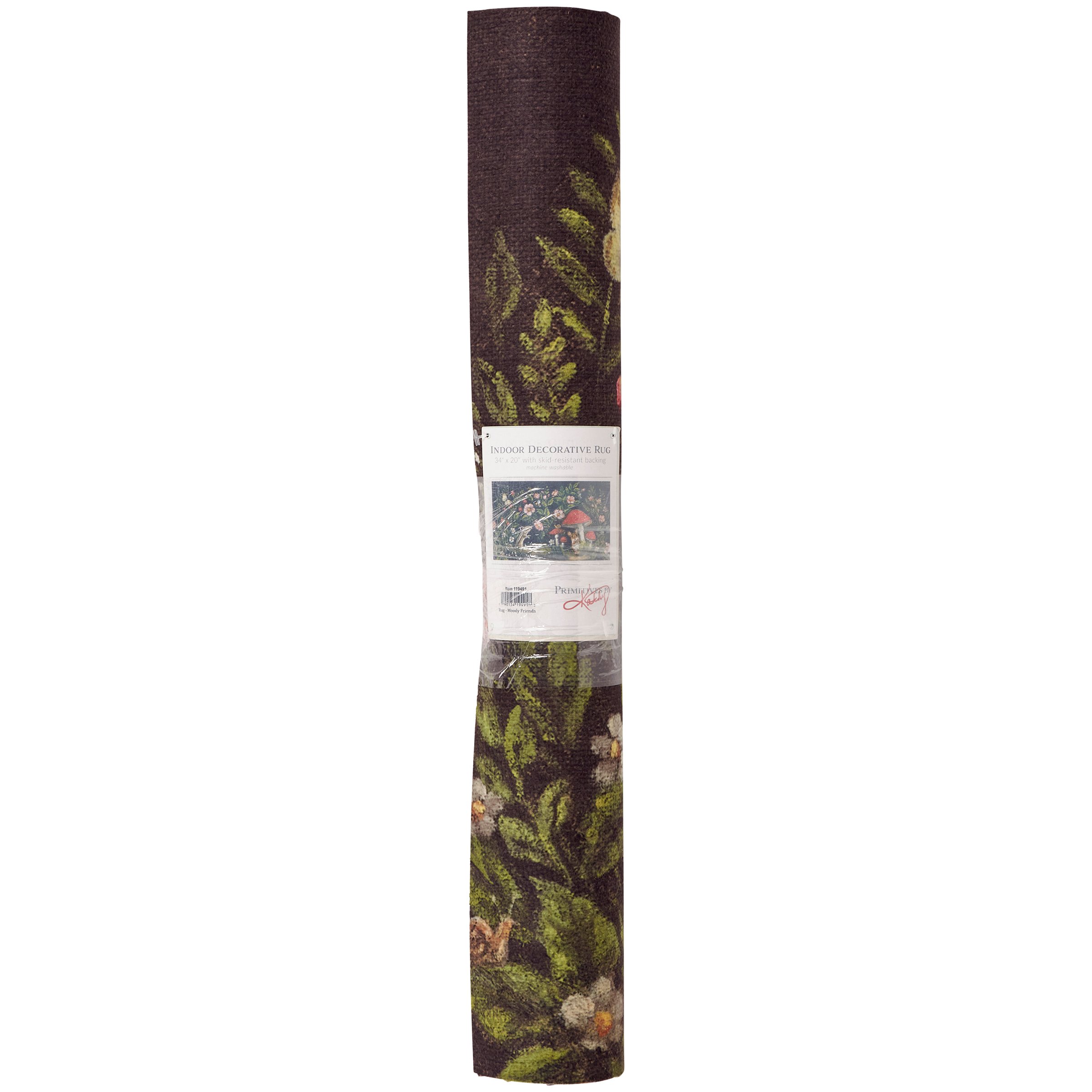 A polyester rug from our Easter & Spring Collection displaying a comforting scene of woodland animals surrounded by spring florals in a moody color palette. Design is replicated from original artwork painted onto burlap canvas, giving the art a unique depth and texture. Rug can be used indoor or outdoor and features skid-resistant backing to help stay in place. Spot cleaning recommended. Our Woodland Friends rug comes packaged neatly rolled with tag displaying full rug design. A stylish seasonal home accent that adds functional style.