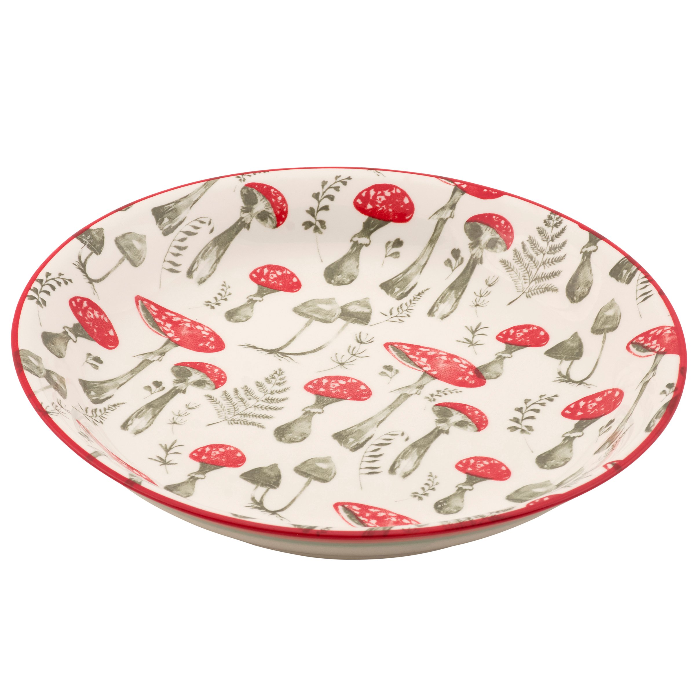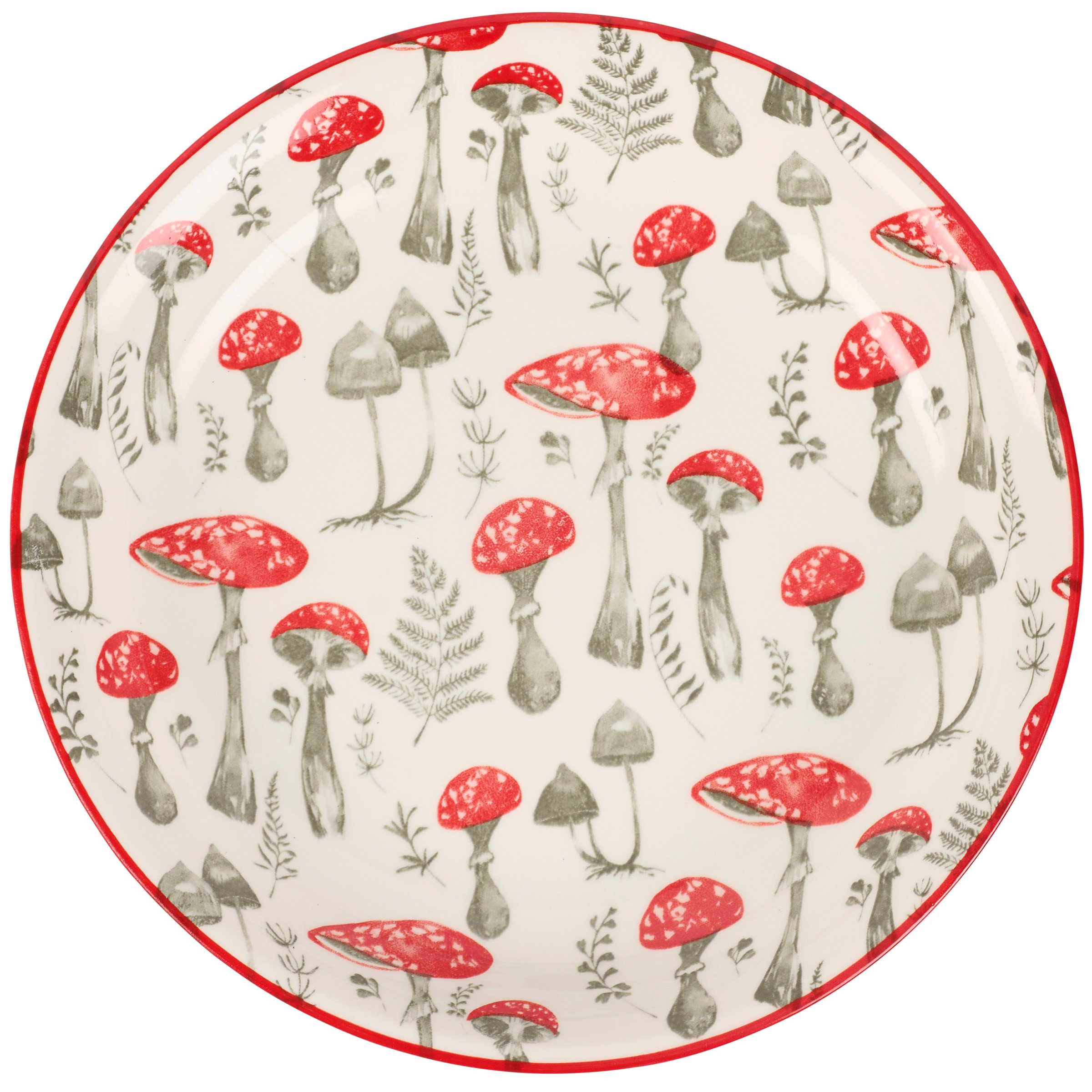 A durable stoneware salad plate from ourĀ Cottagecore Collection displaying a wild mushroom pattern on the inside of the plate with red accent on the rim. Our Red Mushroom salad plate is conveniently microwave, oven, dishwasher, and food safe for easy use. A piece of rustic dishware perfect for nature-themed tablescapes.