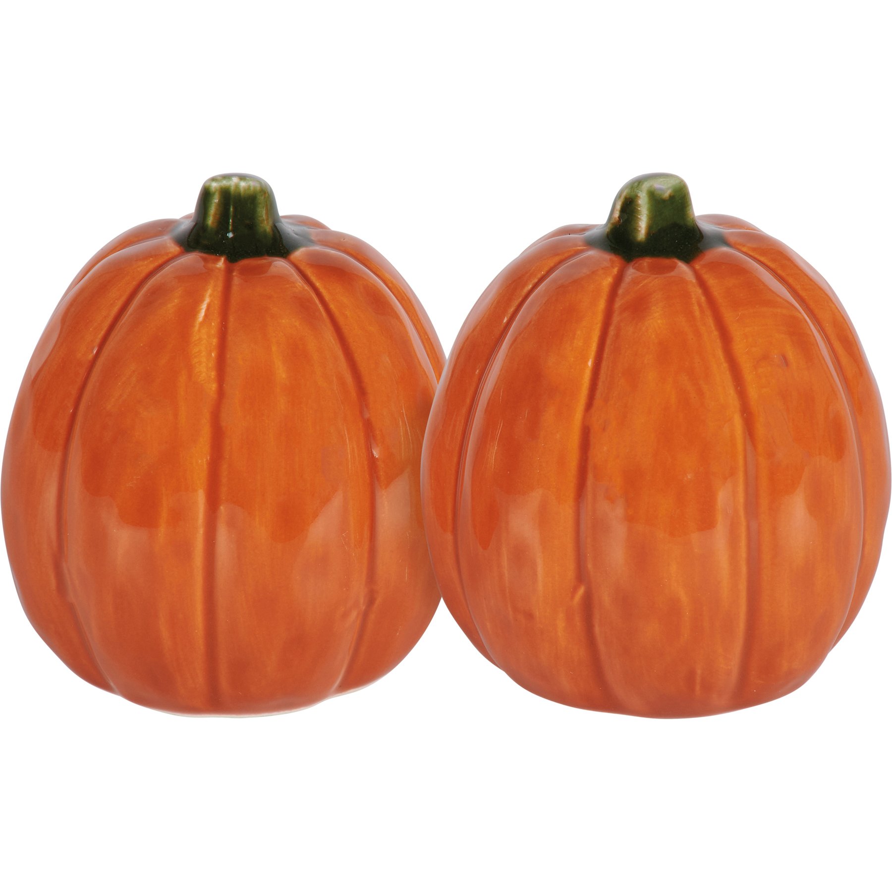 A set of stoneware salt and pepper shakers from our Fall & Harvest Collection featuring a charming orange and green pumpkin design on each. Shakers include unique openings to tell them apart and plastic stoppers for easy refilling. Our Pumpkin salt and pepper shakers are dishwasher and food safe for easy use. A rustic and functional seasonal home accent.