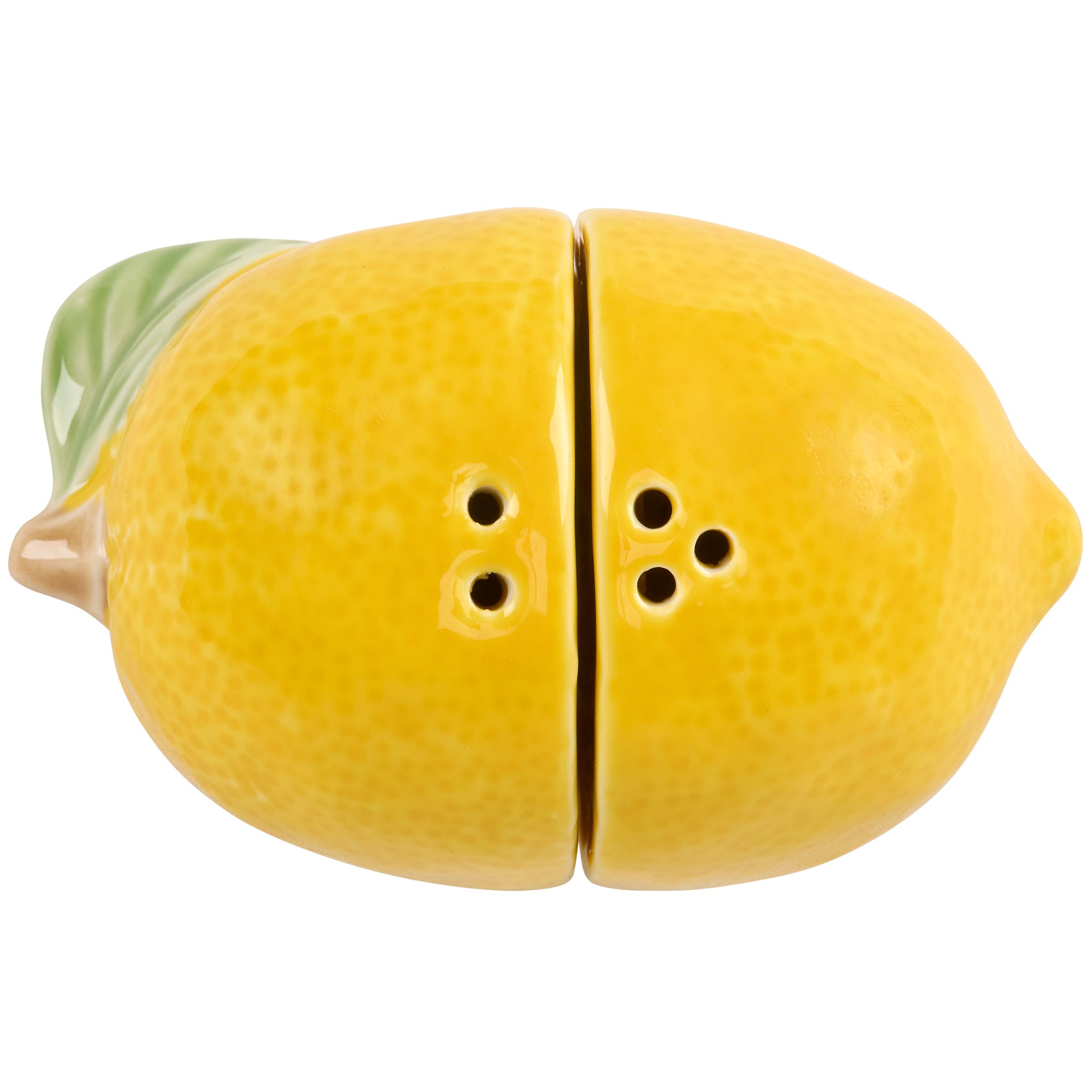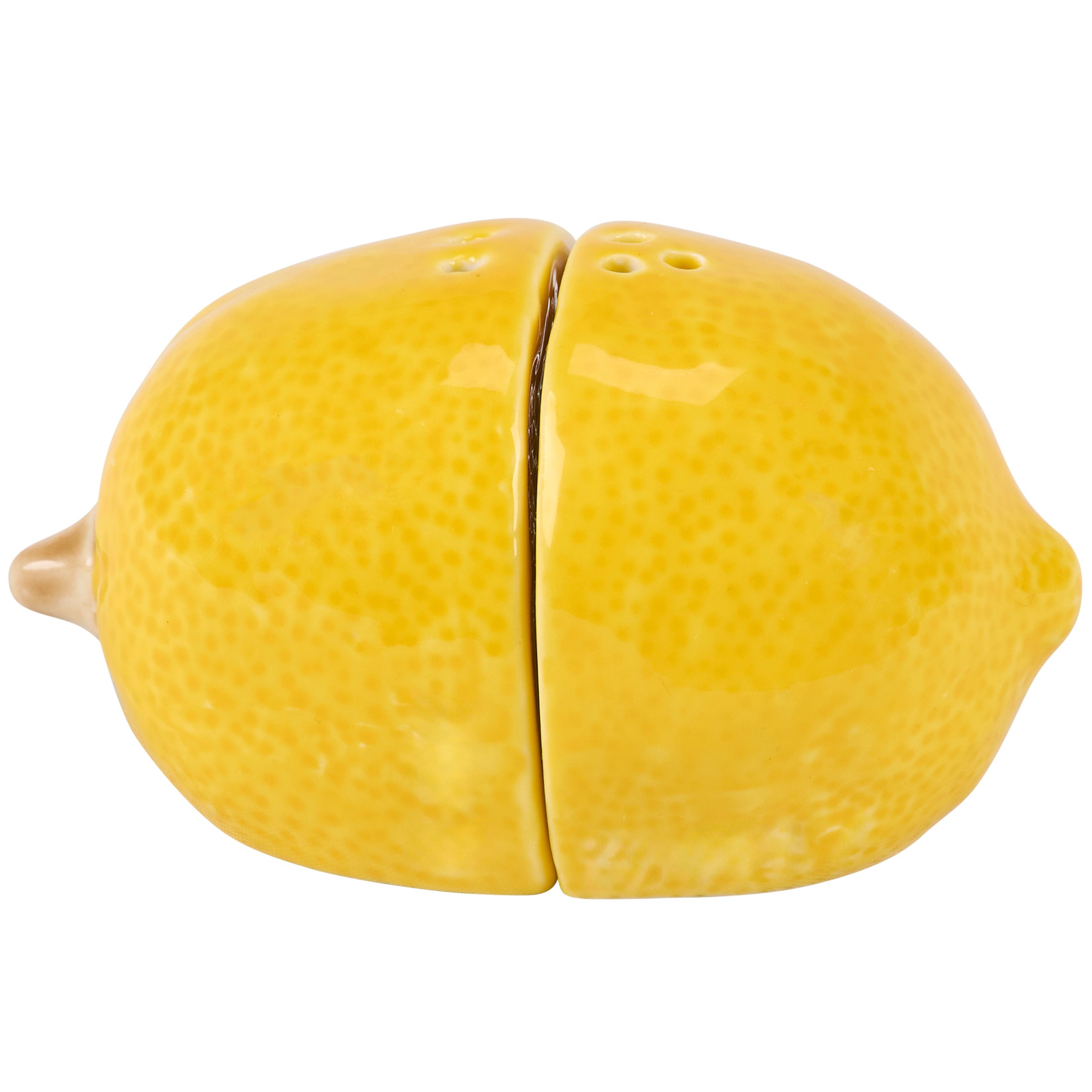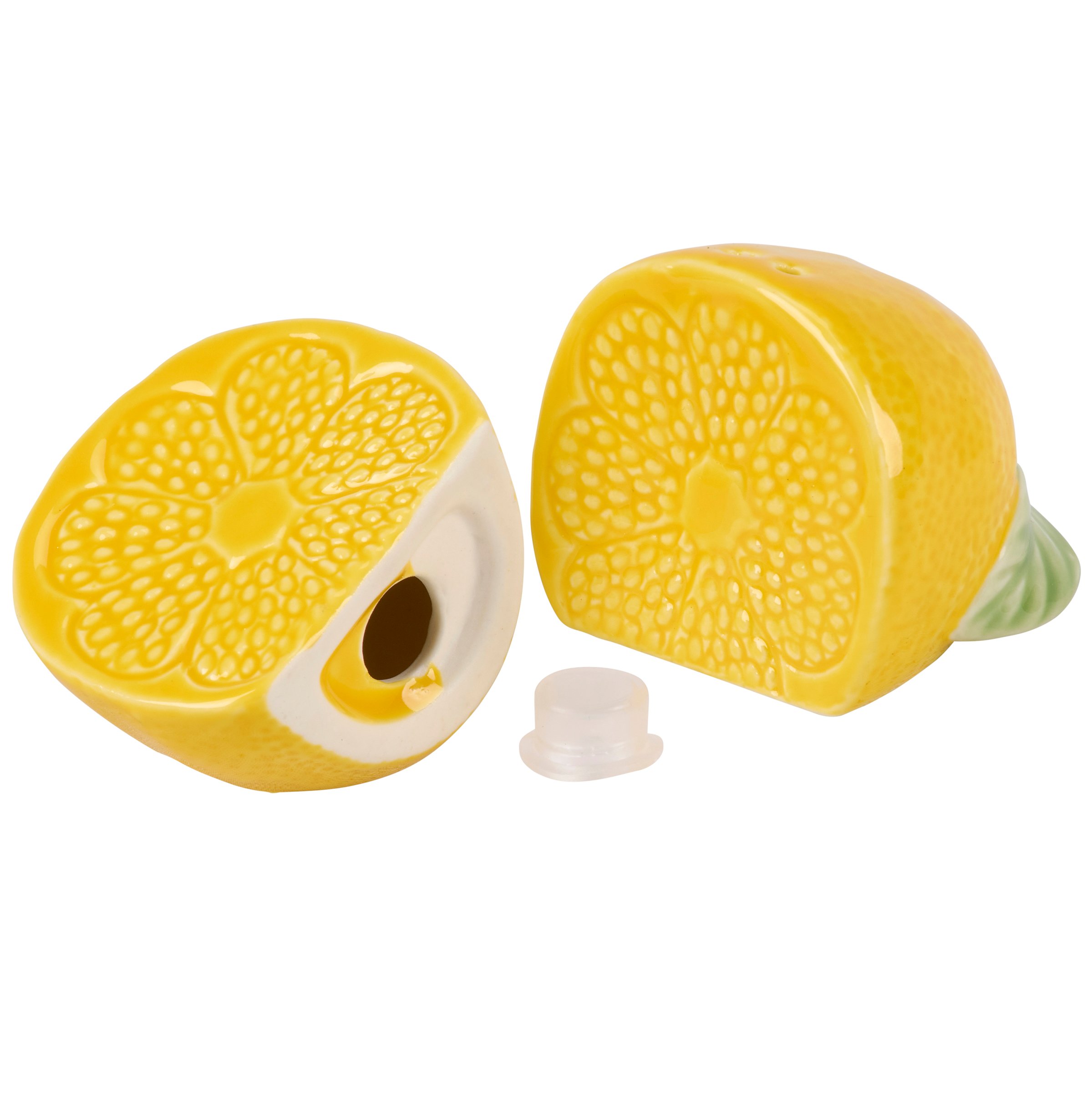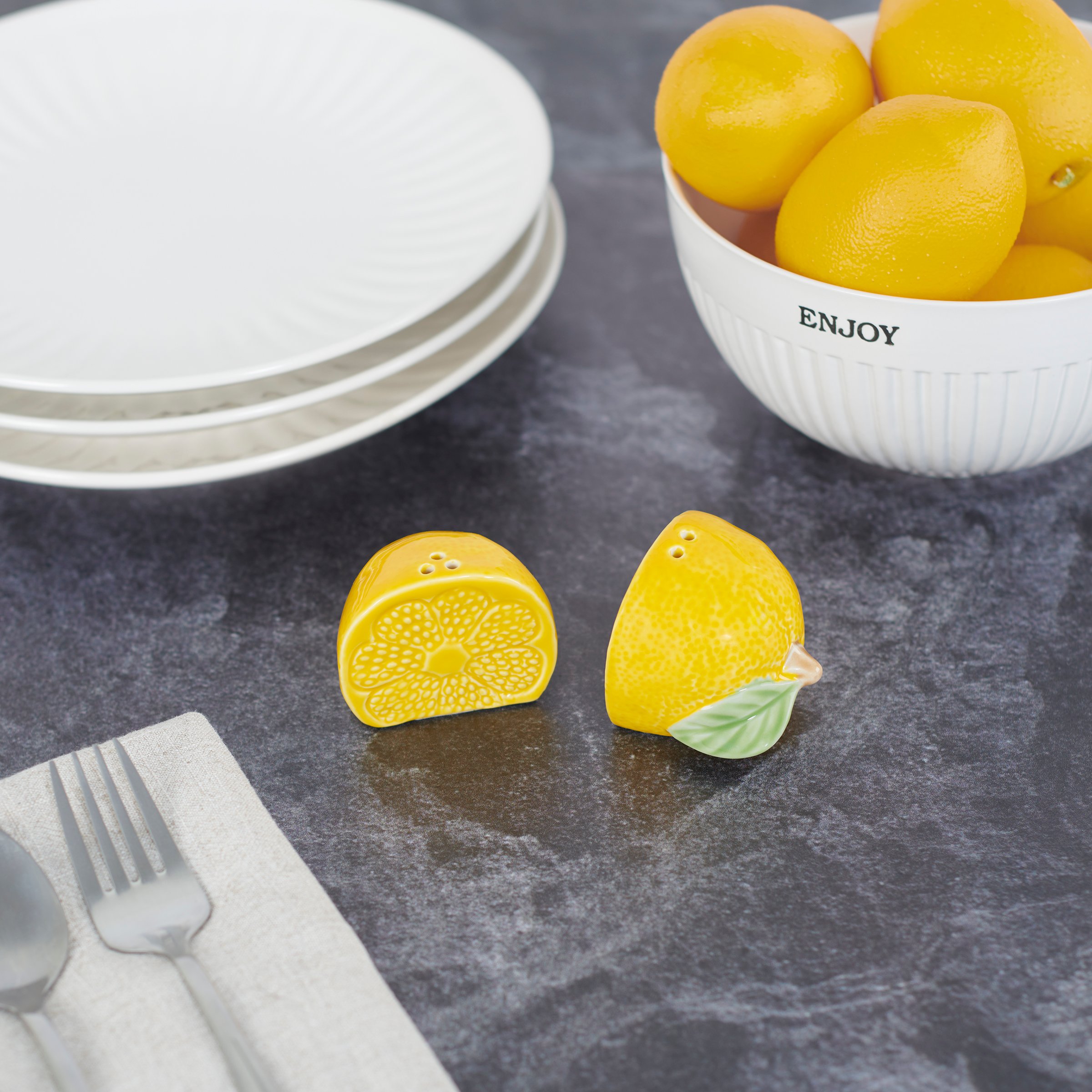 A set of 2 ceramic salt and pepper shakers from our Garden Collection featuring a fun lemon inspired design with a textured glaze finish and sculpted leaf details to resemble the features of a lemon. Each shaker is shaped like one half of a lemon with unique openings to tell them apart but also coordinates to create the full lemon design. Our Lemon salt and pepper shakers include plastic stoppers for easy refilling and cleaning. Hand wash only. A fun garden-themed set of tabletop accessories perfect for everyday tablescapes.