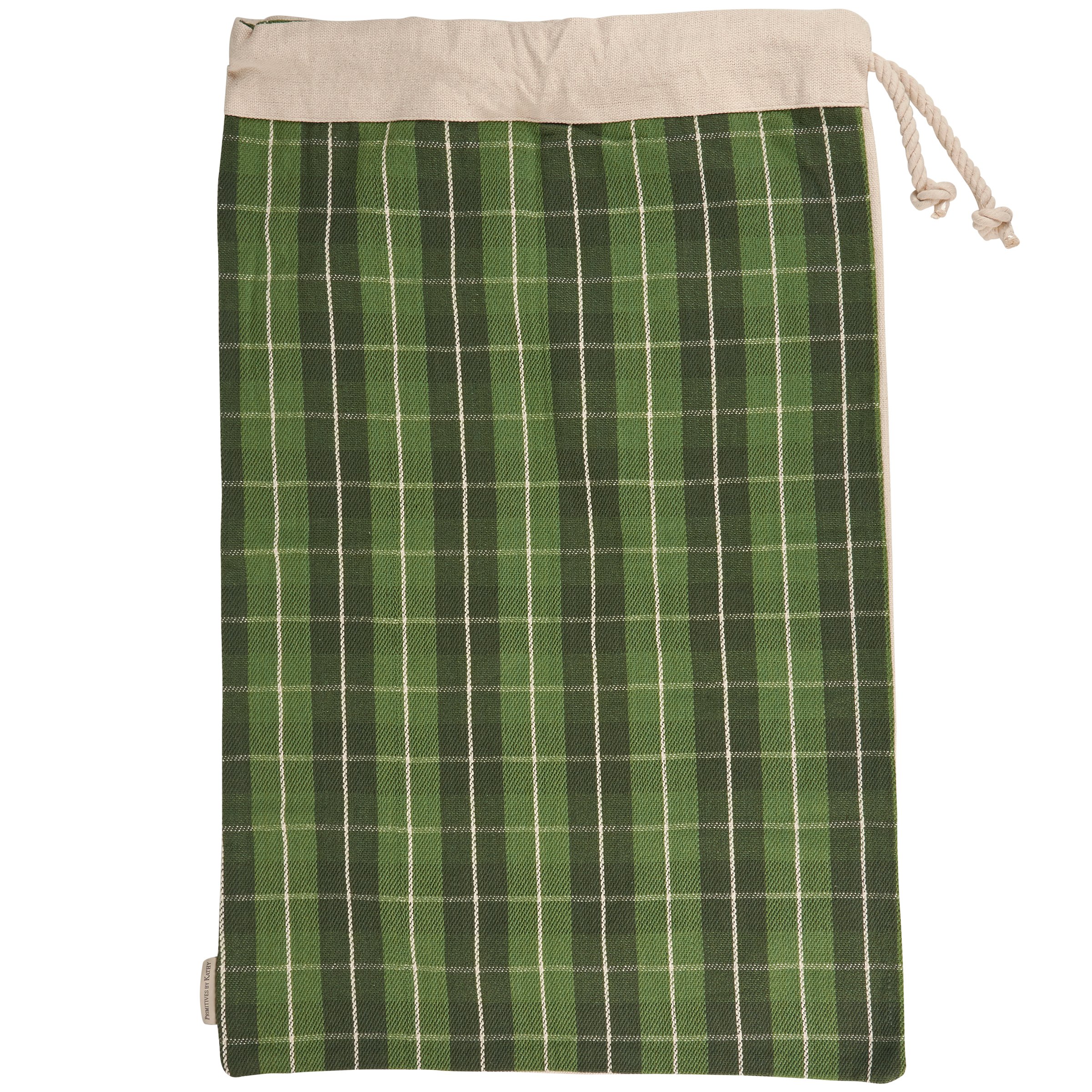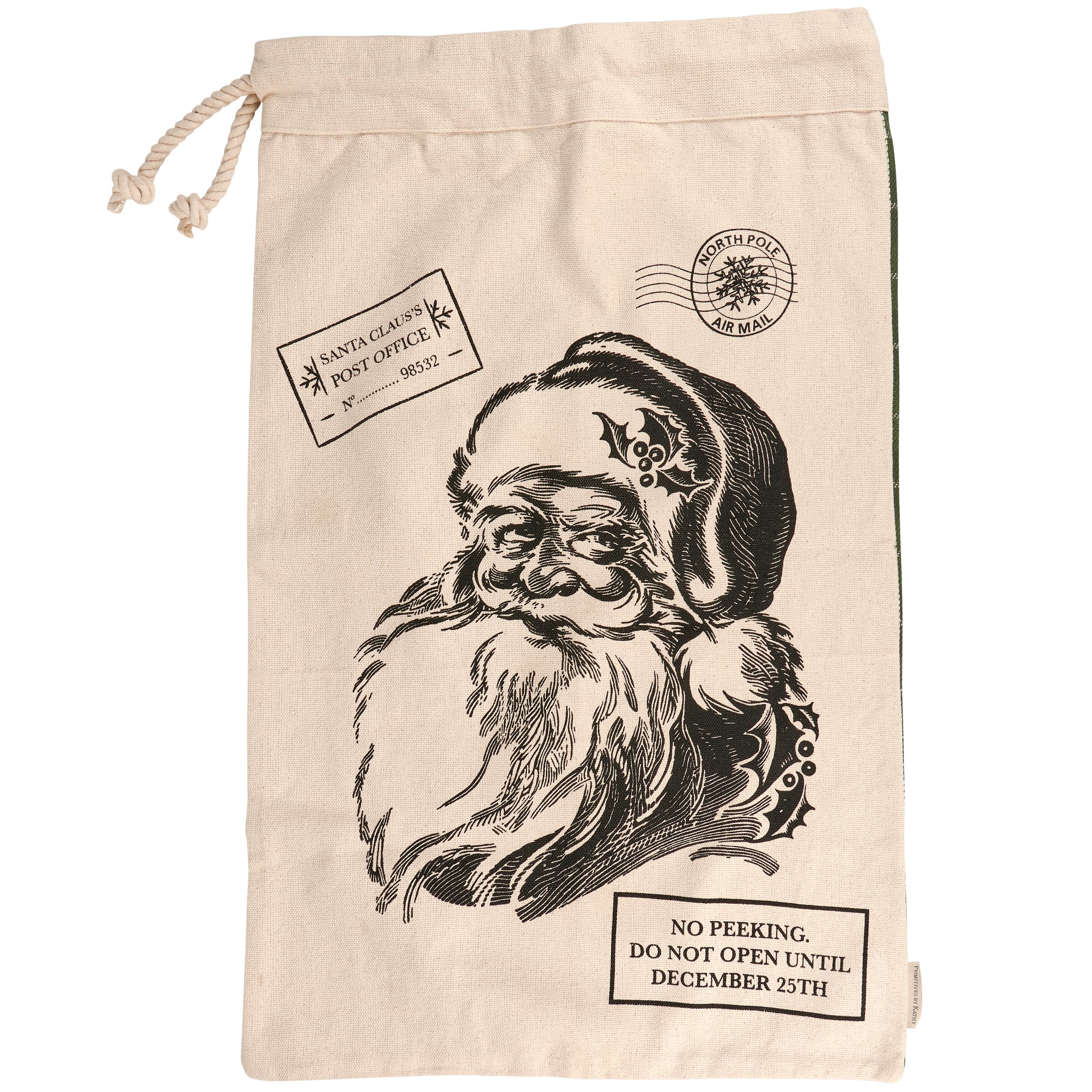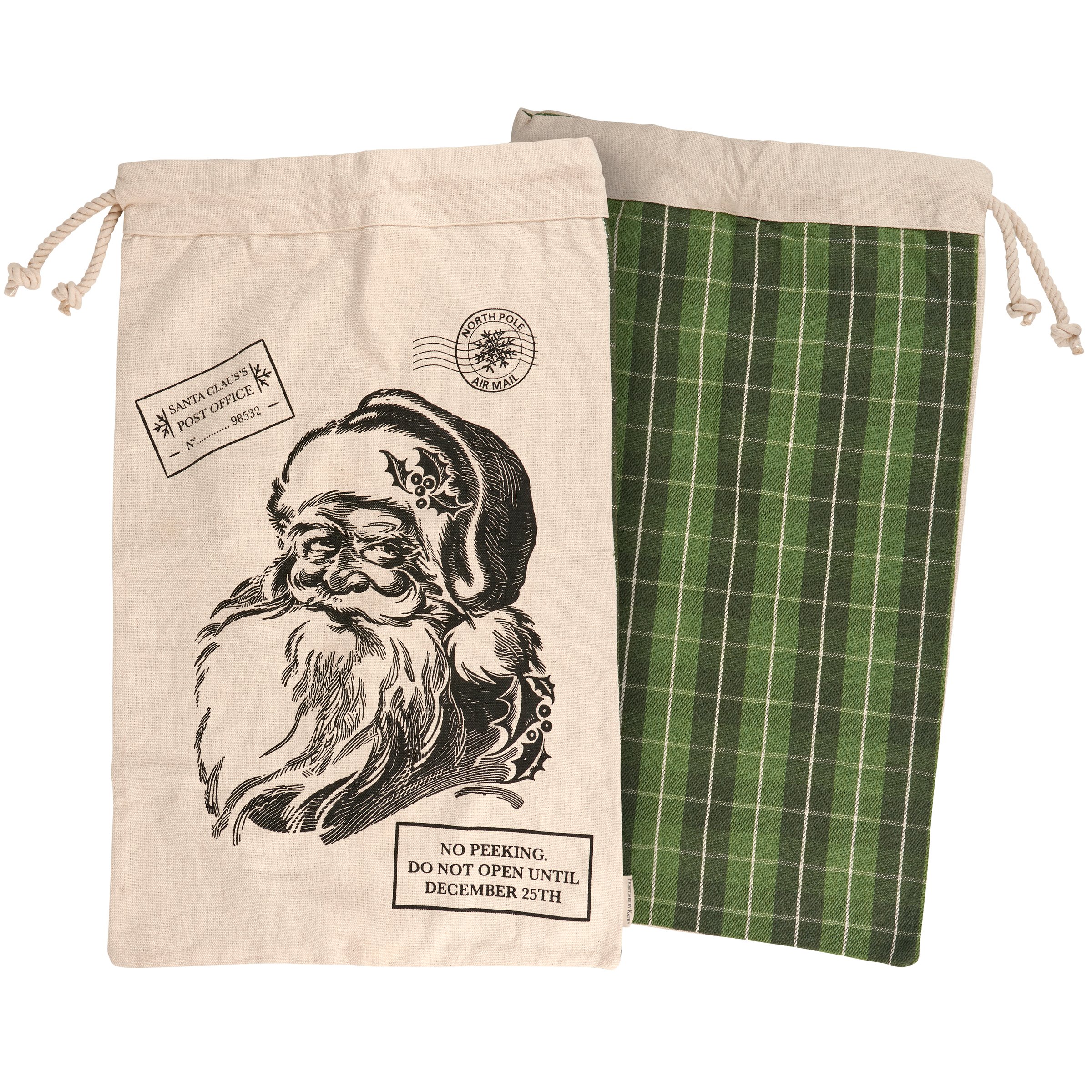 A double-sided cotton Santa sack from our Christmas Collection designed to resemble an air mail bag from the North Pole with vintage Santa design and fun gift-themed sentiment that reads "No Peeking. Do Not Open Until December 25th." Santa sack features coordinating holiday green tartan on the back. Our North Pole Air Mail Santa sack includes a rope closure to secure items inside. Accessories pictured not included. A fun gifting accessory with vintage style.