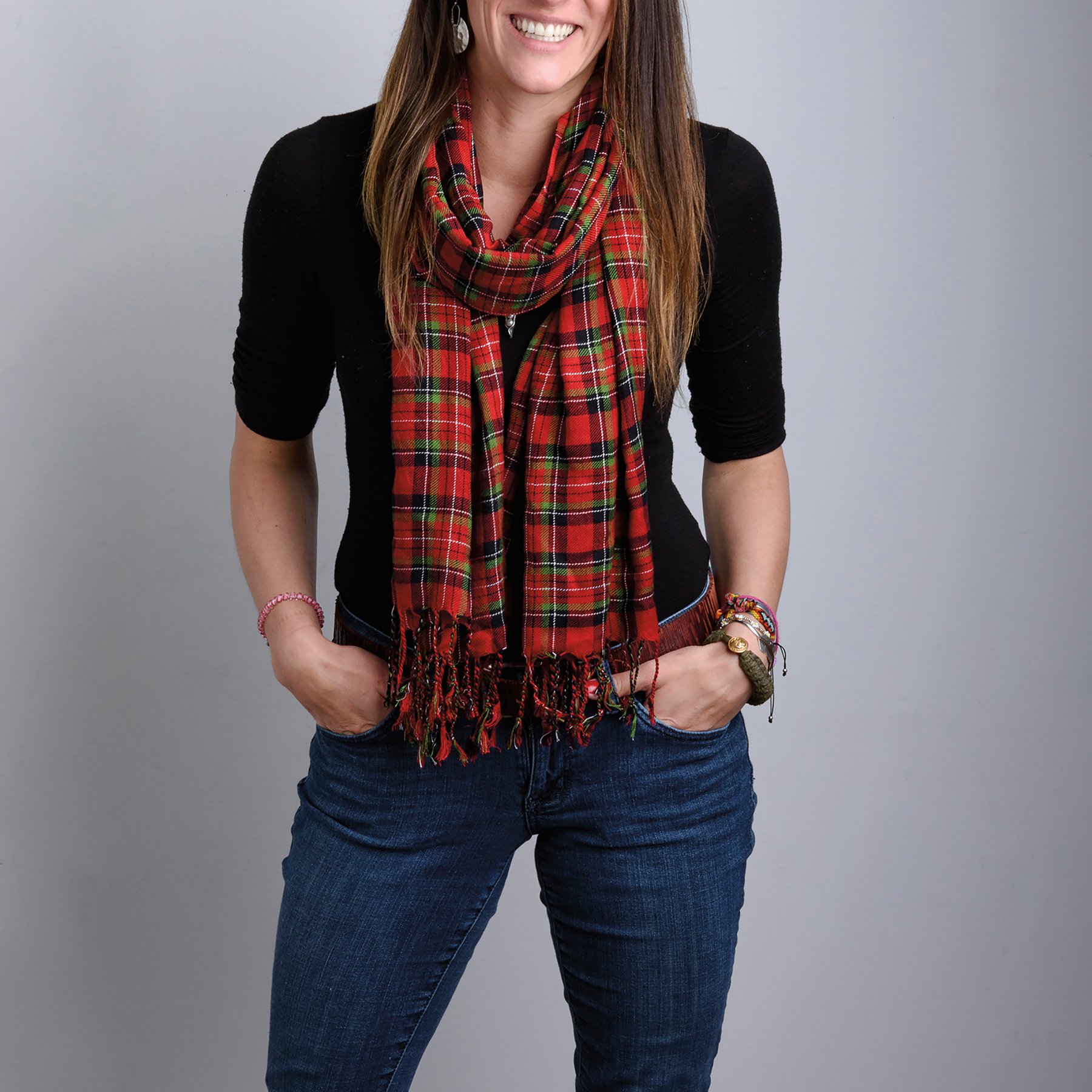This unisex woven scarf features an all-over red & black plaid design and tassel accents for added interest. Dry clean only. Neatly packaged on a cardboard hanger with a hole to easily hang on rack. Scarf pairs well with coordinating pet bow ties and bandanas so pet parents and their fur babies can have a sweet matching moment.