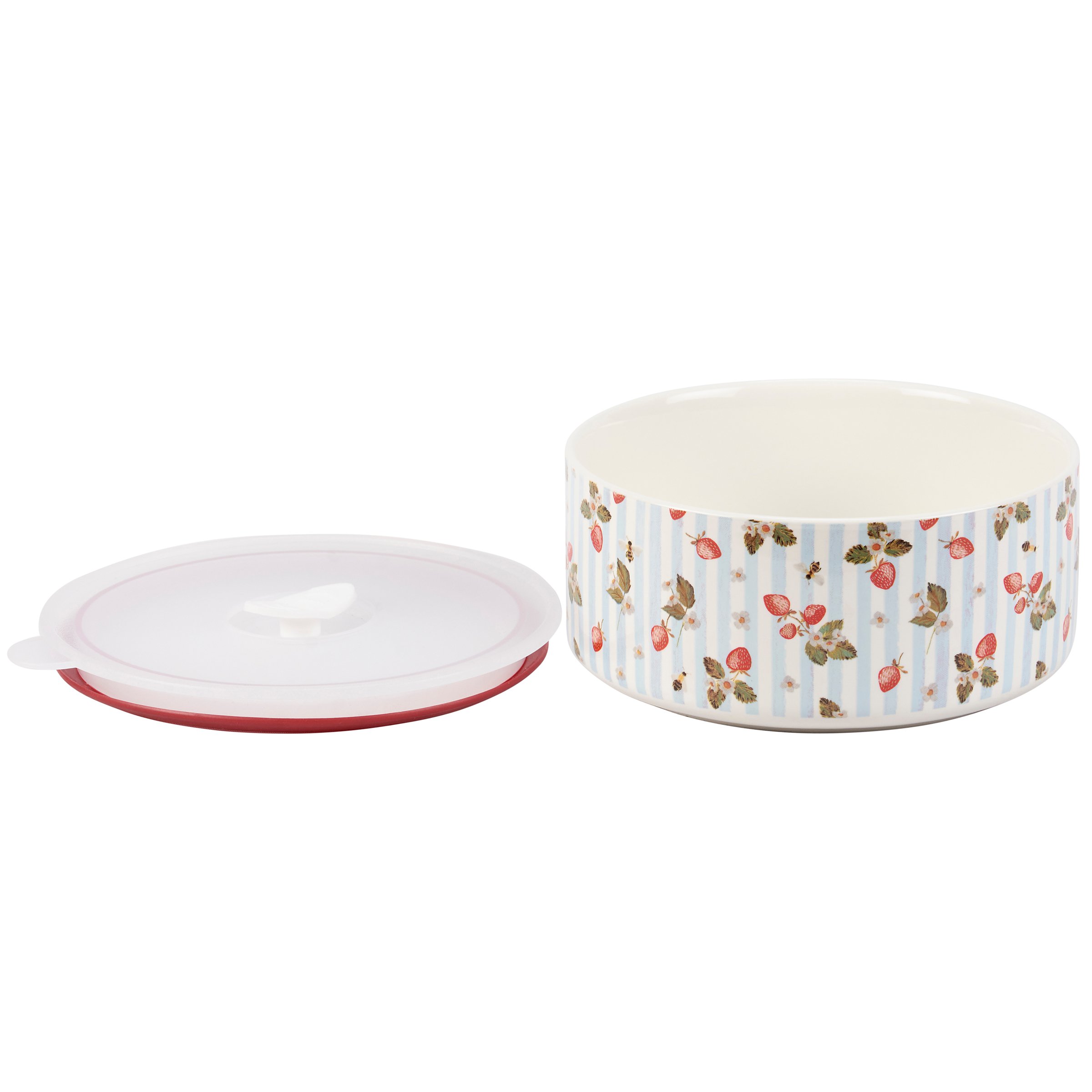 A set of ceramic serveware from our Garden Collection displaying wild strawberry inspired patterns replicated from original hand pained artwork in a unique watercolor style. Set includes 3 servers in different sizes with plastic lids that feature a convenient venting lid. Our Strawberry server set is microwave, oven, dishwasher, and food safe for easy use. A charming strawberry-themed set of serveware perfect for everyday use.
