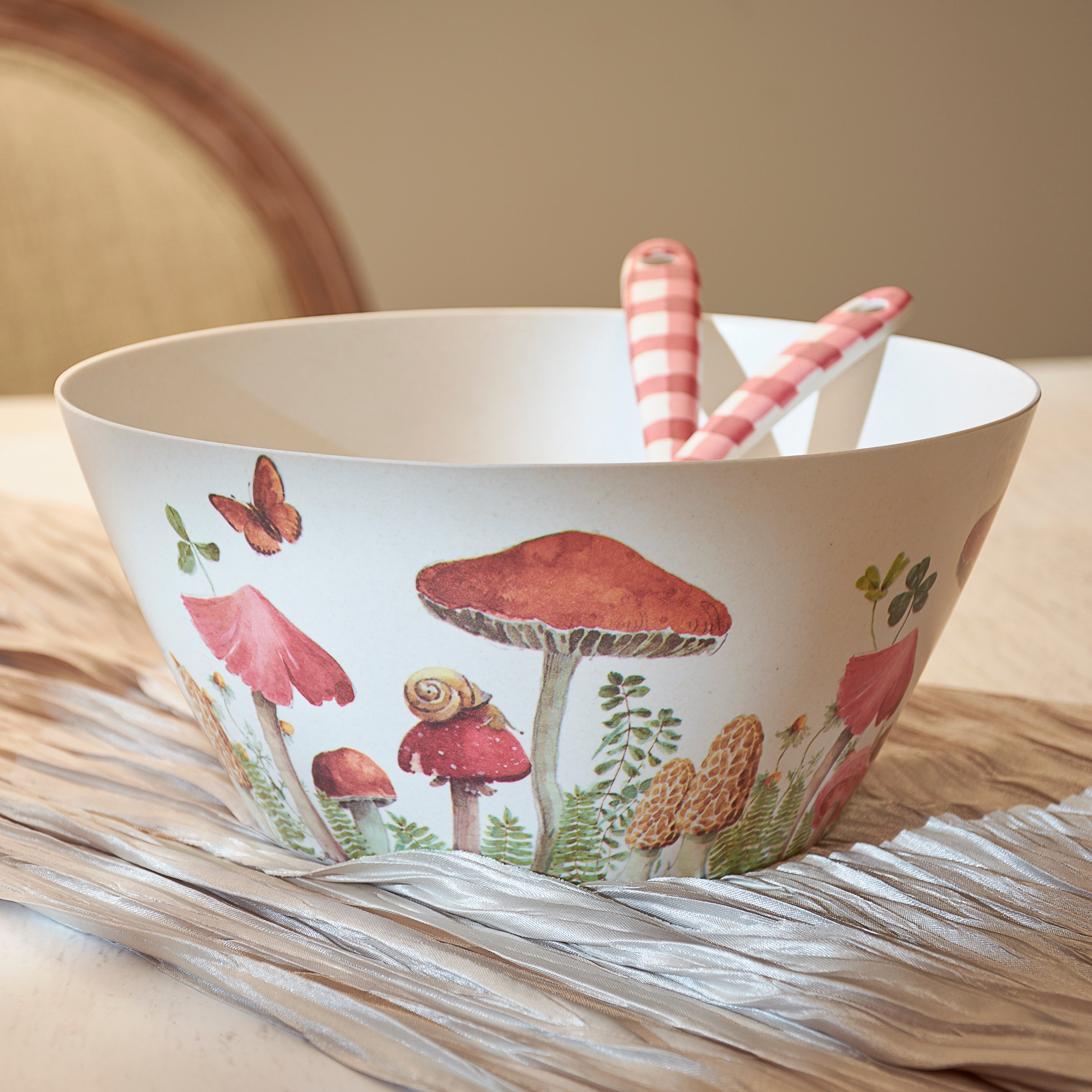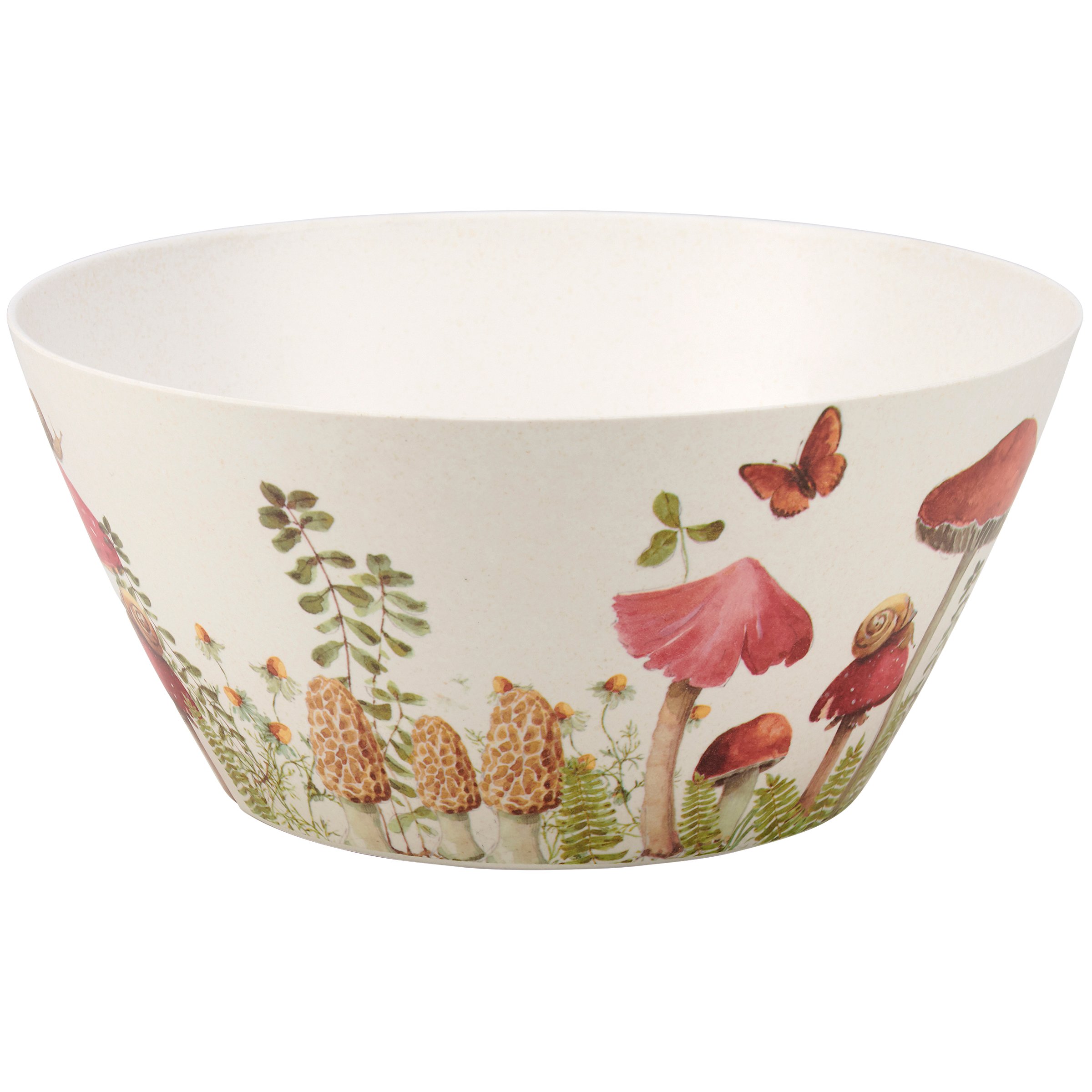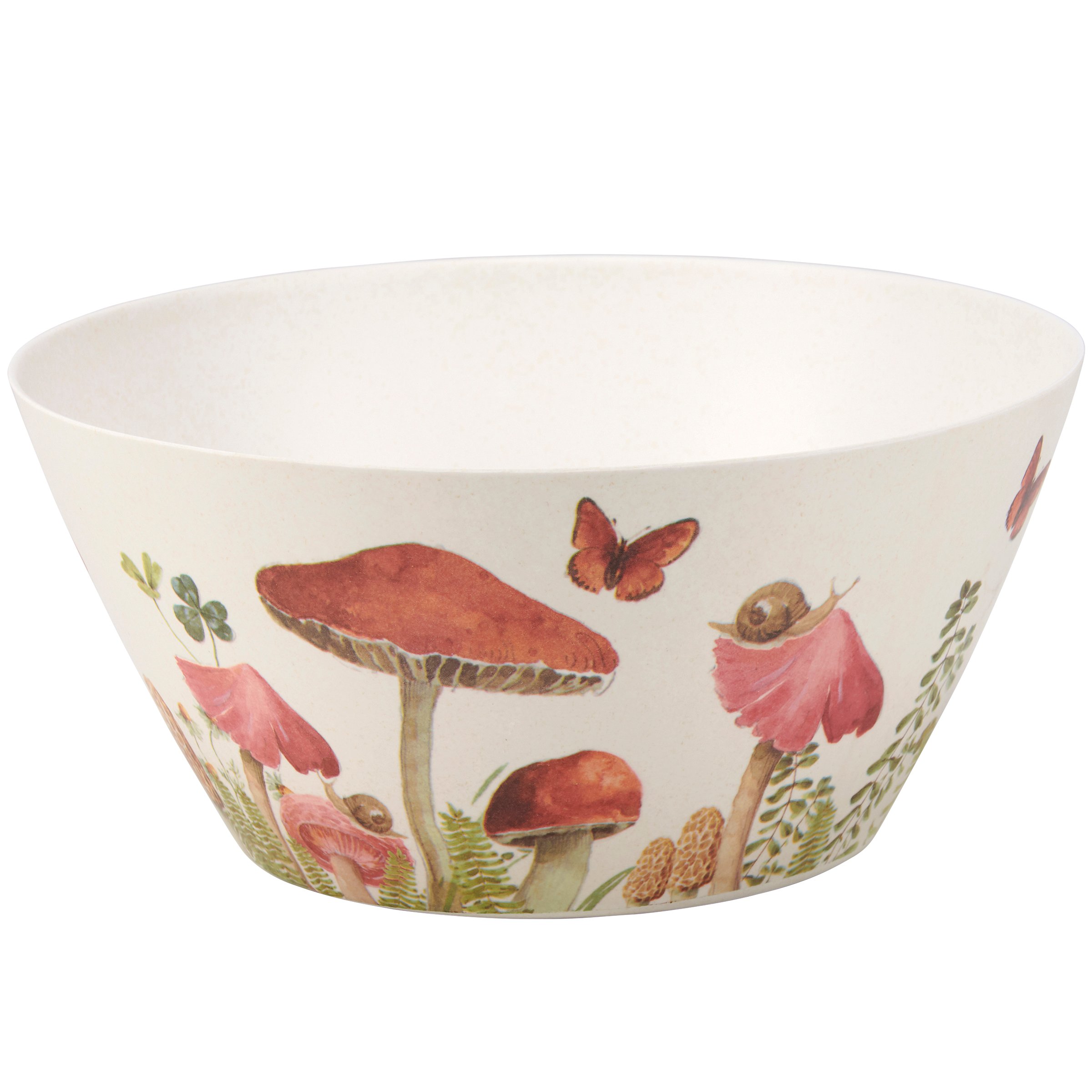 A bamboo serving bowl from our Cottagecore Collection displaying a hand painted design of mushrooms, snails, and butterflies along the outside. Our Mushroom Study serving bowl is dishwasher safe for convenient cleaning; made with bamboo fiber, melamine, and corn powder. Do not microwave. A piece of rustic tableware perfect for everyday gatherings.