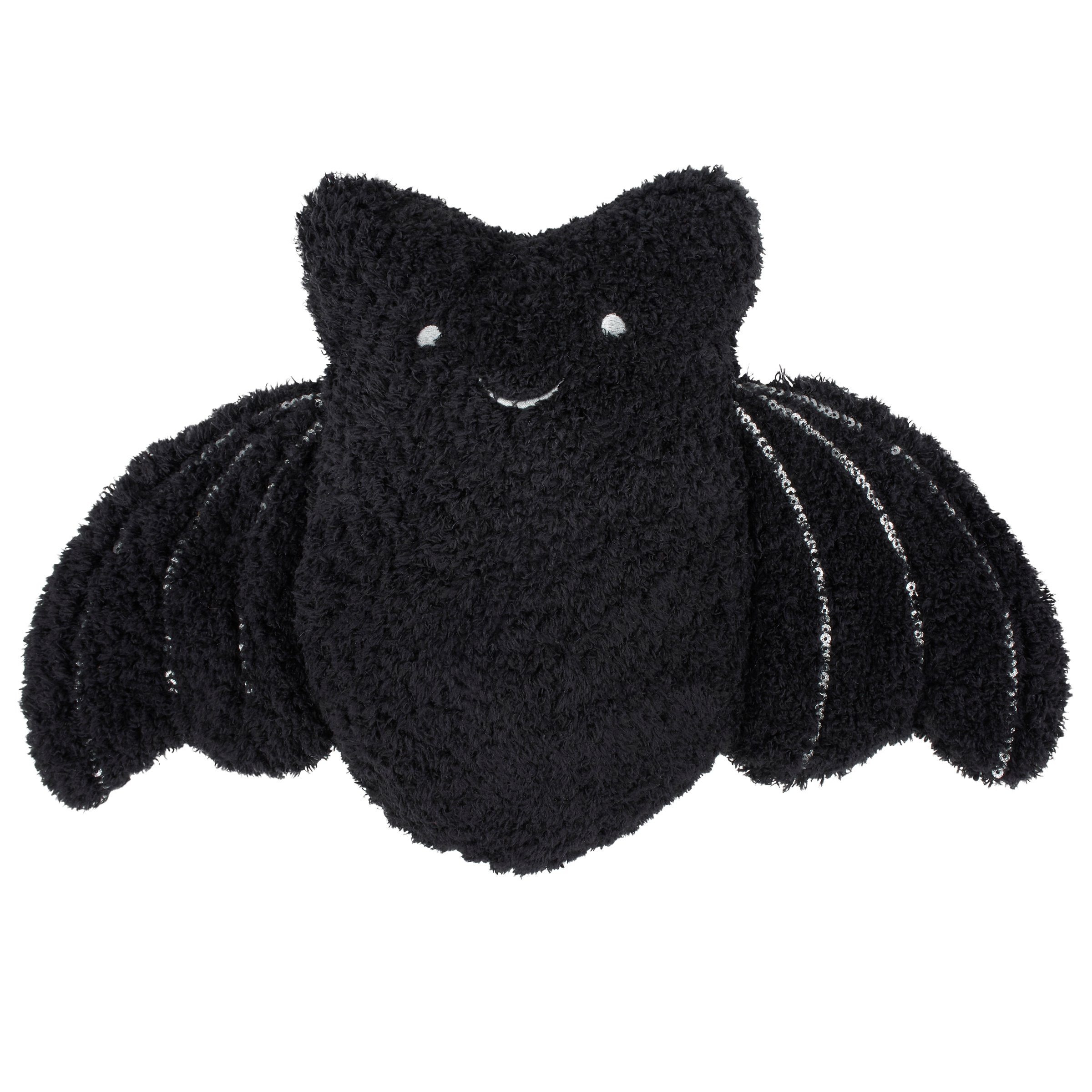 A decorative pillow from our Halloween Collection in the shape of a cute black bat character. Our Bat shaped pillow features a plush texture to create the look and feel of bat fur with embroidered face and wing details. This Halloween shaped pillow contains polyester filling and is for decorative use only; not a toy. A fun Halloween home accent perfect for adding seasonal style to any space.