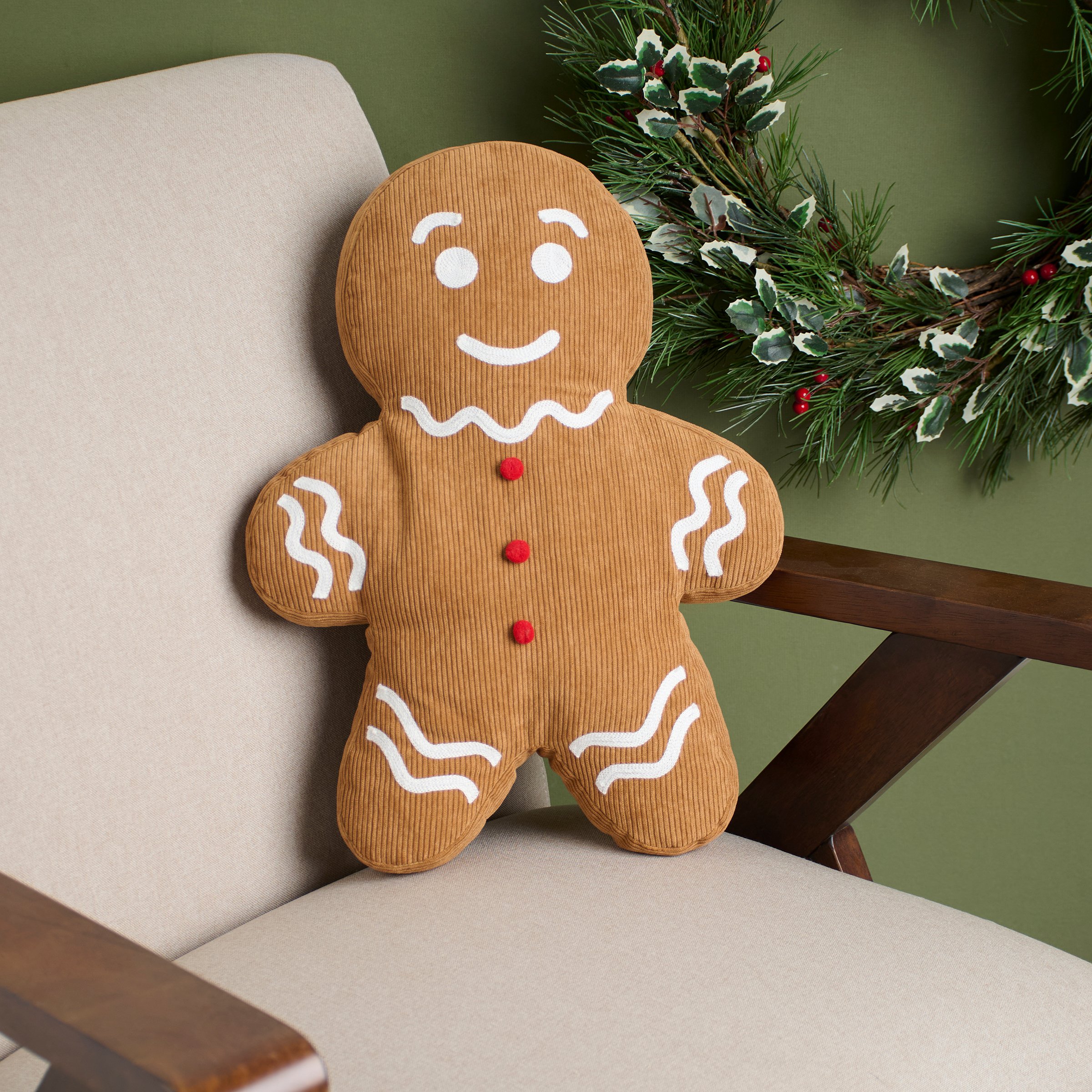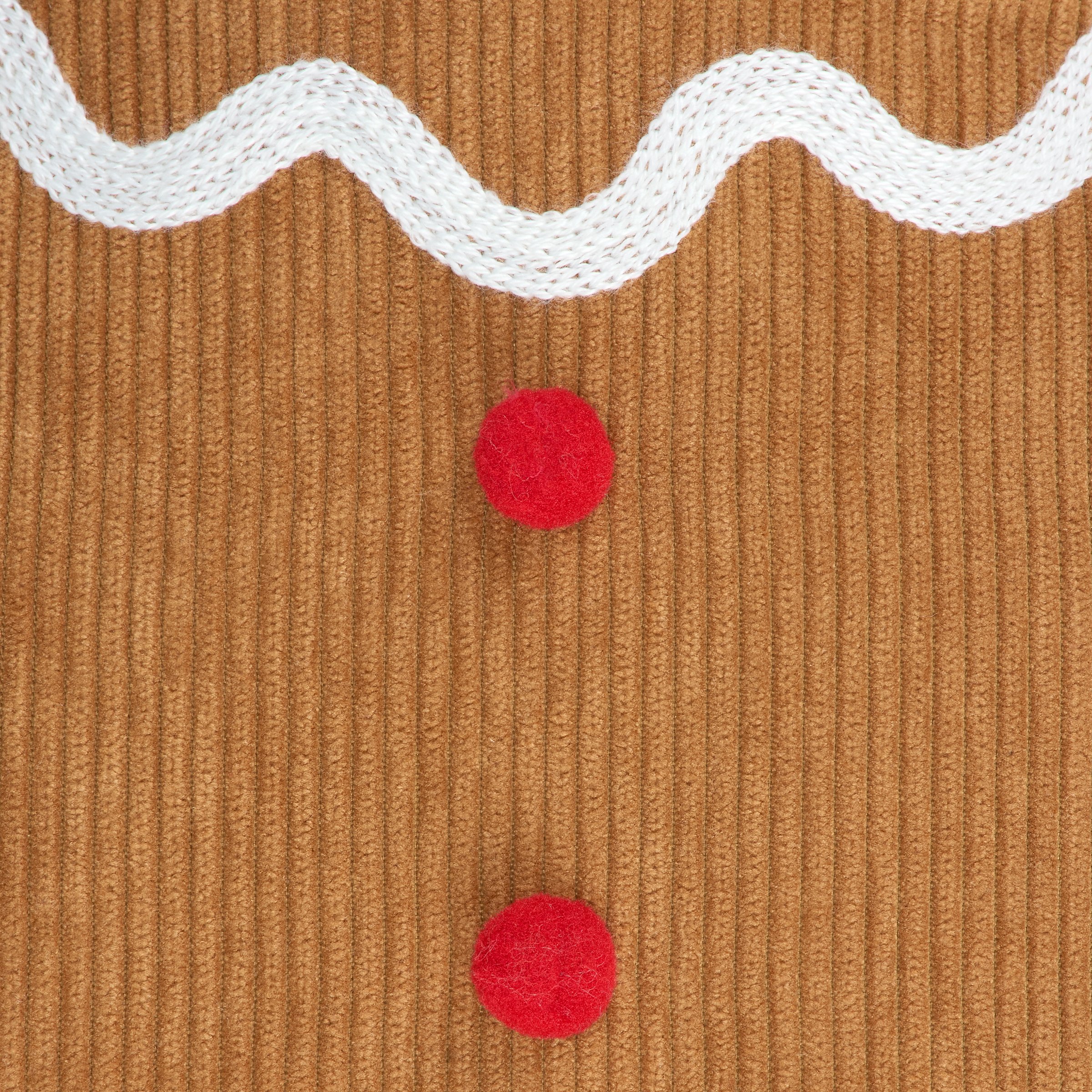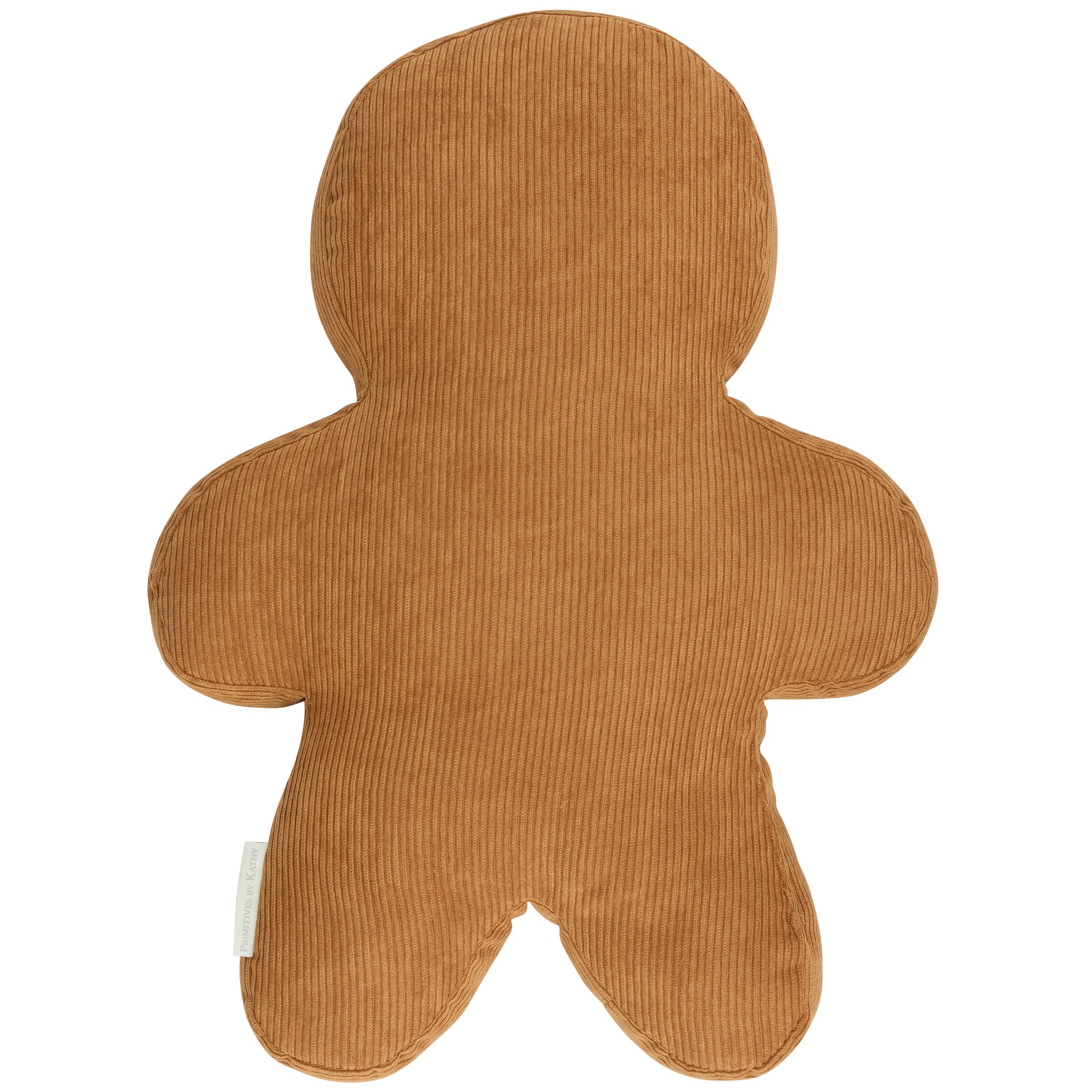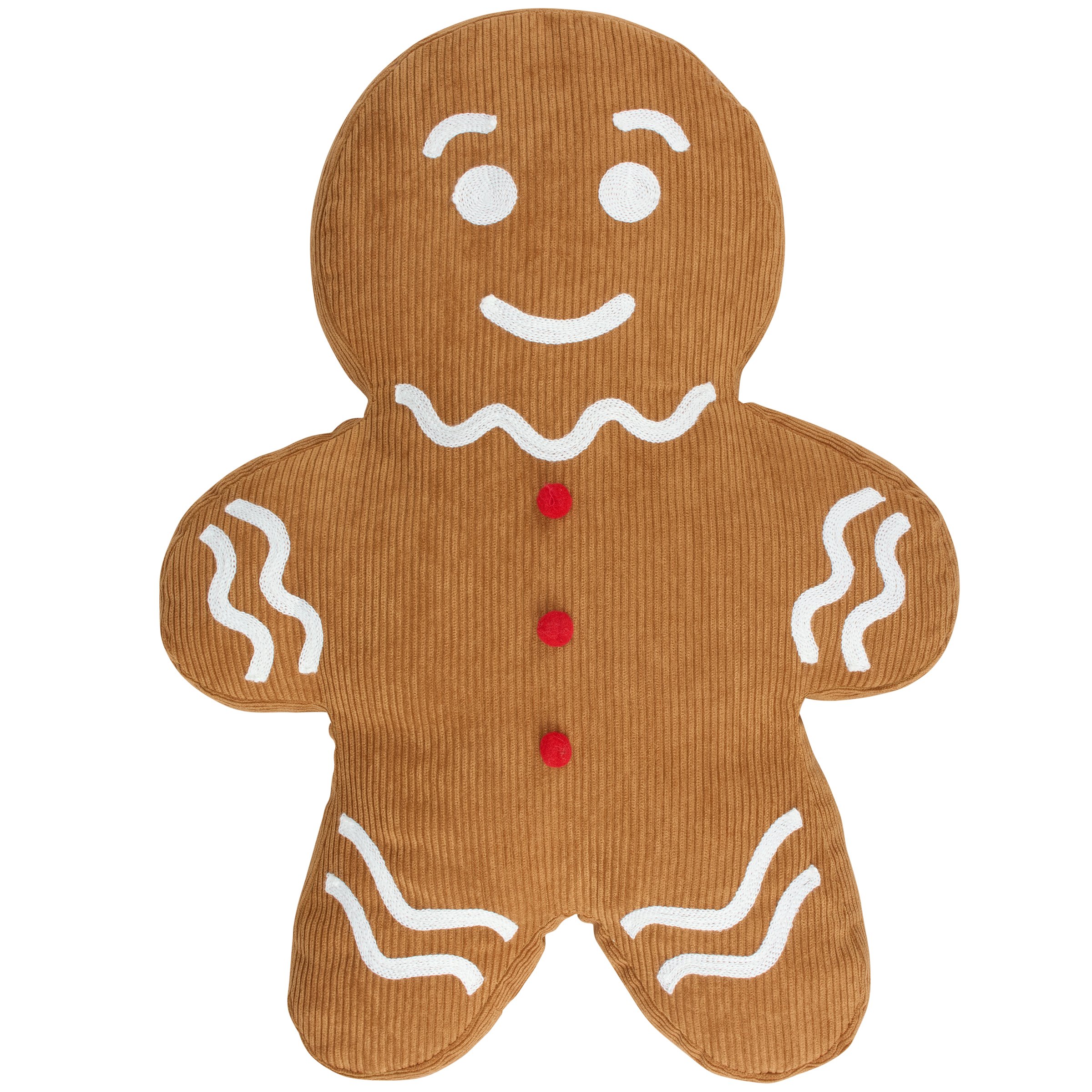 A decorative pillow from our Christmas Collection in the shape of a gingerbread man featuring a textured corduroy material with white embroidery to create the look and feel of a gingerbread cookie with icing detail. Our Gingerbread shaped pillow contains polyester filling and is for decorative use only; not a toy. A fun gingerbread themed home accent perfect for adding seasonal style to any space.