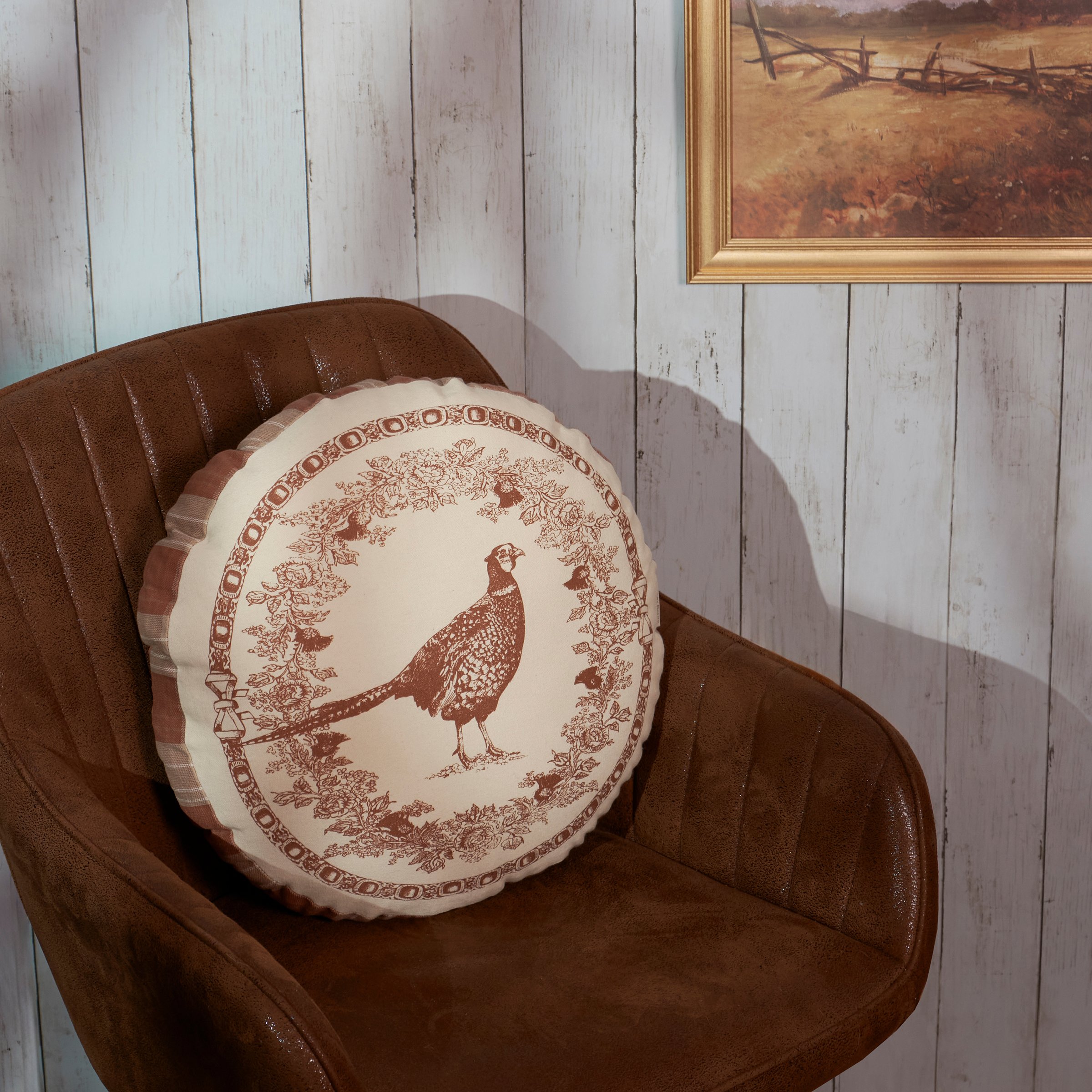 A decorative pillow from our Vintage Collection displaying a round shape and vintage pheasant design inspired by old world décor. Design features coordinating brown tartan on the gusset and brown velvet on the back. Our Pheasant pillow contains polyester filling and is shipped vacuum-sealed for protection and storage. Pillow includes zipper to remove and clean cover. A rustic home accent perfect for everyday use.