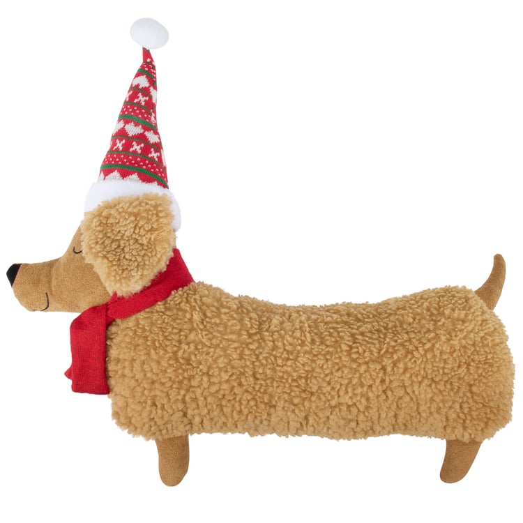 A decorative pillow from our Holiday Collection in the shape of a dachshund with winter hat and scarf. Our Winter Dachshund shaped pillow features a plush texture to create the look and feel of dog fur with embroidered face details. This pet Christmas shaped pillow contains polyester filling and is for decorative use only; not a toy. A fun pet themed home accent perfect for adding seasonal style to any space.