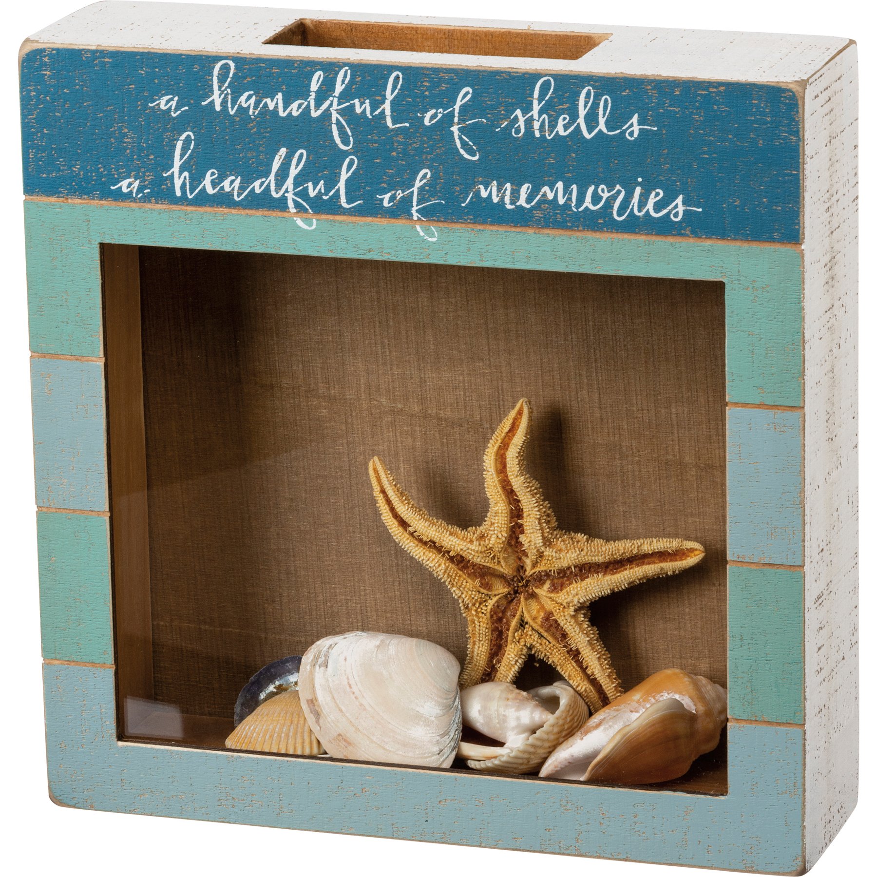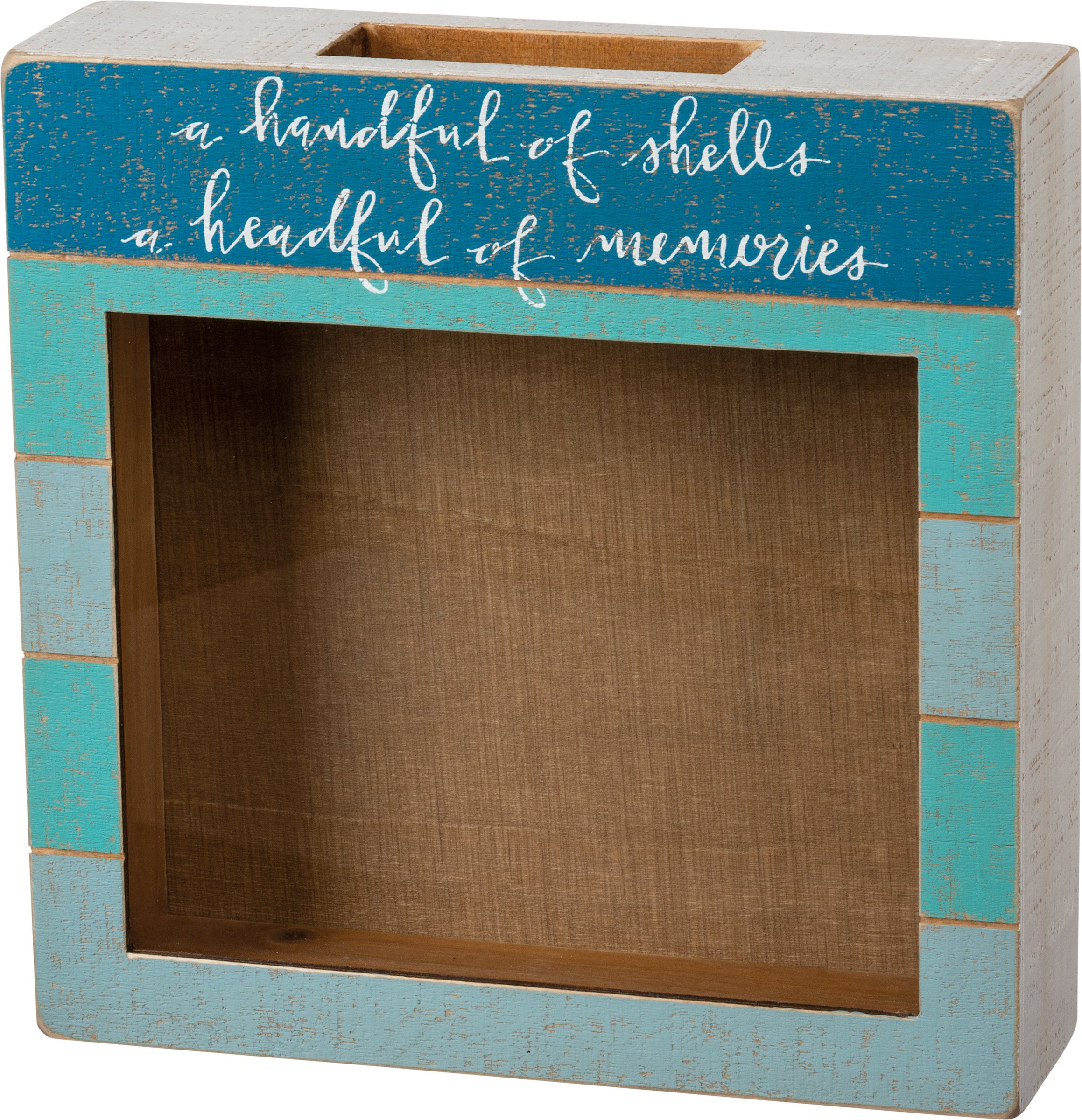 A slat wood color block shell holder with beachy blue hues and a hand lettered "A Handful Of Shells A Headful Of Memories" sentiment. Features a top cutout to accept shells and other beach treasures, clear glass window, and distressed wood sides. Complements well with other pieces in collection to create a cohesive beach-inspired collection.