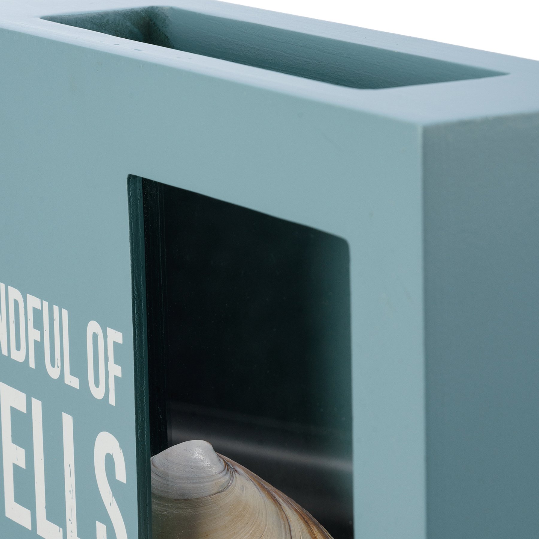 A slat wood Handful Of Shells seashell holder from our Beach Collection features a box sign style distressed "A Handful Of Shells And A Headful Of Memories" sentiment, clear glass window, blue color palette, and a top cutout to accept shells and other beach treasures.