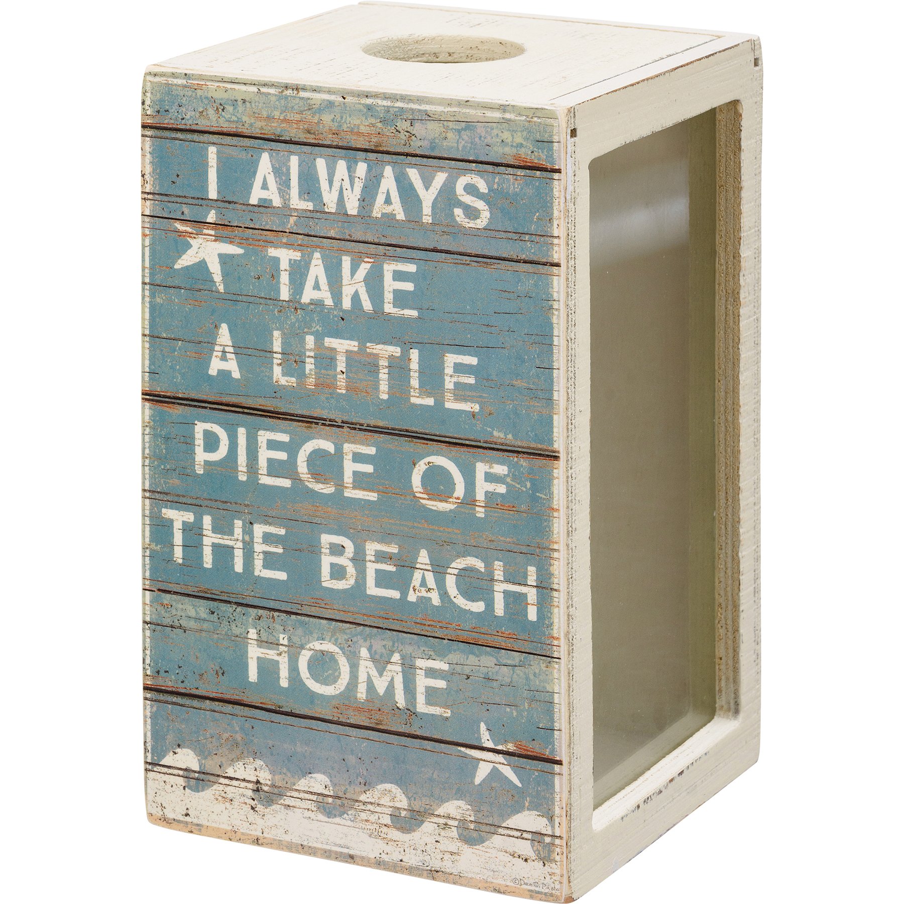 A double-sided wooden seashell holder featuring a rustic ocean design with "May You Always Have A Shell In Your Pocket" and "I Always Take A Little Piece Of The Beach Home" sentiments on slat wood, side panel glass windows, and a top opening for displaying beach keepsakes.