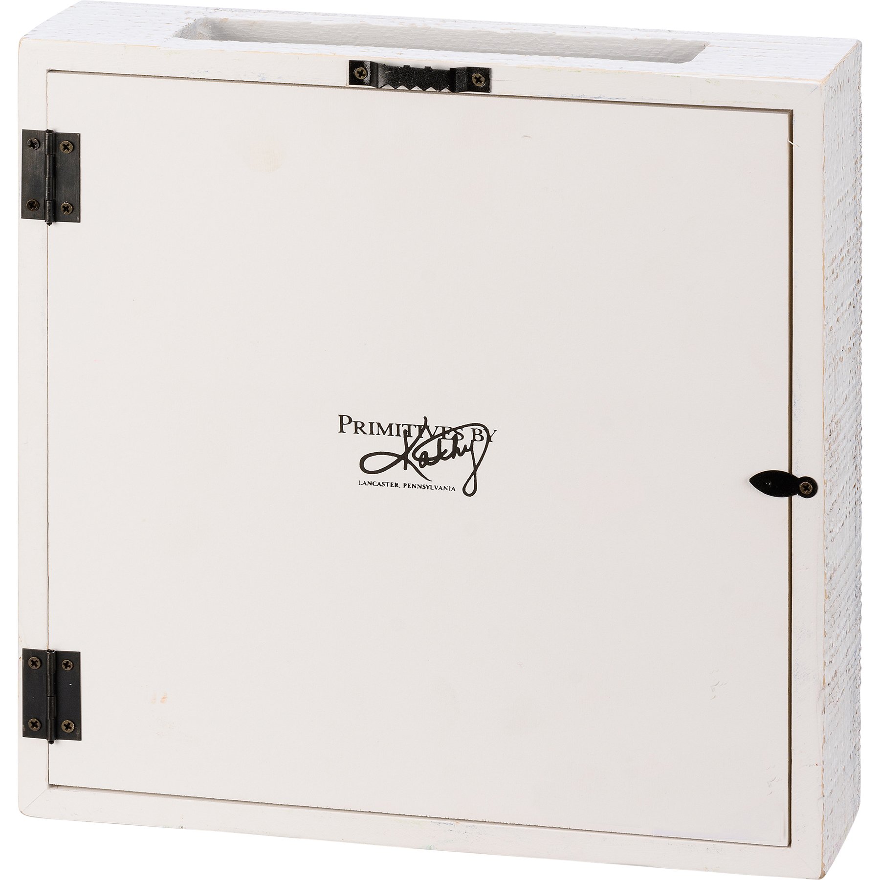 A slat wood shell holder featuring a rustic beach themed design, "I Always Take A Piece Of The Beach Home With Me" sentiment, clear glass window, and distressed white sides. Features a top cutout to accept shells and other beach treasures.