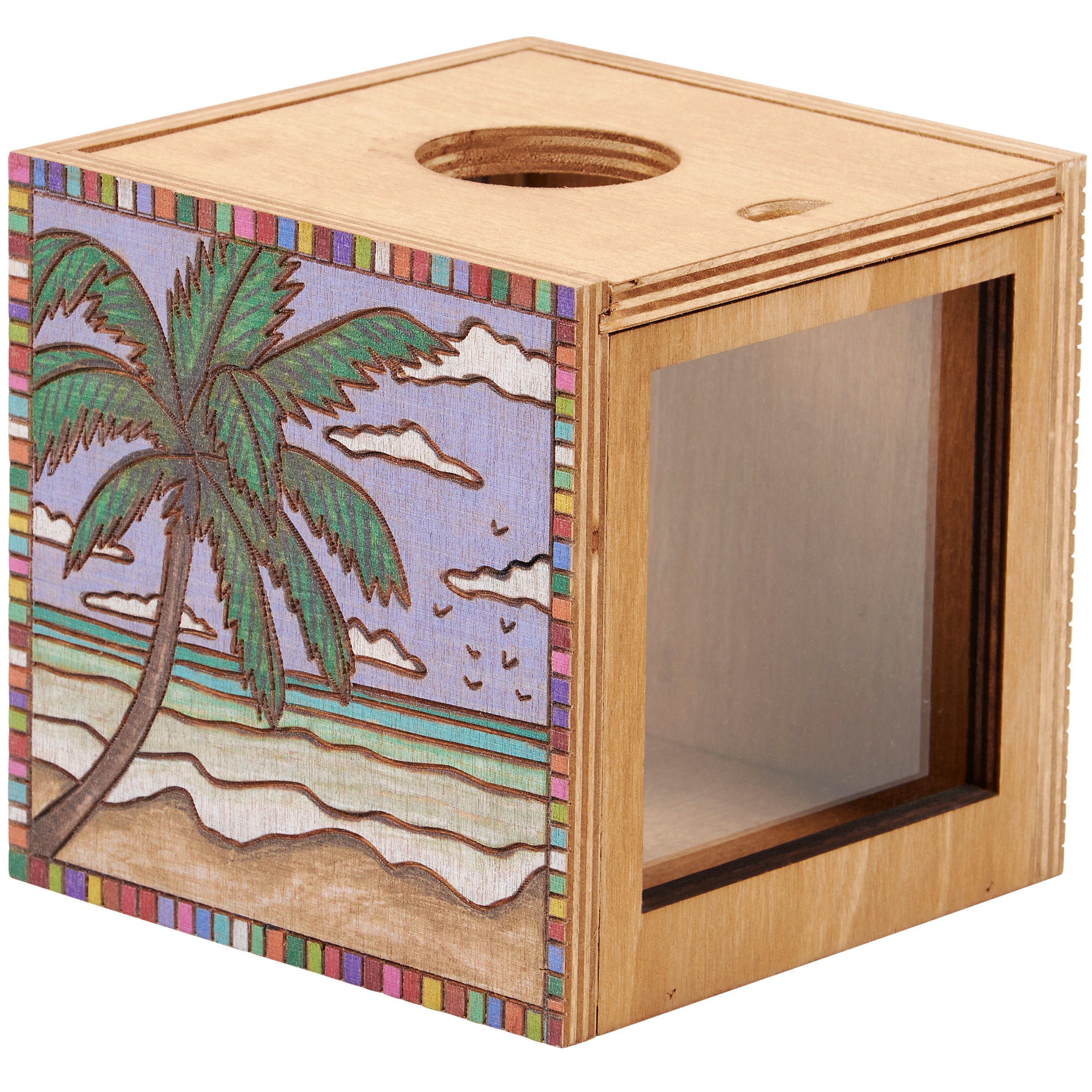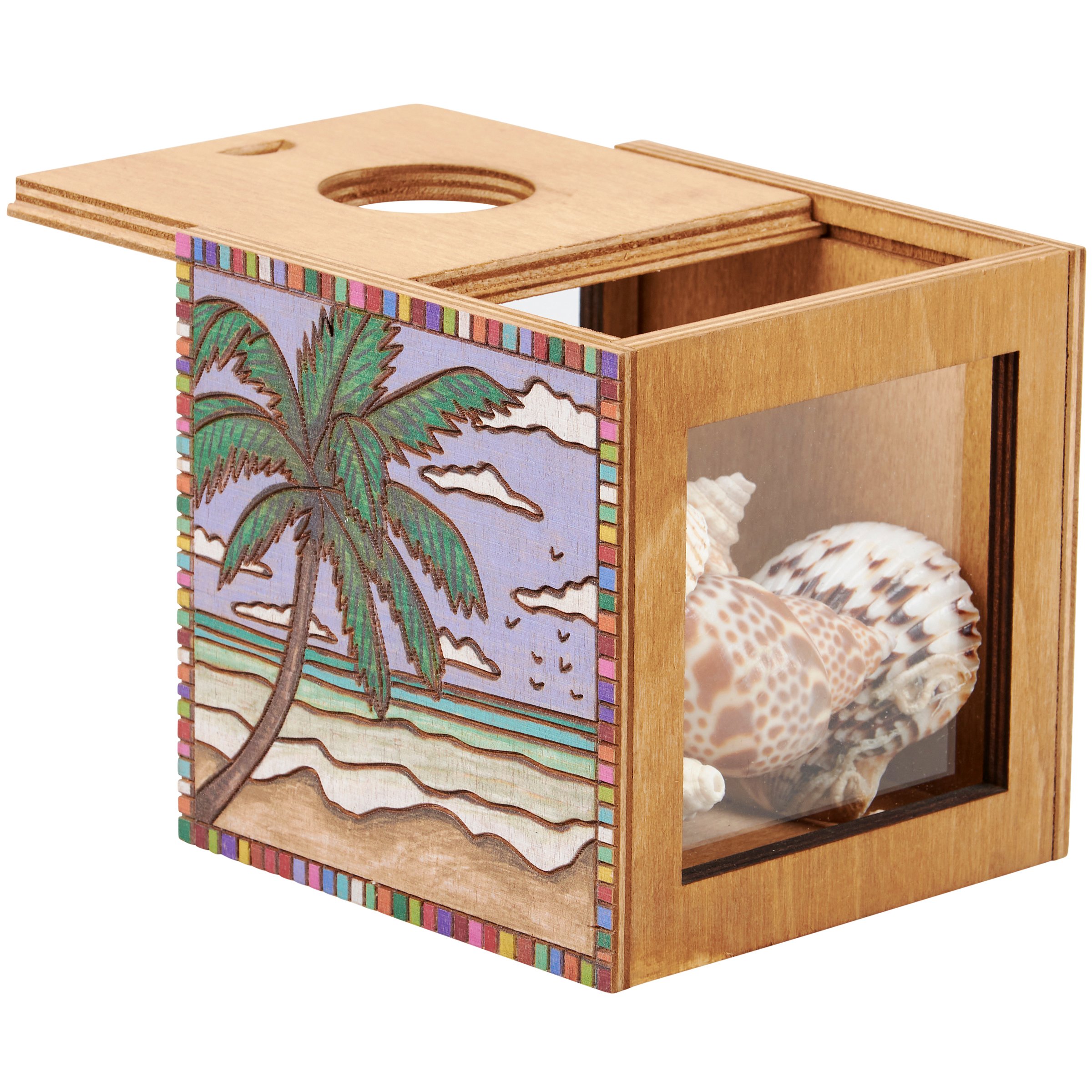 A double-sided wooden seashell holder from our Beach Collection with a vibrant hand illustrated scene of a beach and palm tree with wood burned details for added texture. Wood frame features a coordinating natural wood with distressed details. Our Palm Tree shell holder includes side panel glass windows to view keepsakes and a top opening to drop items in that also slides out to easily retrieve what is inside. A fun beach-themed gift to display keepsakes as everyday home décor.