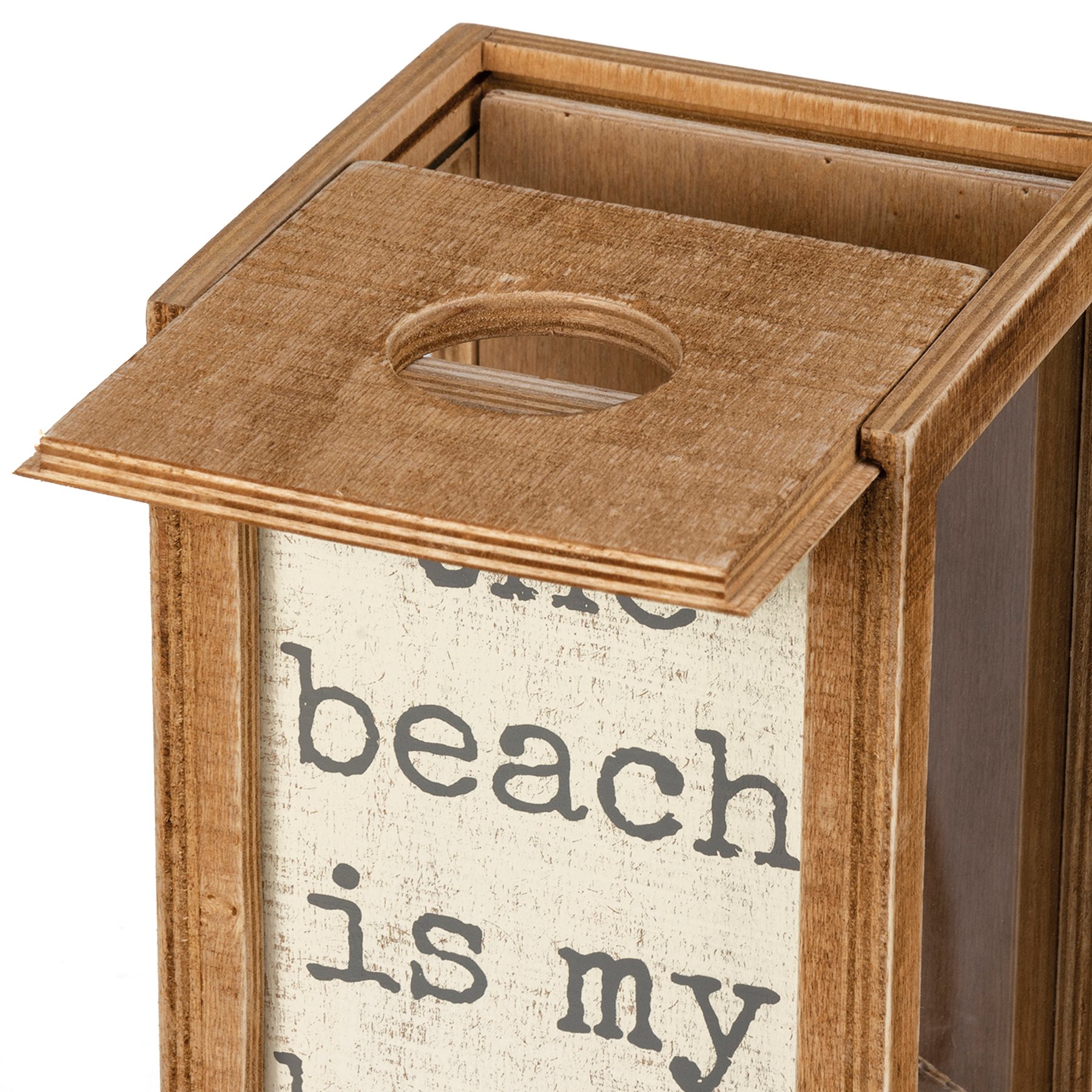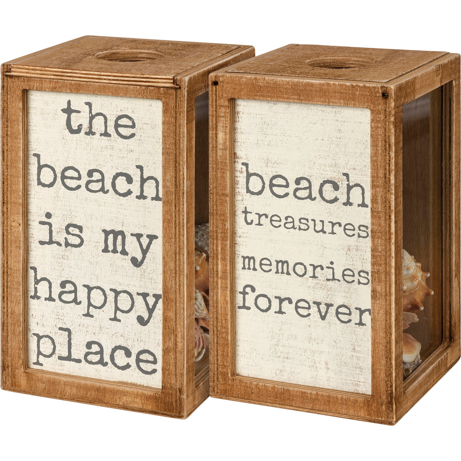 A wooden seashell holder featuring double-sided "The Beach Is My Happy Place" and "Beach Treasures Memories Forever" sentiments and rustic inset style. Includes glass window side panels and sliding lid with opening for displaying seaside keepsakes.