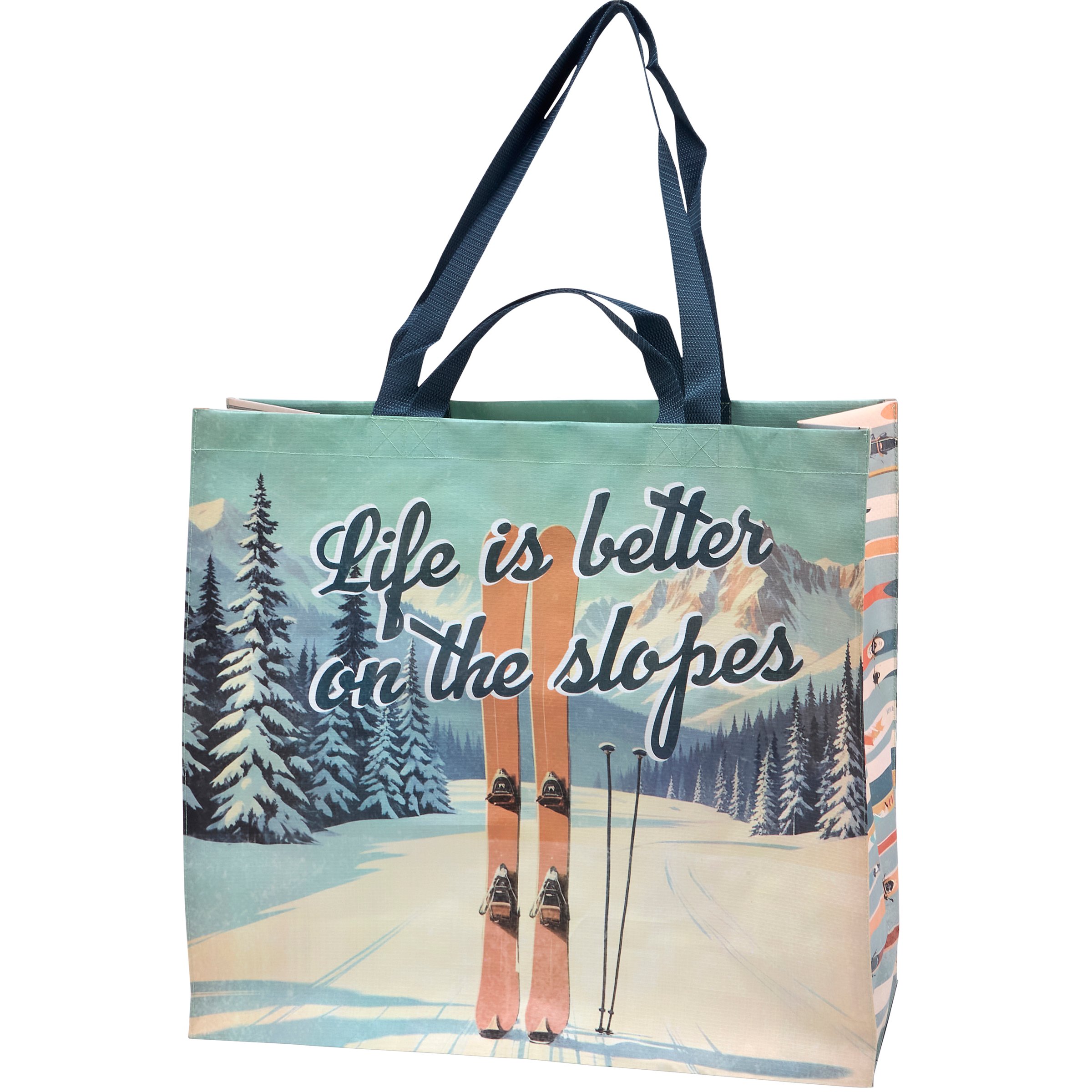 A double-sided shopping tote from our Ski Lodge Collection displaying vintage art of a pair of skis standing in the snow on a ski slope with a ski-themed sentiment that reads "Life Is Better On The Slopes." Tote gussets display coordinating skis pattern. Skiing shopping tote includes both hand and shoulder straps in blue nylon and a convenient inside pocket displaying matching sentiment. Our On The Slopes shopping tote is made from eco-friendly post-consumer material and folds flat for compact storage. A vintage ski-themed tote perfect for shopping or for reusable gift wrapping.
