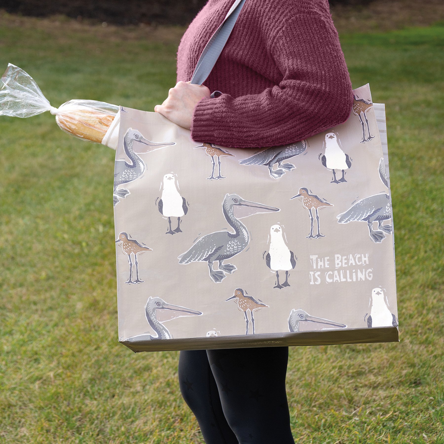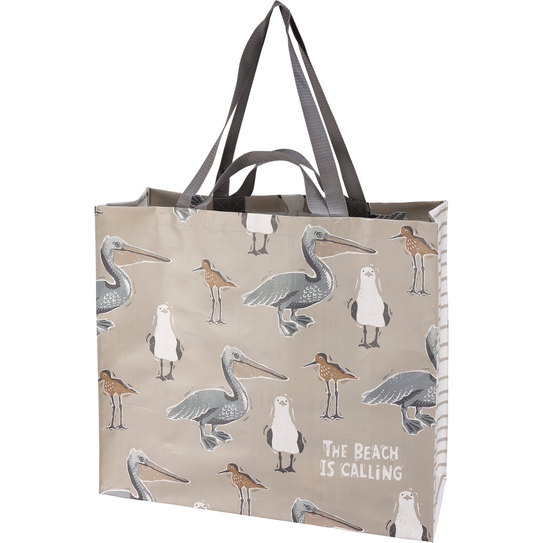 Made of post-consumer material, this double-sided shopping tote features pelican and seagull designs with "The Beach Is Calling" sentiment. Gussets feature coordinating design. Our The Beach shopping tote contains an interior pocket and dual nylon hand and shoulder straps for easy carrying.