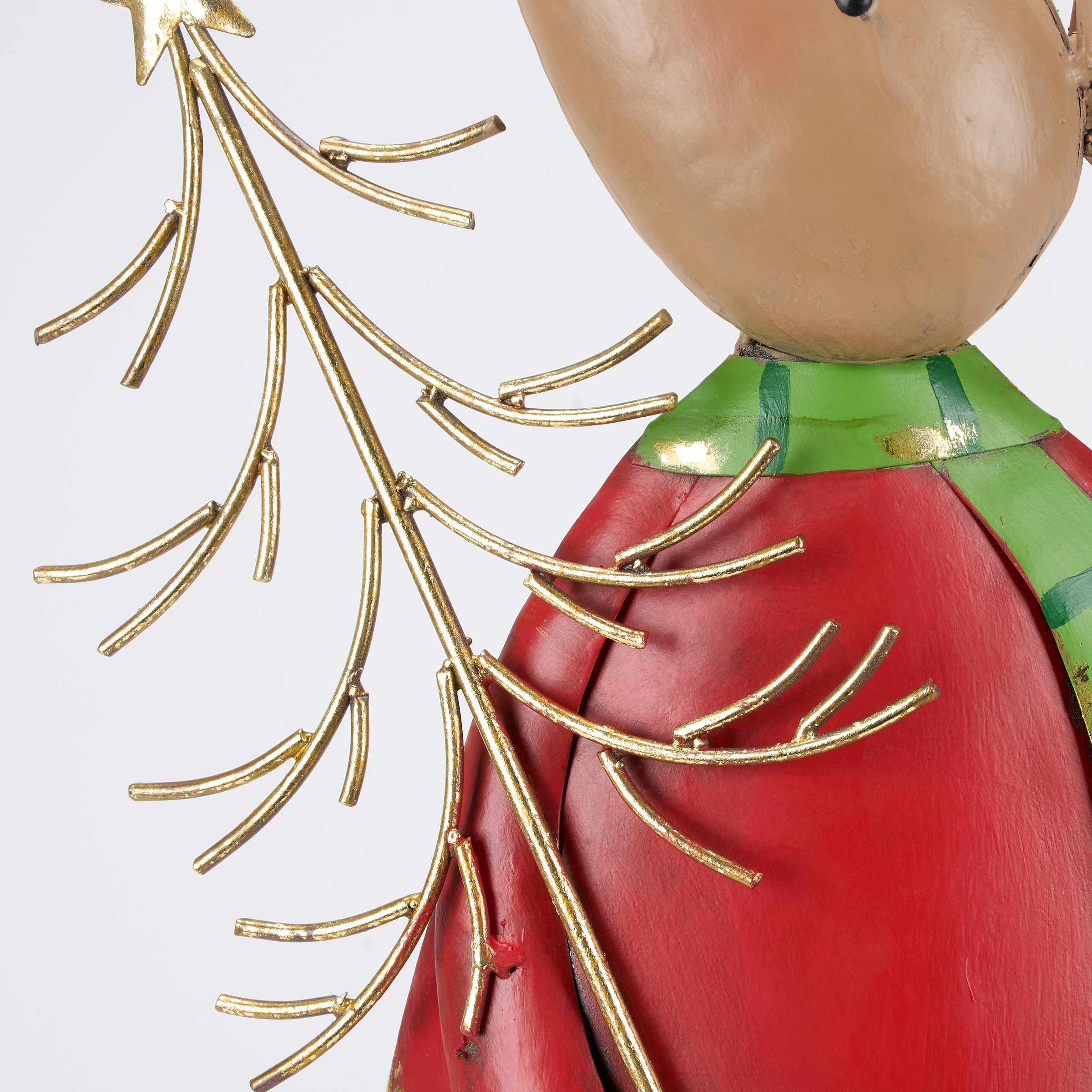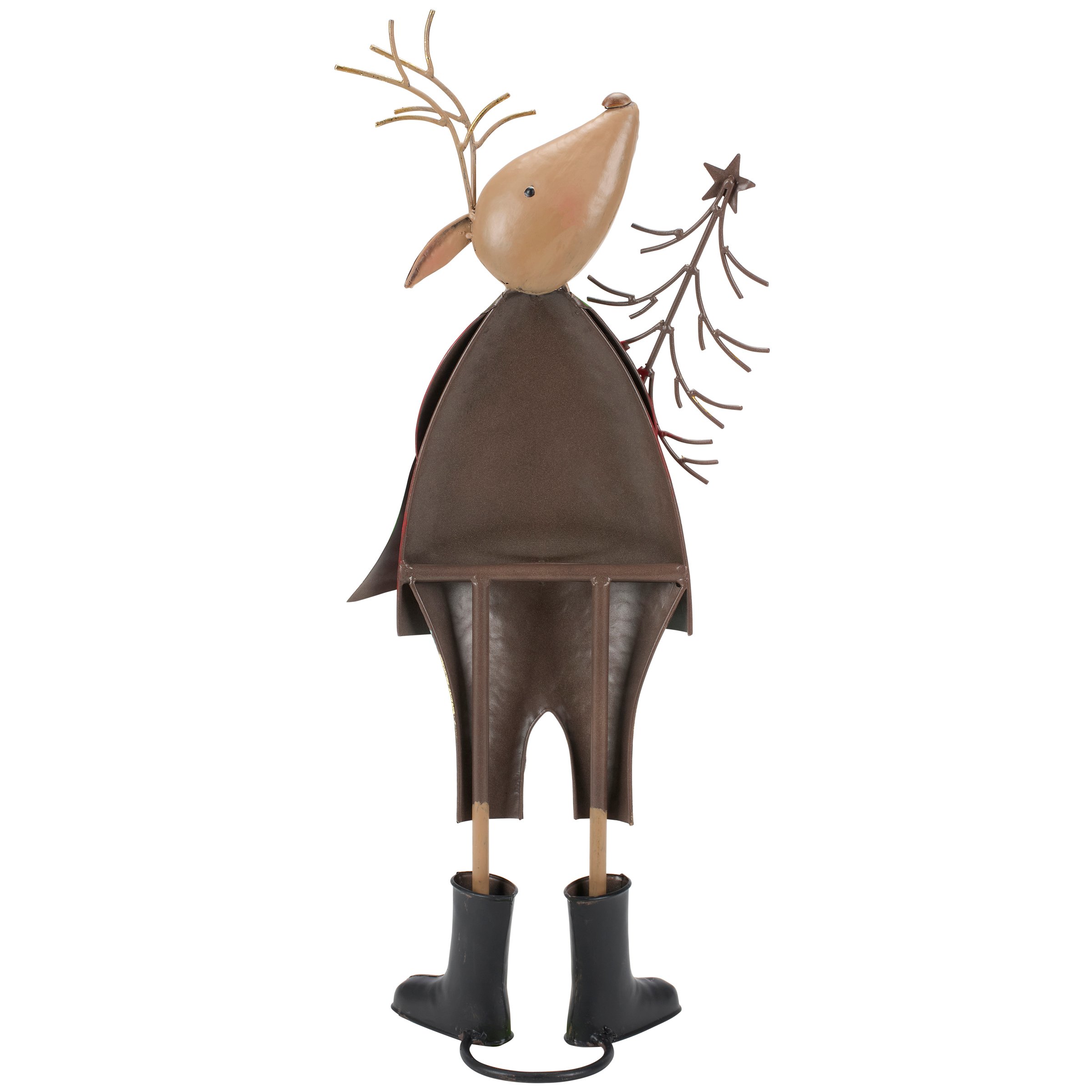 A metal art piece from our Christmas Collection displaying a winter deer character design made with painted metal pieces for a rustic handmade aesthetic. Christmas deer features painted winter clothing details and a Christmas tree in it hands as well as glitter and metallic gold accents throughout. Our Deer Christmas Tree sitter is designed to free stand on flat surface for display. A rustic Christmas home accent that easily adds seasonal style to any home or work space.