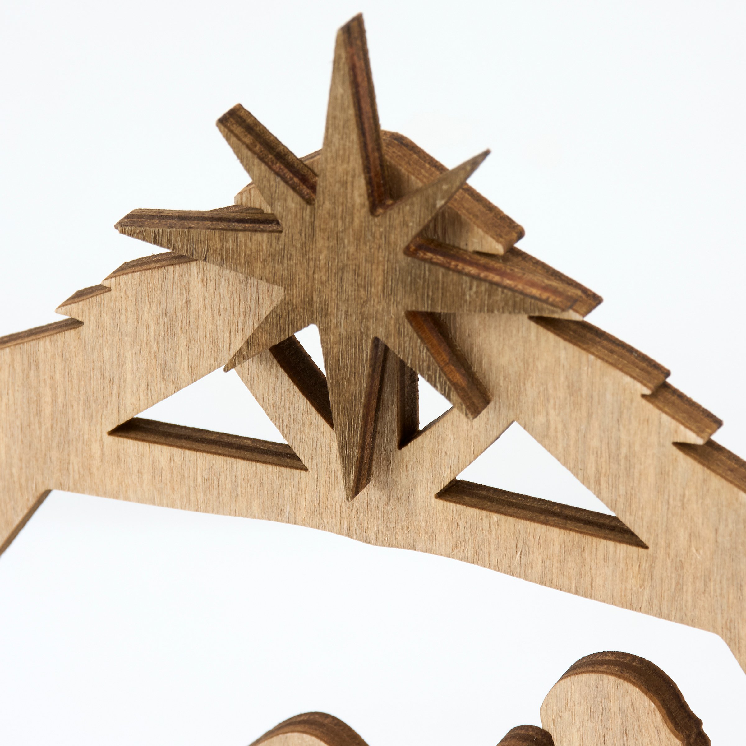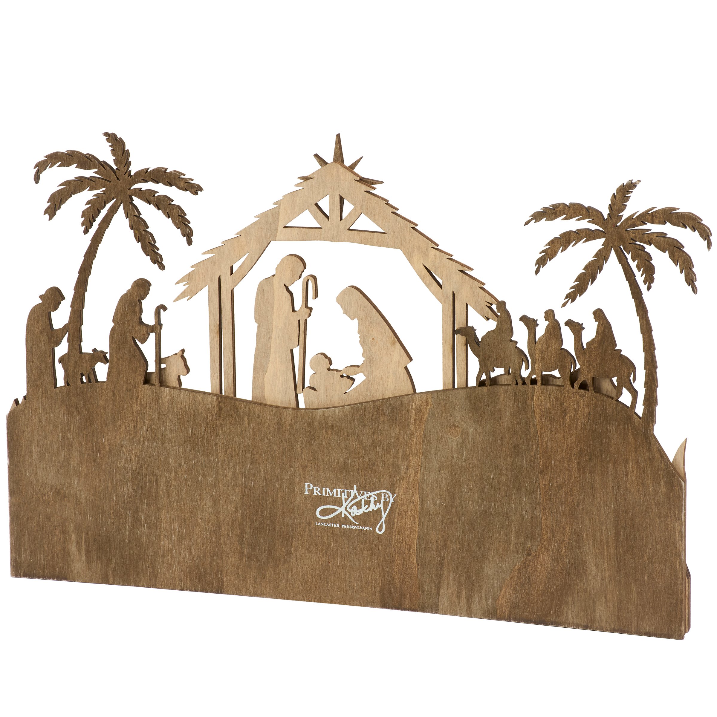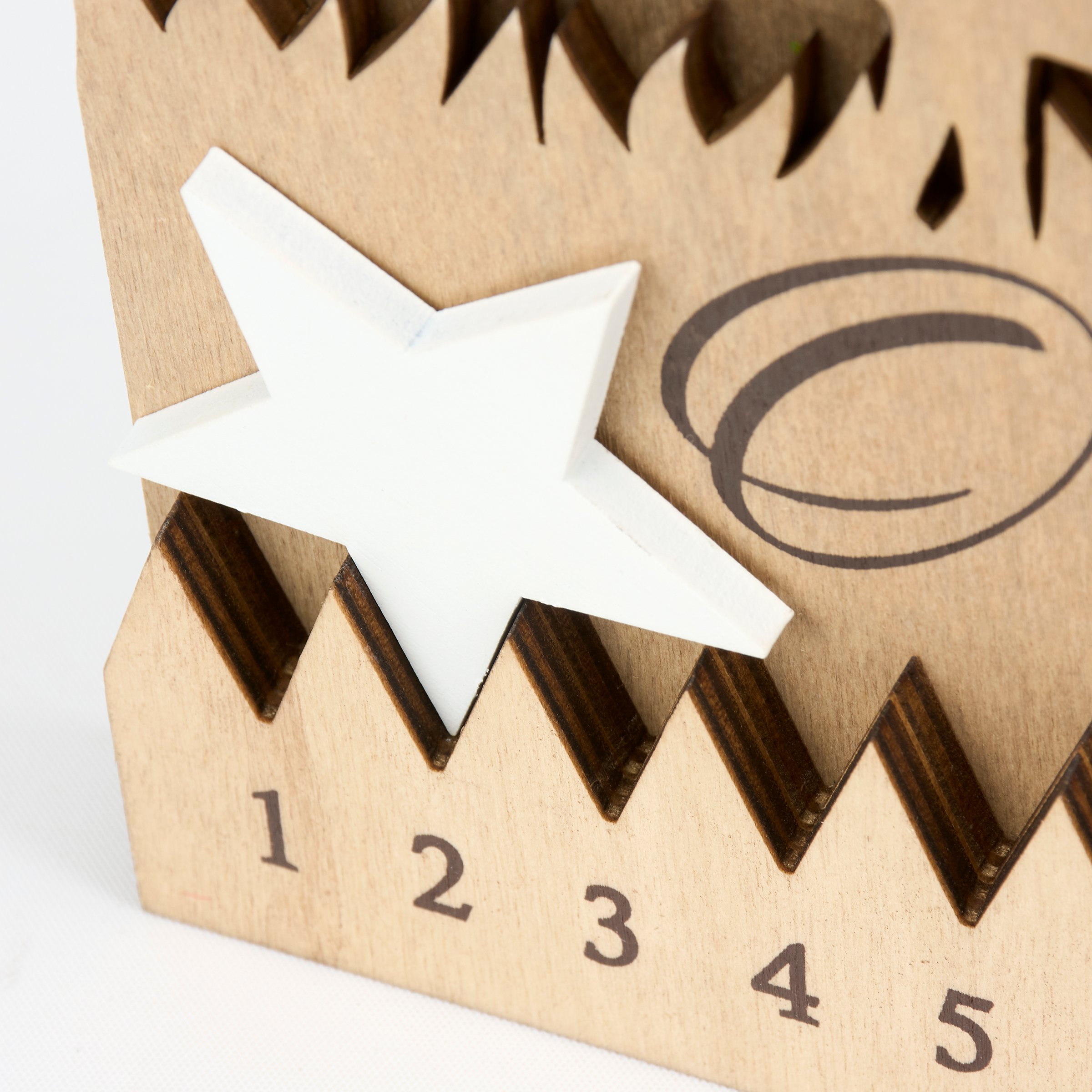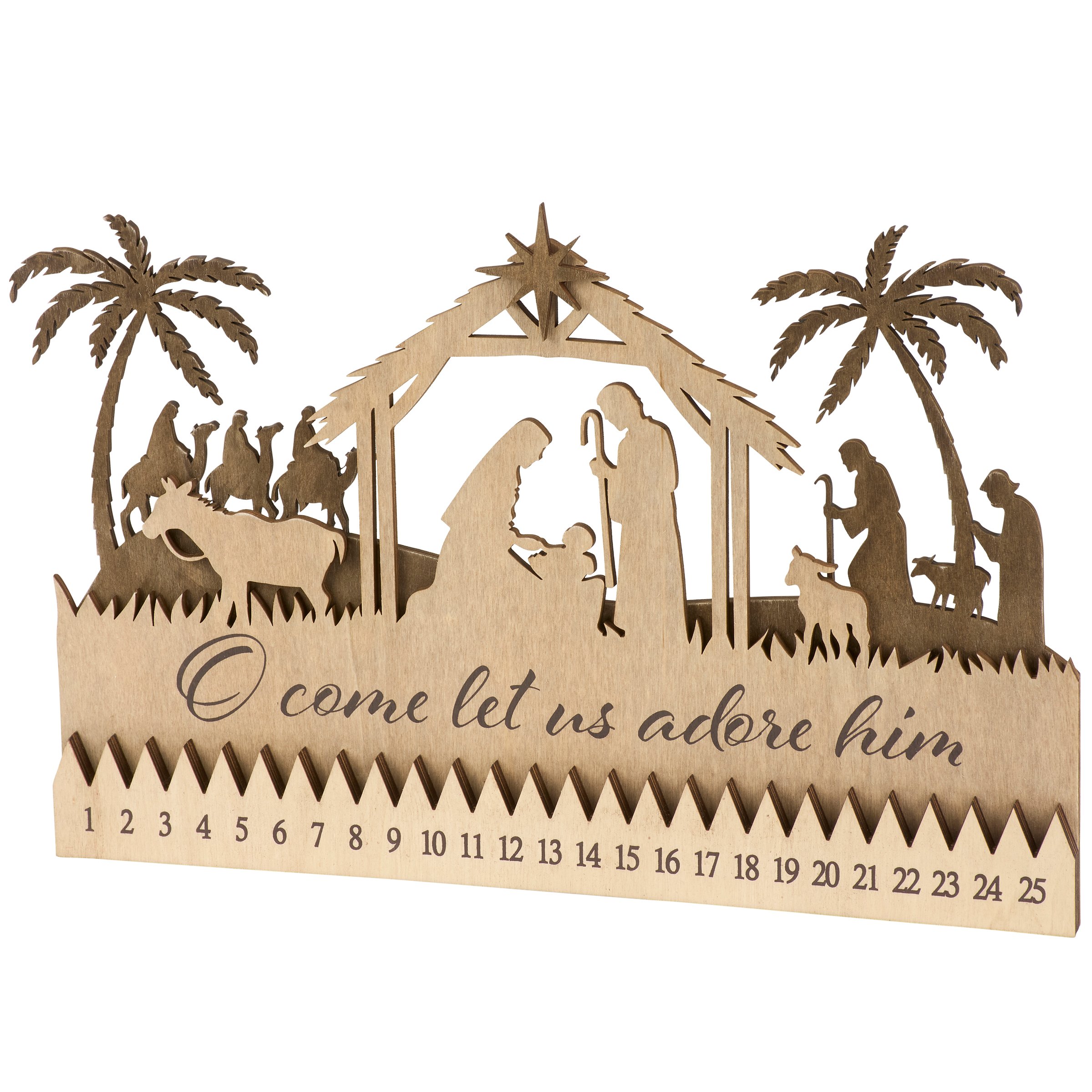 A decorative sitter from our Christmas Collection featuring layered natural wood cutouts that create a nativity scene attached to a Christmas countdown design. Christmas countdown includes a wooden star cutout that can be placed on days 1-25 with an inspirational sentiment above that reads "O Come Let Us Adore Him." Our Let Us Adore Him countdown sitter is designed to free stand on flat surface for display. A nativity themed home accent that can be easily displayed in any home or work space to build excitement for the holidays.