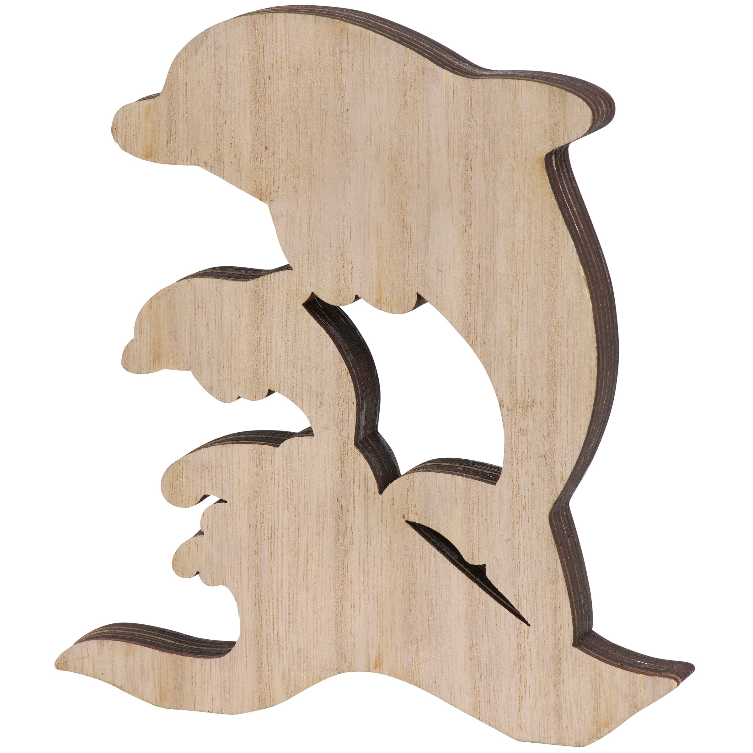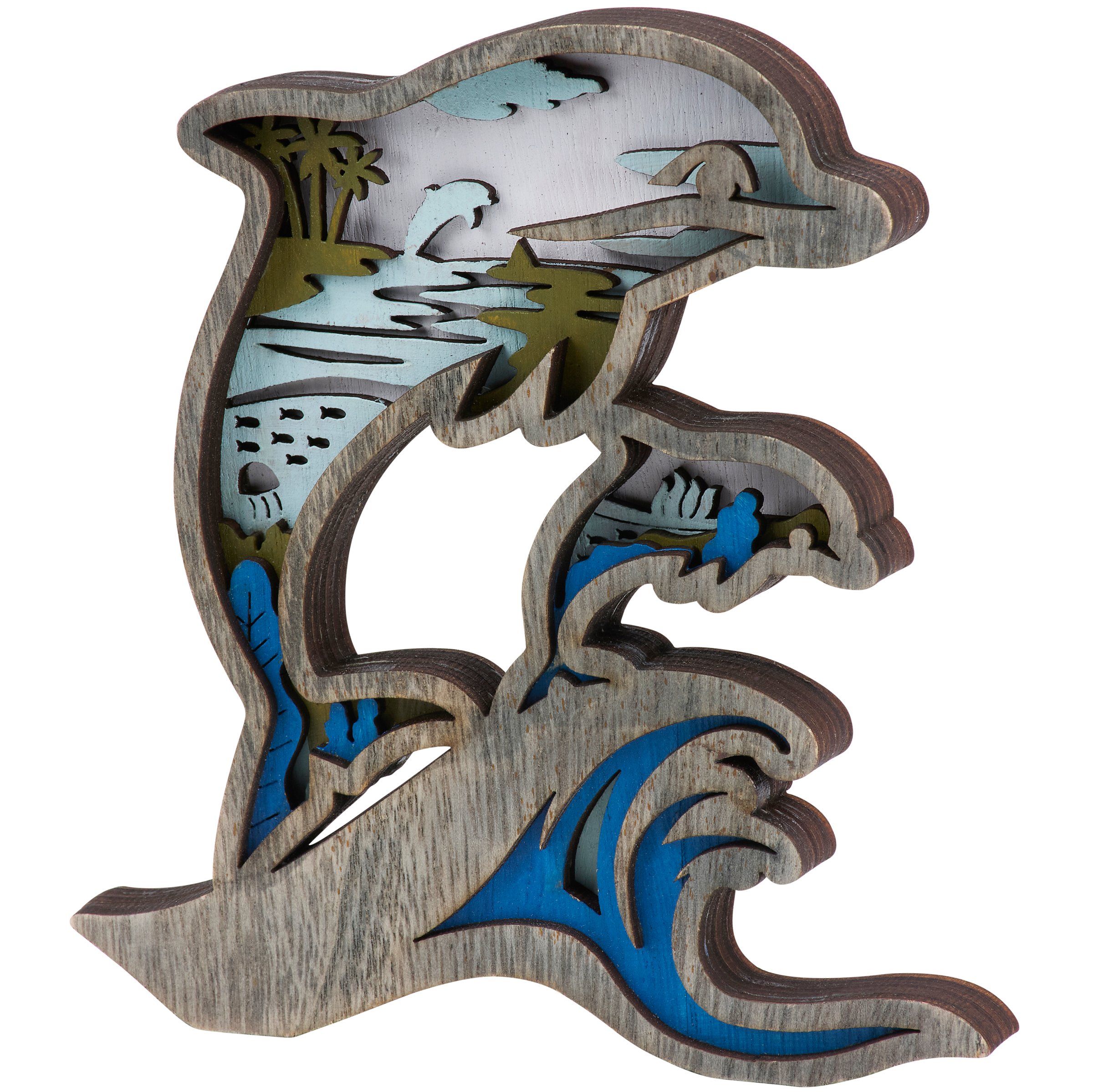 A wooden sitter from our Beach Collection featuring a jumping dolphins shape cut from natural wood with beach and ocean scenes displayed inside that are made with layered cutouts of colored wood pieces for added dimension. Our Dolphin sitter is designed to free stand on flat surface for display. A beach home accent that can be easily displayed in any home or work space.