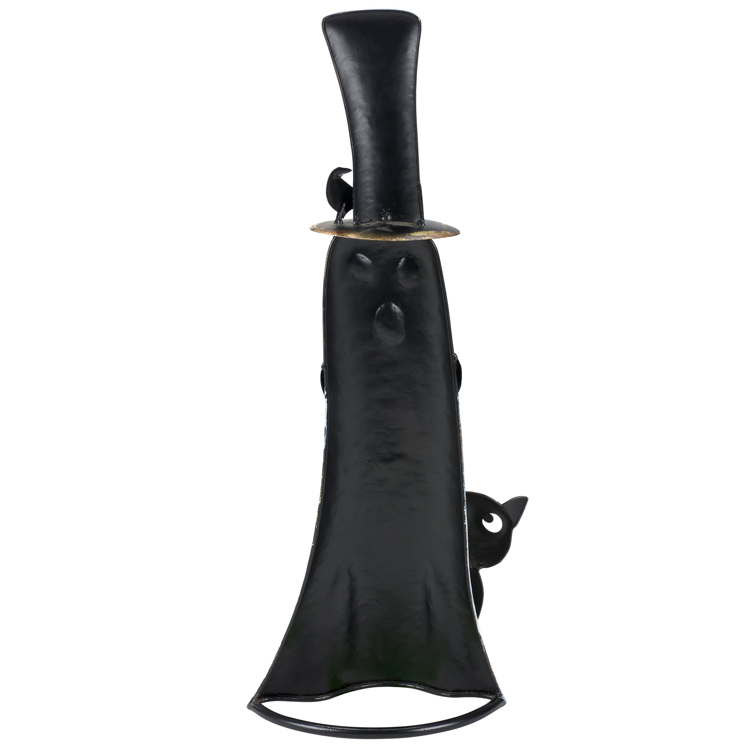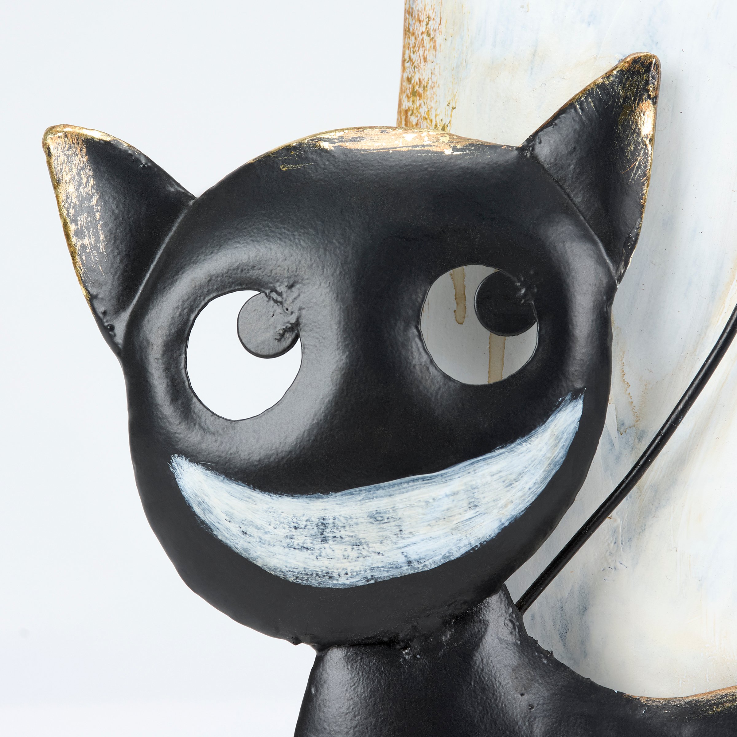 A metal art piece from our Halloween Collection displaying a whimsical ghost character design made with painted metal pieces for a handmade aesthetic. Halloween ghost features painted designs and a black cat with a leash to its hand as well as distressed details and metallic gold accents throughout. Our Ghost Walking Cat sitter is designed to free stand on flat surface for display. A whimsical Halloween home accent that easily adds seasonal style to any home or work space.