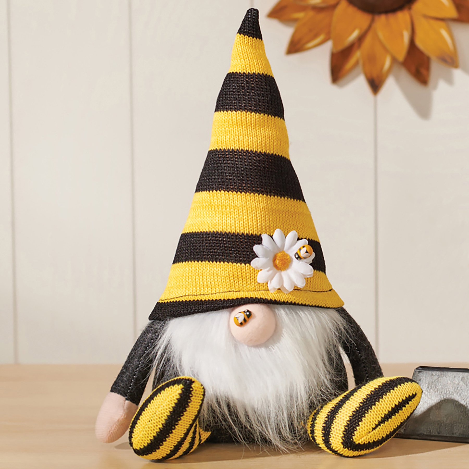 A fabric and felt sitter from our Bee Collection displaying a fun combination of gnomes and bees. Design features a polyester filled gnome with flower and bee accents on hat and nose. Perfect to display on its own or with coordinating bee and gnome displays. Our Gnome With Bee sitter is designed to free-stand on any flat surface. WARNING: To prevent suffocation, do not put item in a crib or near an area where an infant may sleep. Decorative item only and are not intended for infant use.