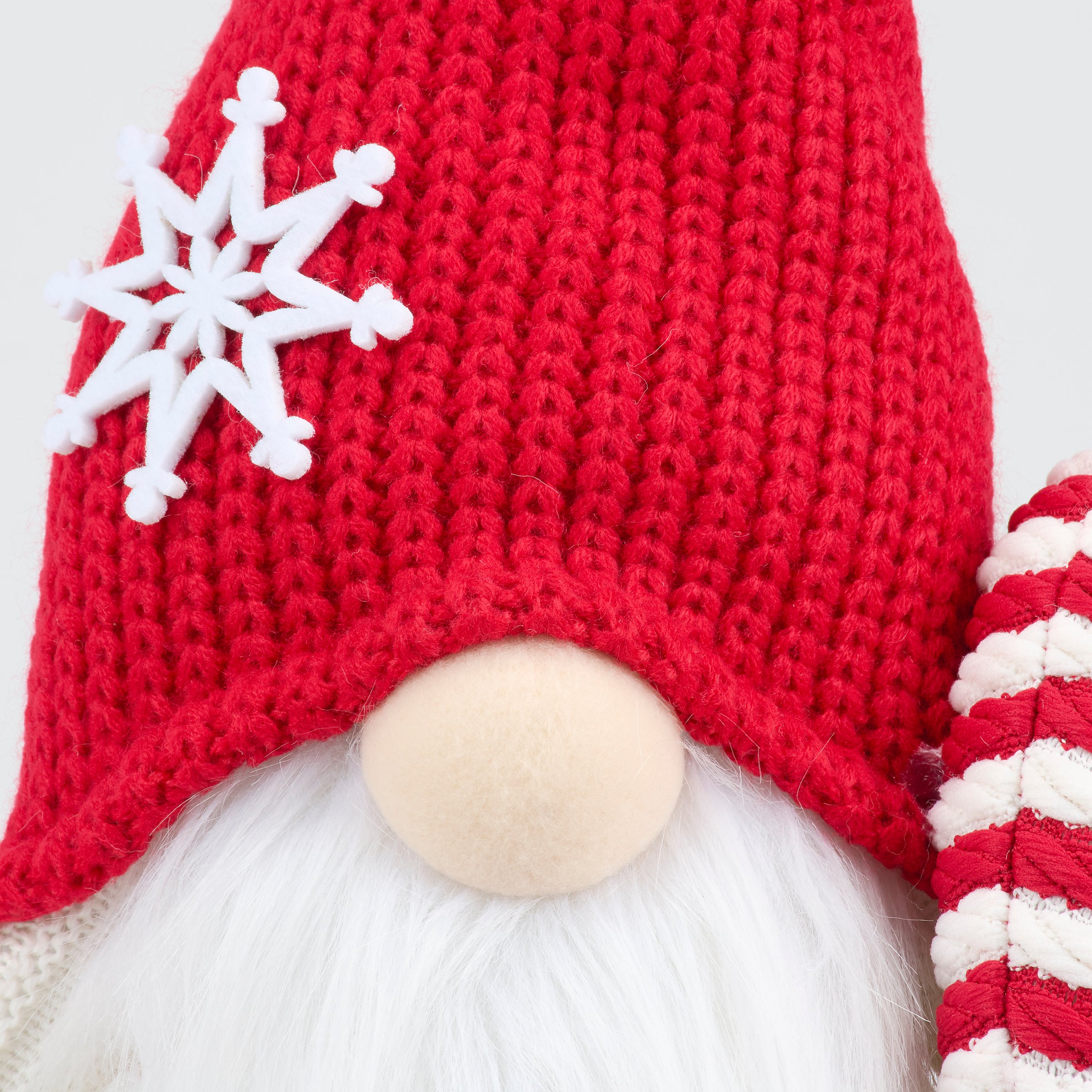 A sitter from our Christmas Collection displaying a winter gnome design. Gnome features knit winter clothes and a large candy cane in its hand. Perfect to display on its own or with a collection of decorative gnomes. Our Knitted Gnome sitter is weighted with sand to free-stand on a flat surface for display. For decorative use only; not a toy. A gnome themed Christmas home accent that easily adds seasonal style to any home or work space.