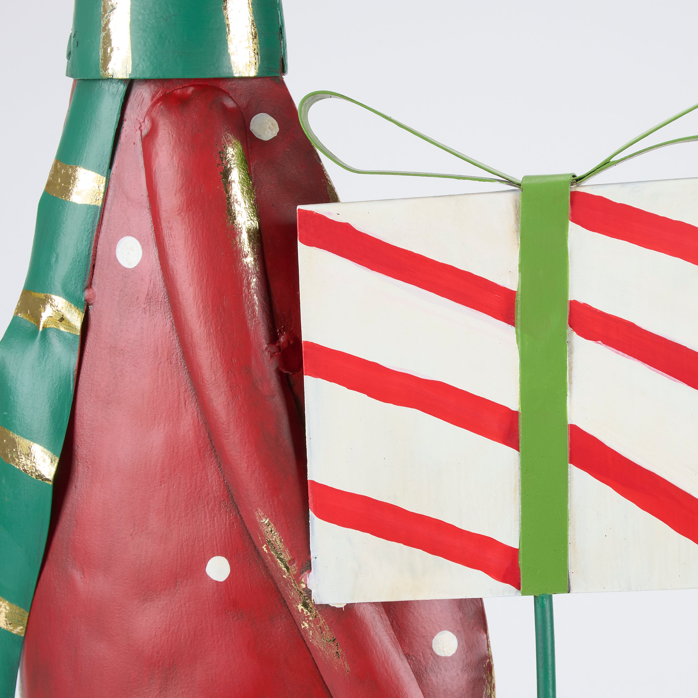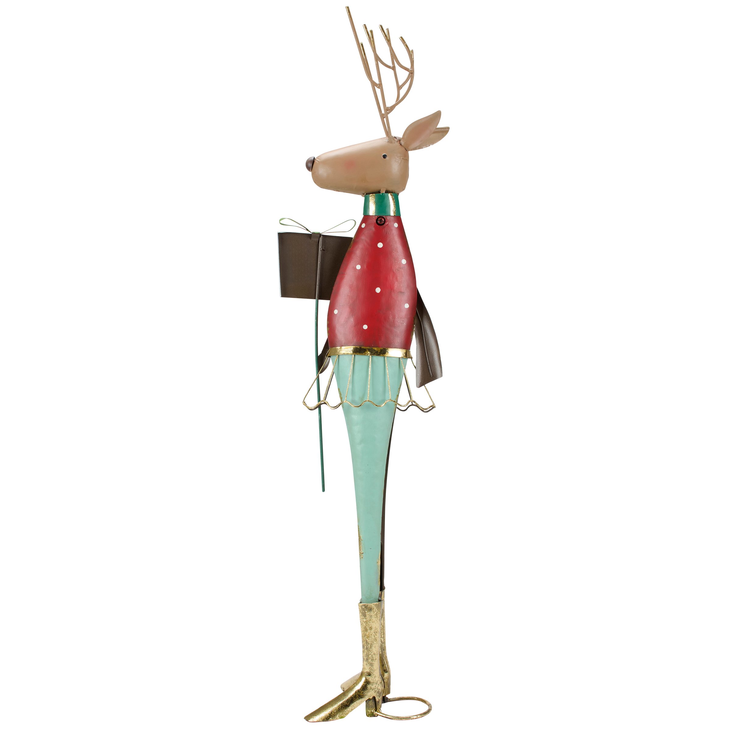A metal art piece from our Christmas Collection displaying a winter reindeer character design made with painted metal pieces for a rustic handmade aesthetic. Christmas reindeer features painted winter clothing details and a present in her hands as well as glitter and metallic gold accents throughout. Our Lady Reindeer Present sitter is designed to free stand on flat surface for display. A rustic Christmas home accent that easily adds seasonal style to any home or work space.