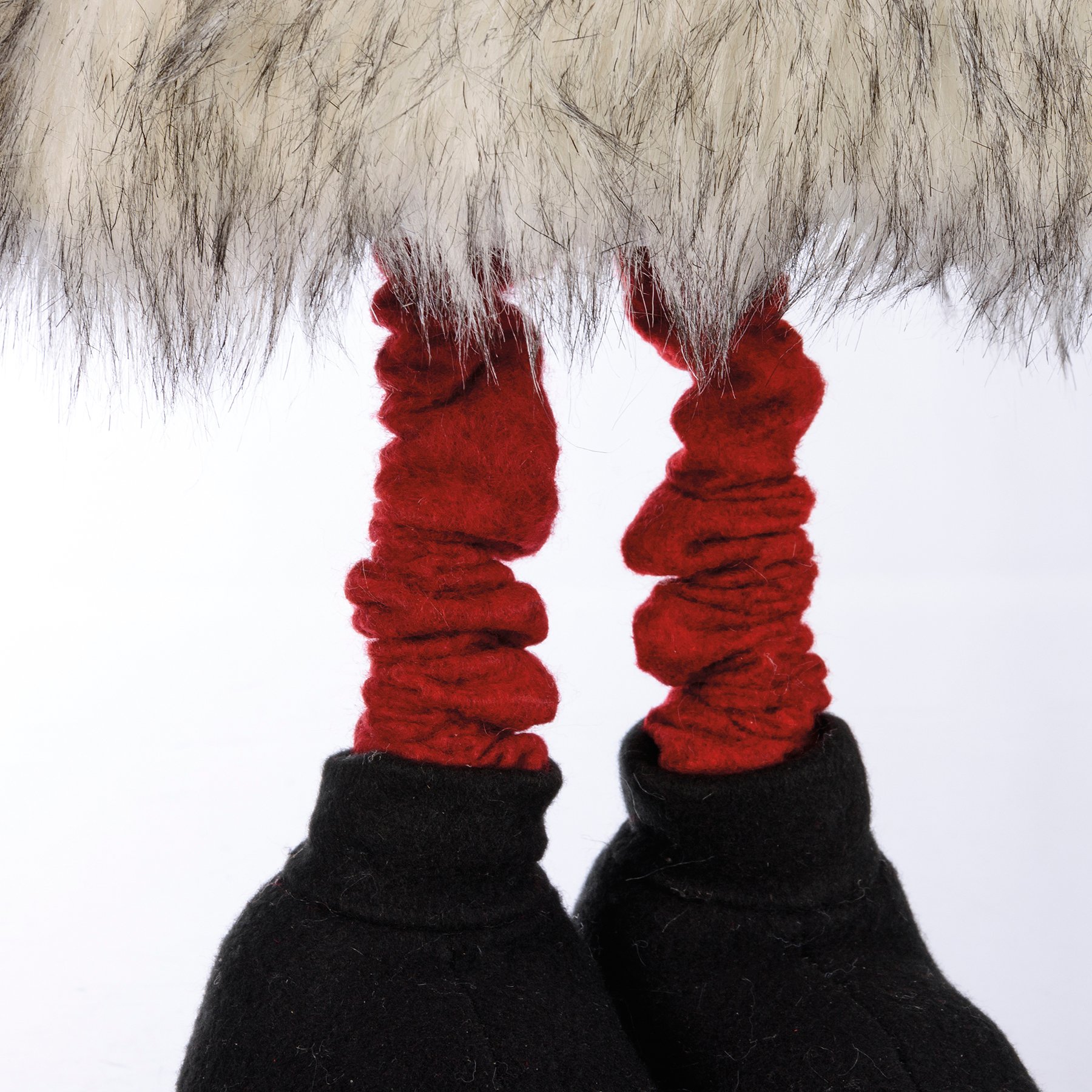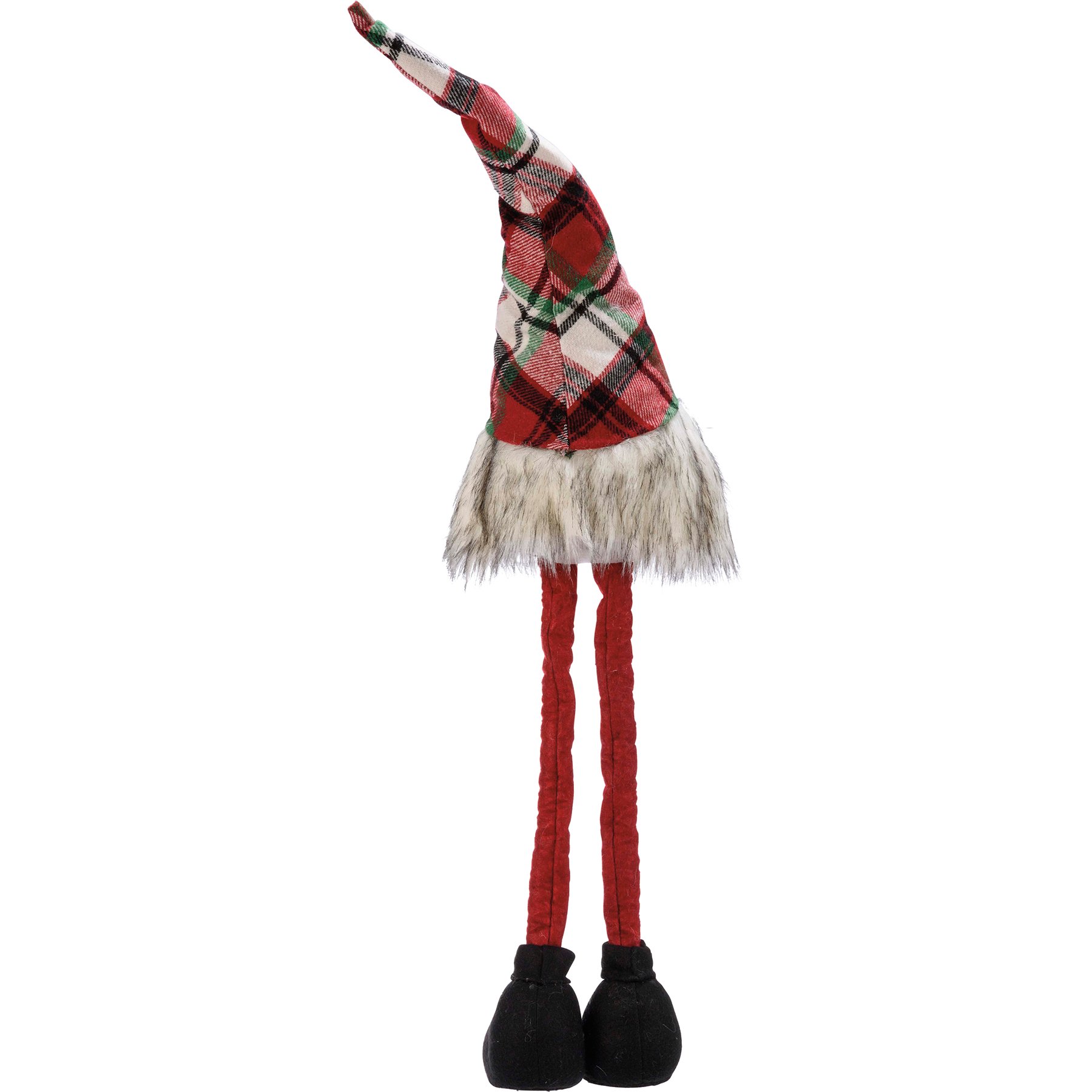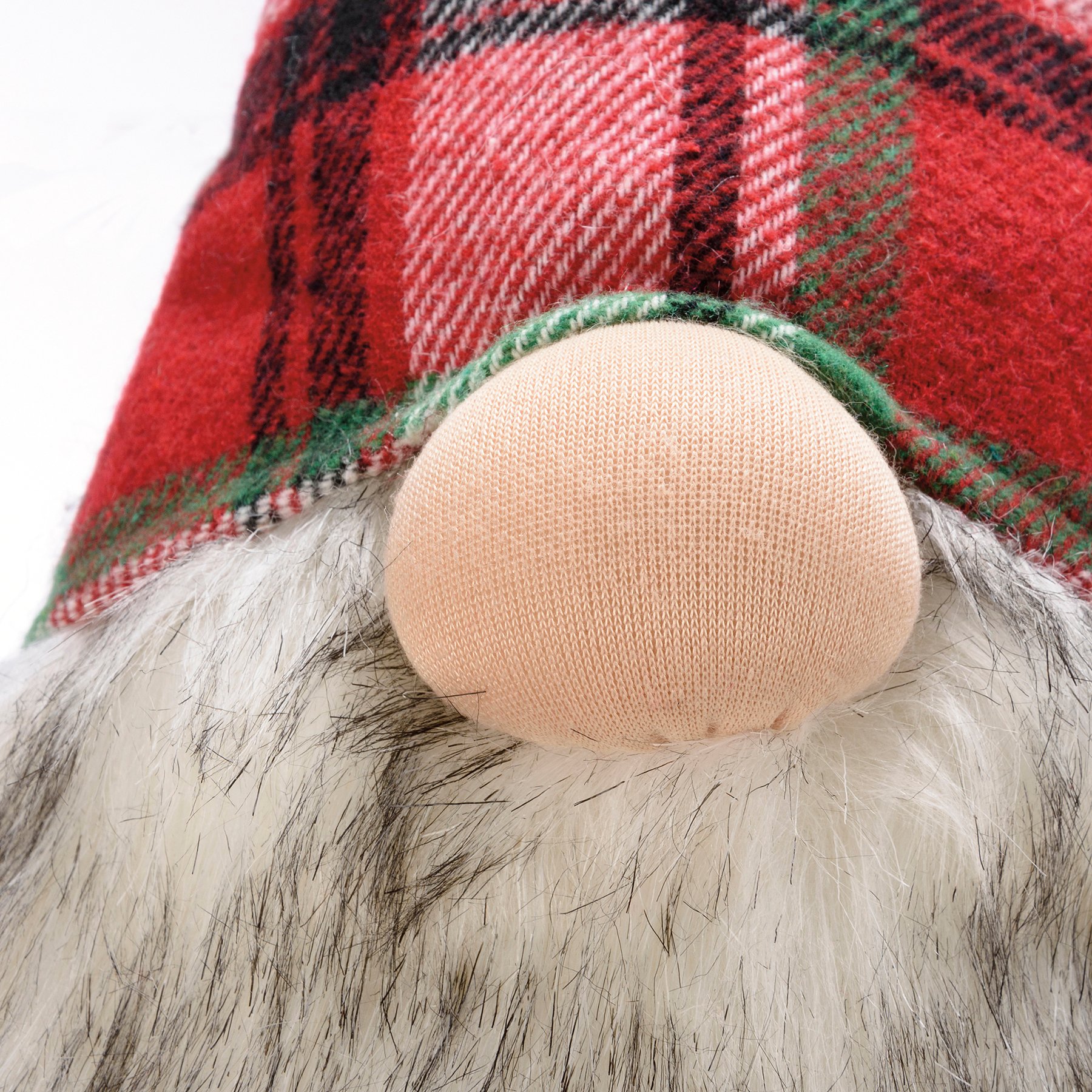 A large standing gnome featuring a red, green, and white plaid color palette. Gnome includes fluffy beard detail and fabric nose for added interest. Retractable legs allow gnome to adjust from 24-32" tall. Pairs well with other holiday plaid items for a cohesive Christmas display.