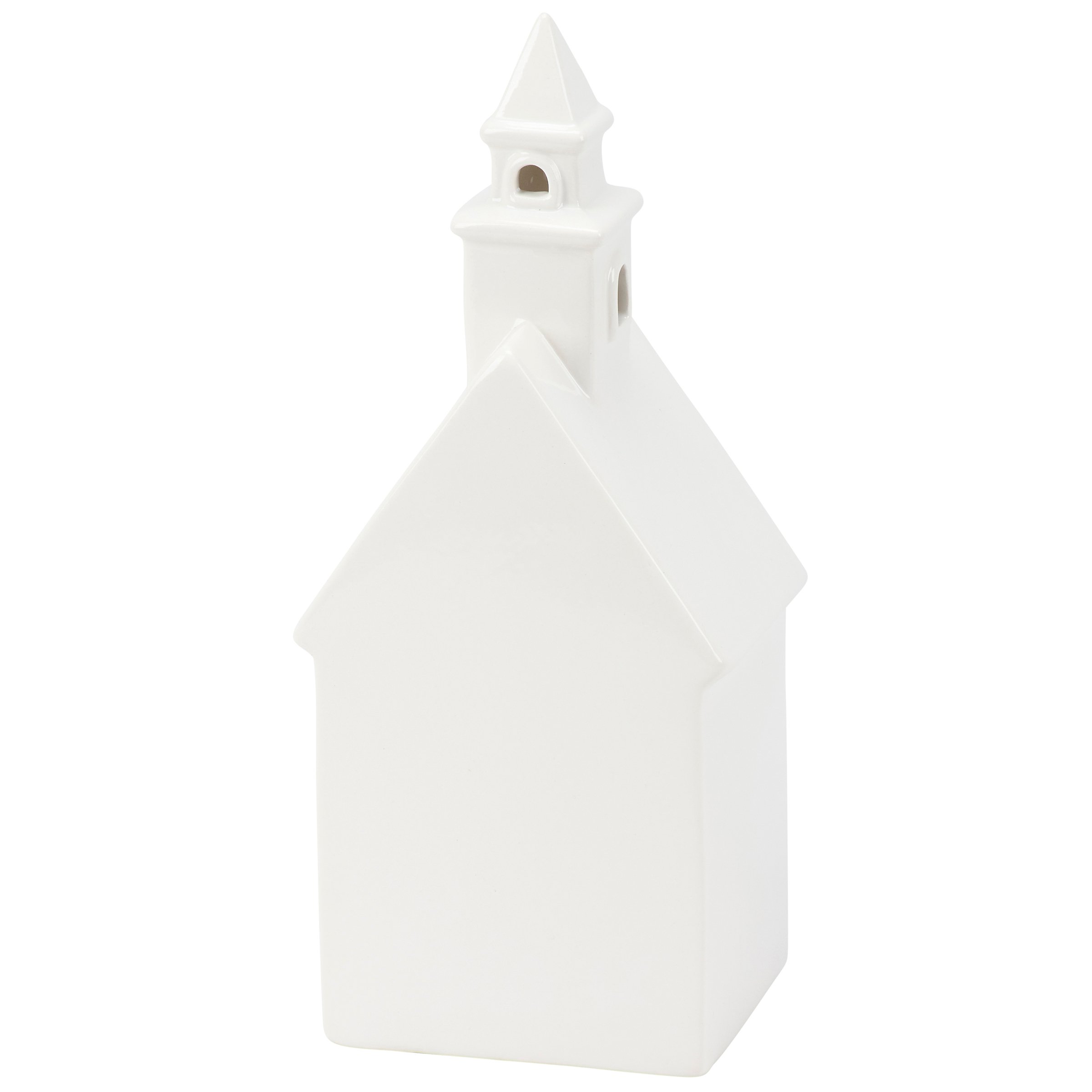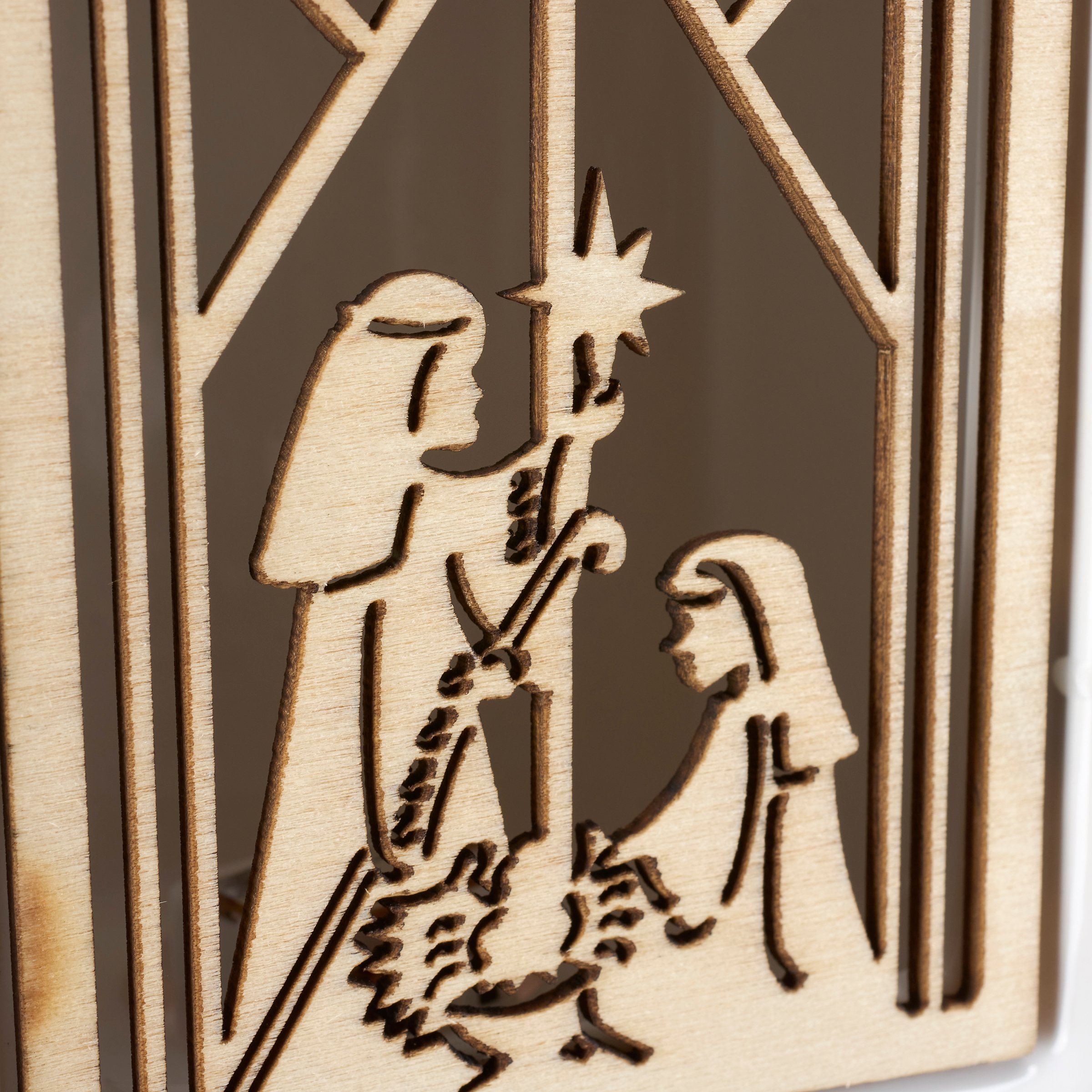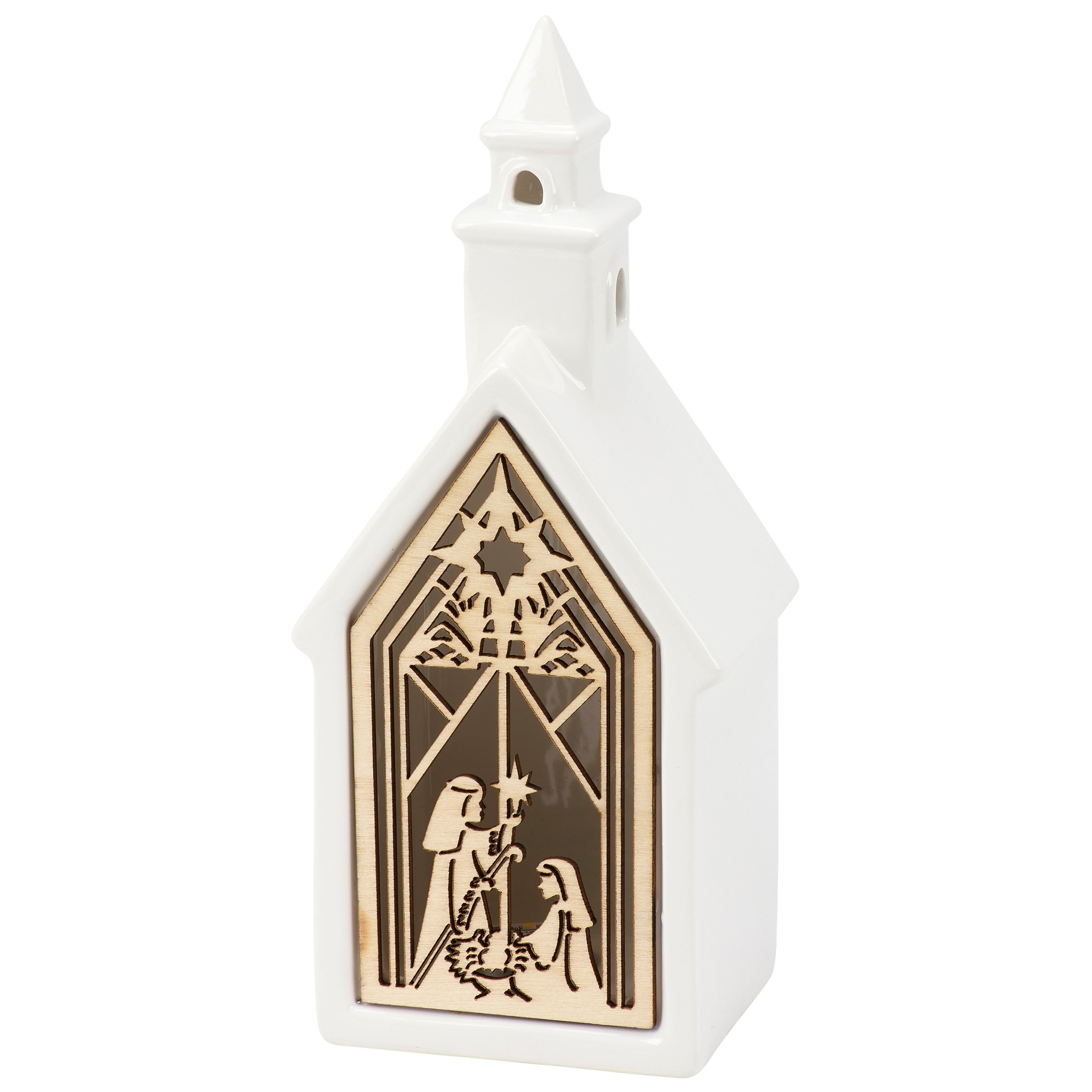 A ceramic sitter from our Christmas Collection displaying a chapel shape with a white glaze finish. Ceramic sitter features an opening on the front with a light source inside powered by 3 LR44 batteries that illuminates a natural wood piece displaying a cutout of a nativity scene. Batteries not included. Our Lighted Nativity sitter is designed to free-stand on flat surface for display. A nativity themed home accent perfect for adding seasonal lighting to any home or work space.