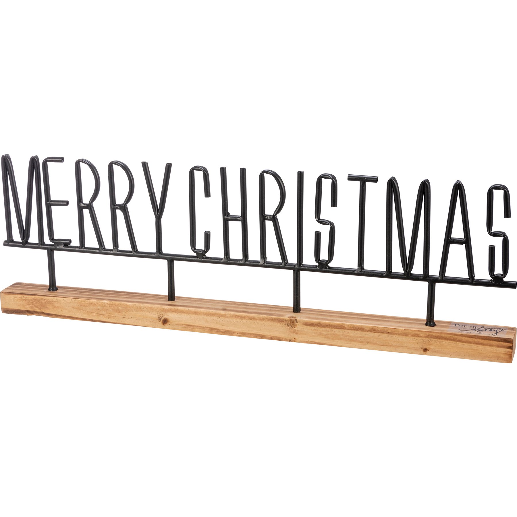 A decorative sitter made of a metal sign boasting an inspirational word standing on a natural wood base. Hand lettered "Merry Christmas" sentiment is perfect for seasonal use. Can free-stand alone.