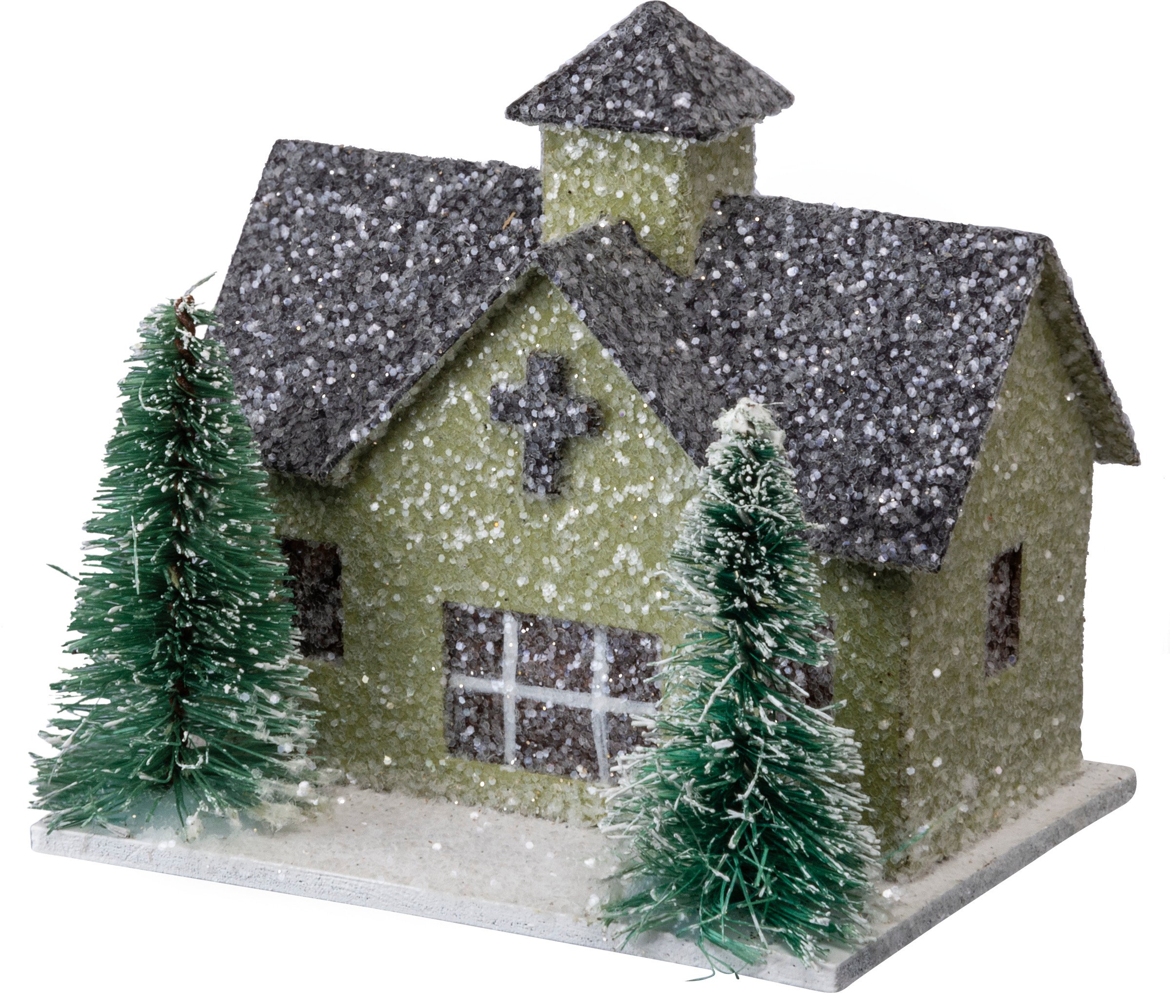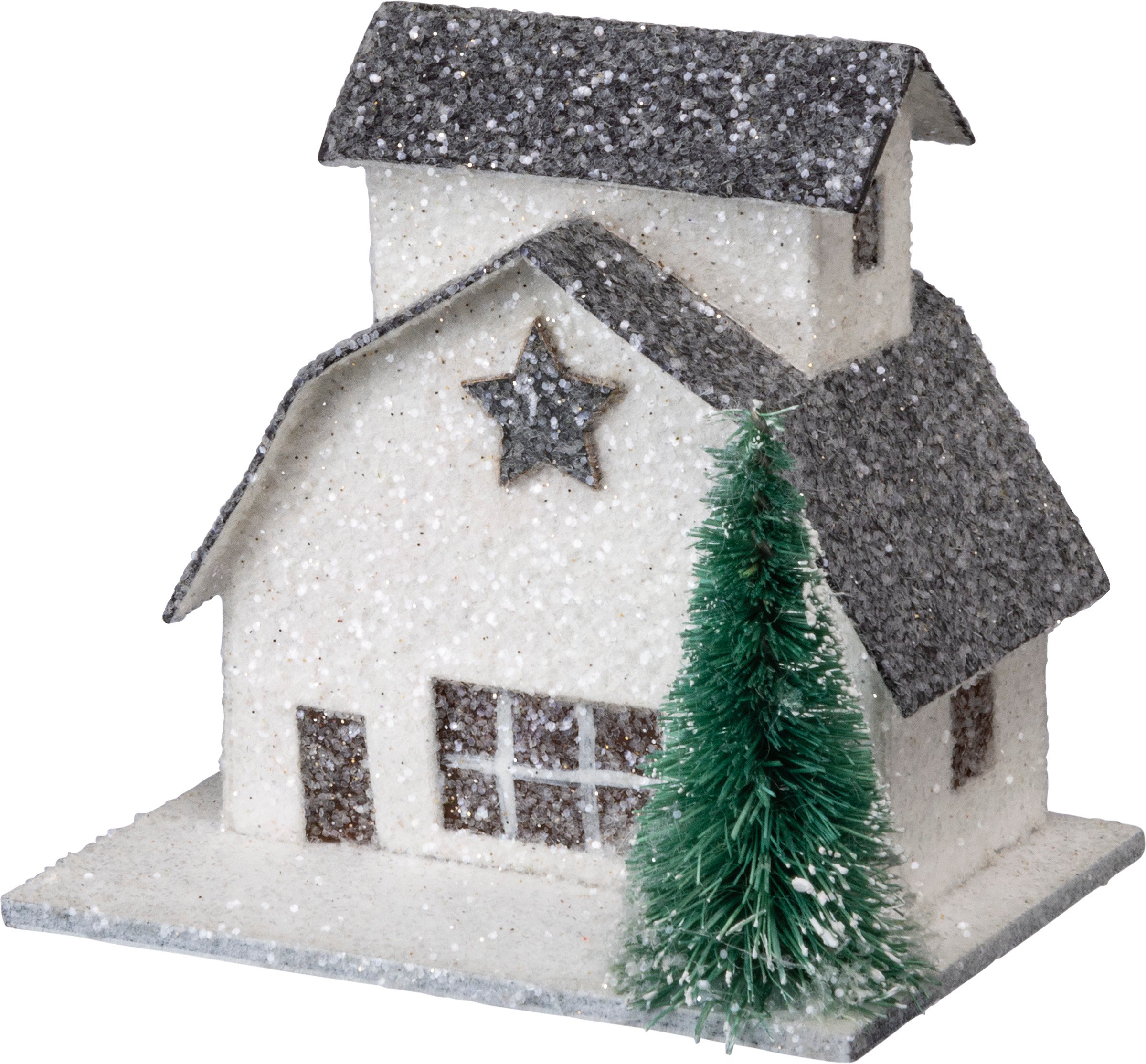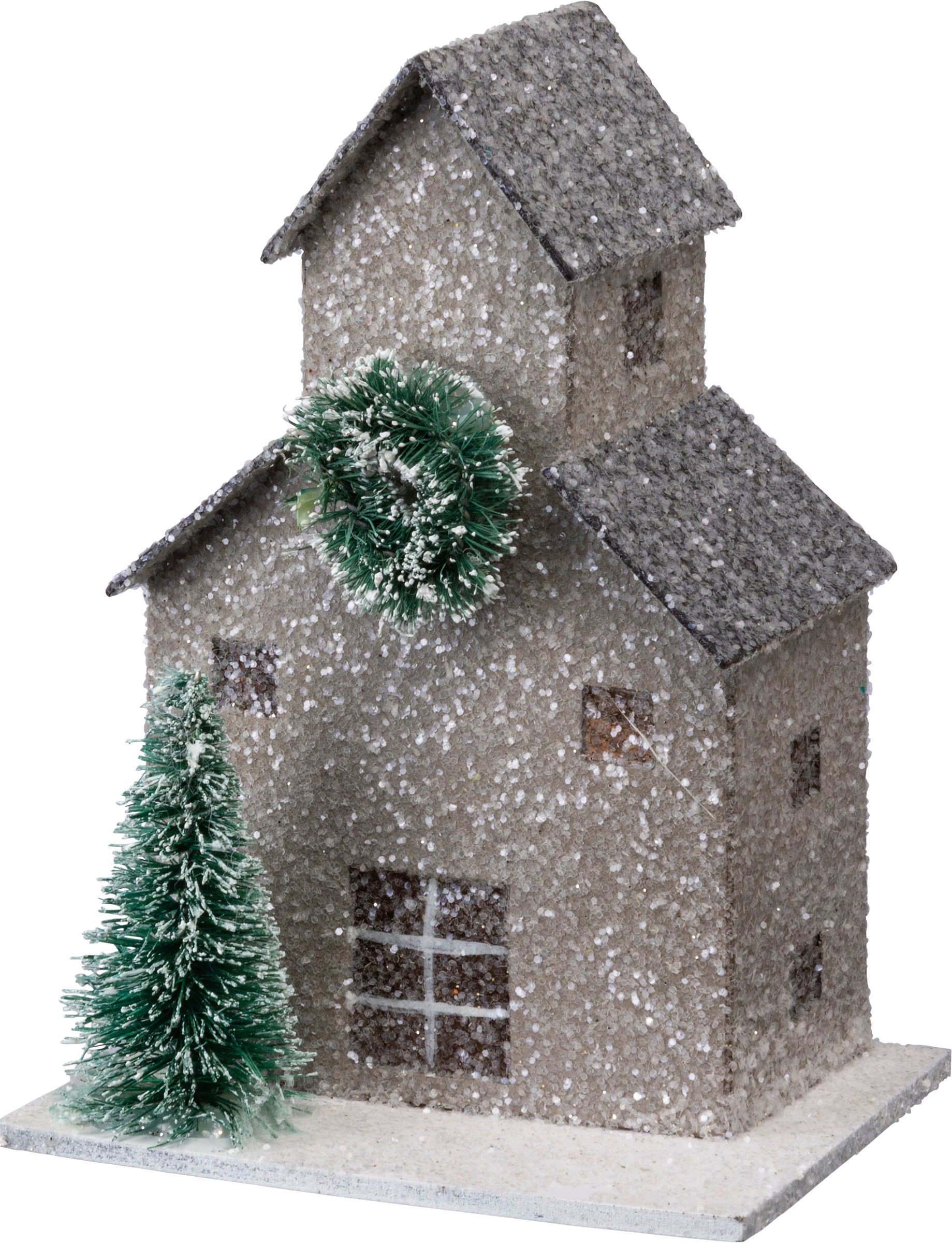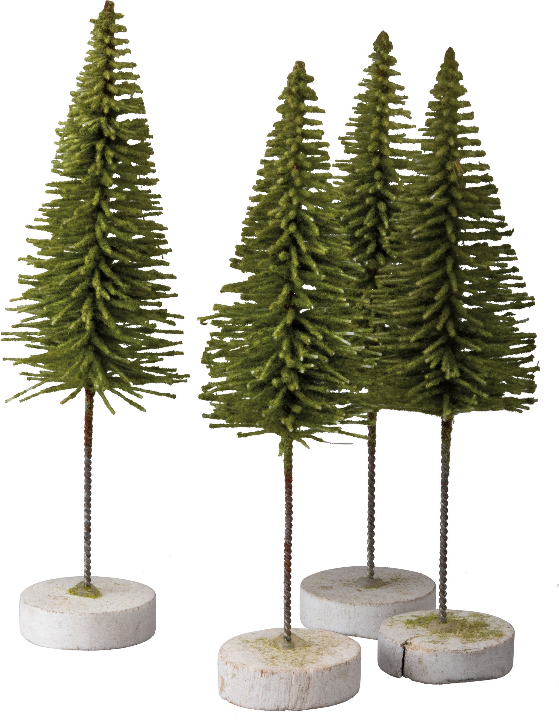A sitter set of snowy five barns and four trees in a cohesive neutral palette for a charming holiday display.