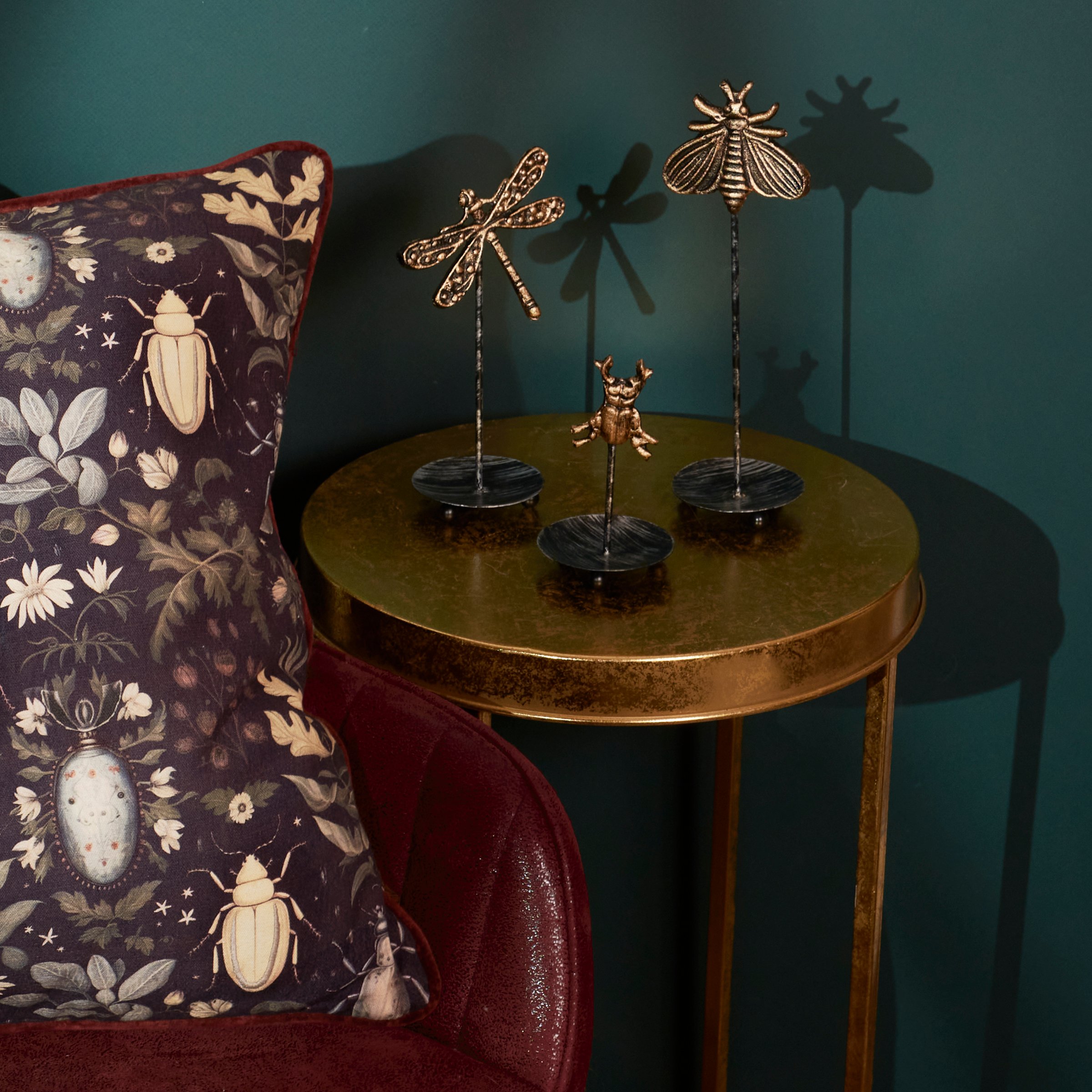 A set of 3 decorative sitters from our Vintage Collection featuring various insect designs made in an antique metal style. Sitter set includes a beetle, dragonfly and moth standing at different heights on a brushed metal stake and base. Our Insect sitters are designed to free-stand on any flat surface. A set of dark academia inspired home accents perfect for everyday display.