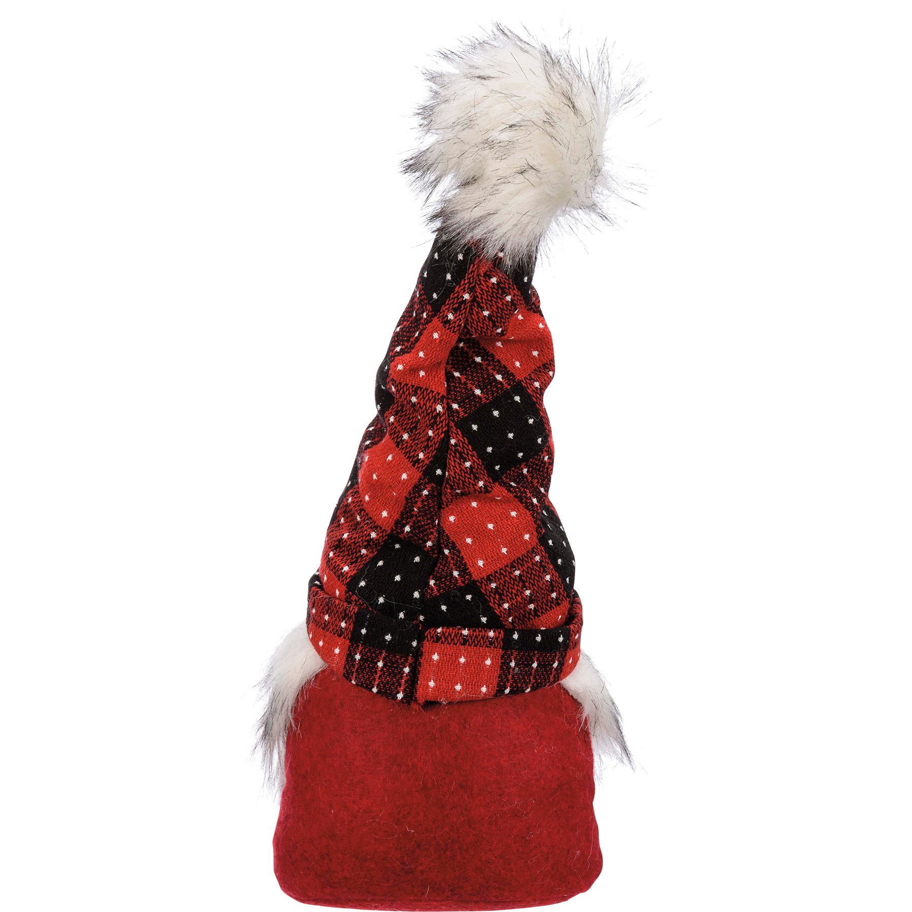 A set of two large weighted gnome sitters with fabric hats featuring a black and red plaid color palette. Gnome includes fluffy beard and pom pom details and fabric nose for added interest. Set pairs well with other holiday plaid items for a cohesive Christmas display.