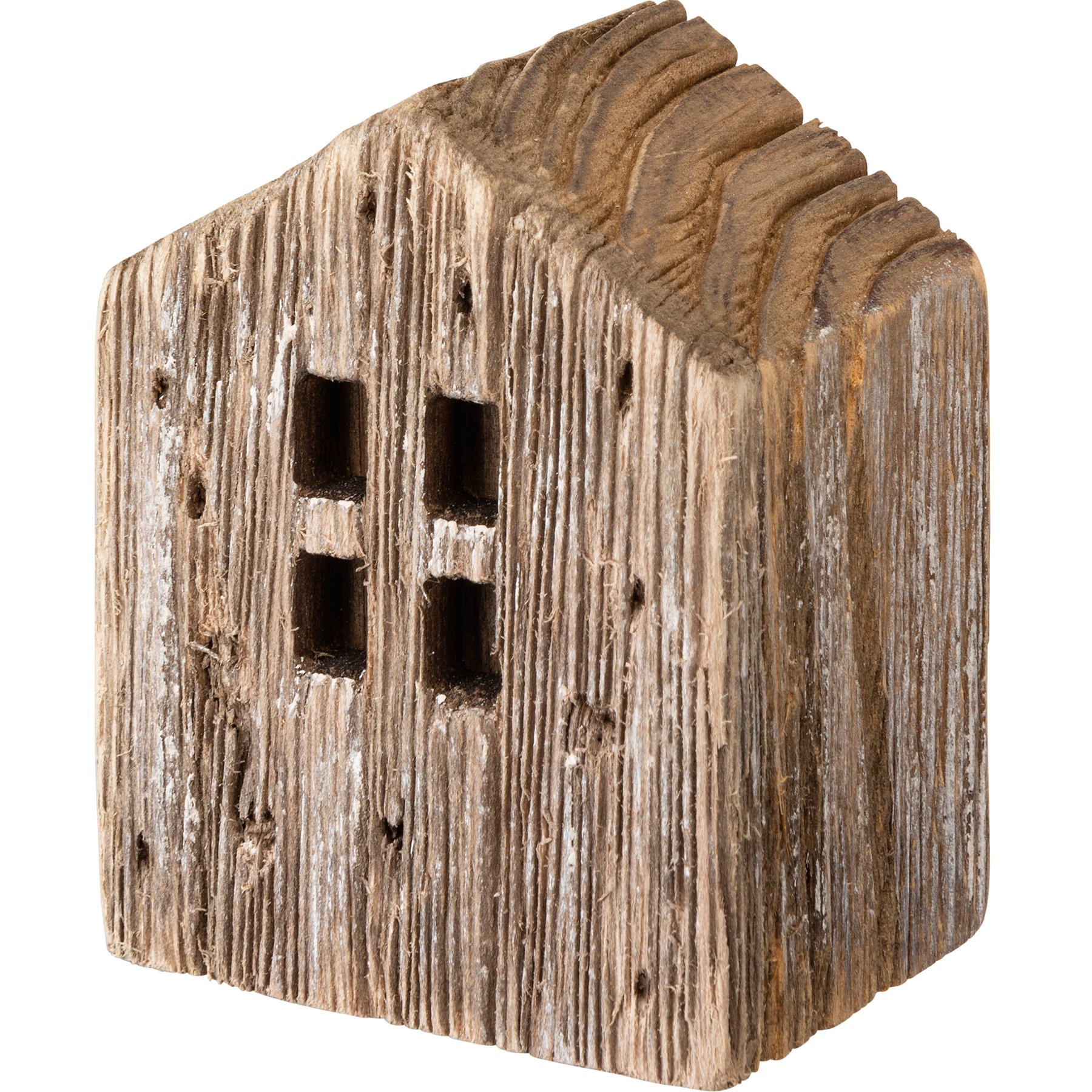 A set of three wooden rustic houses including a tall white house, a small white house, and a small wooden house.