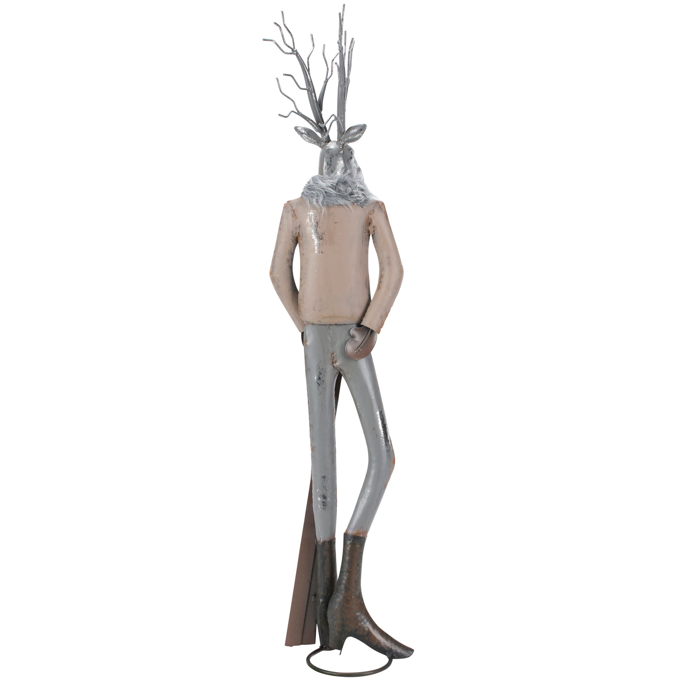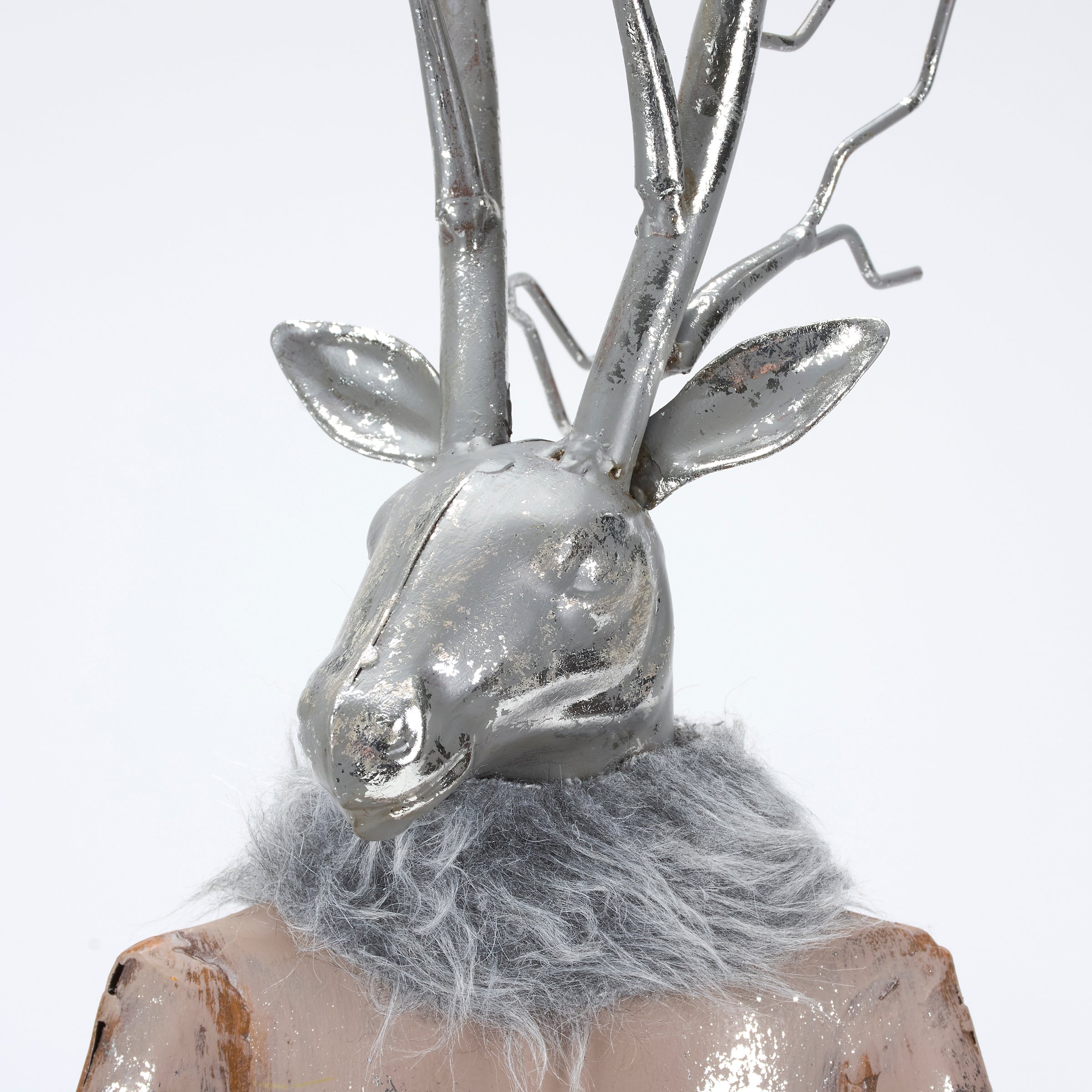A metal art piece from our Christmas Collection displaying a skiing reindeer character design made with painted metal pieces for a rustic handmade aesthetic. Skier reindeer features faux fur detail on the clothes and skis in his hands as well as distressed details and metallic silver accents throughout. Our Reindeer Skier sitter is designed to free stand on flat surface for display. A rustic winter home accent that easily adds seasonal style to any home or work space.