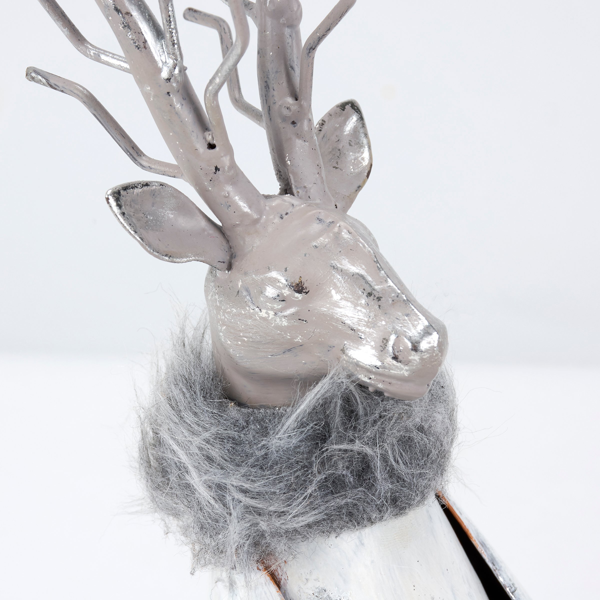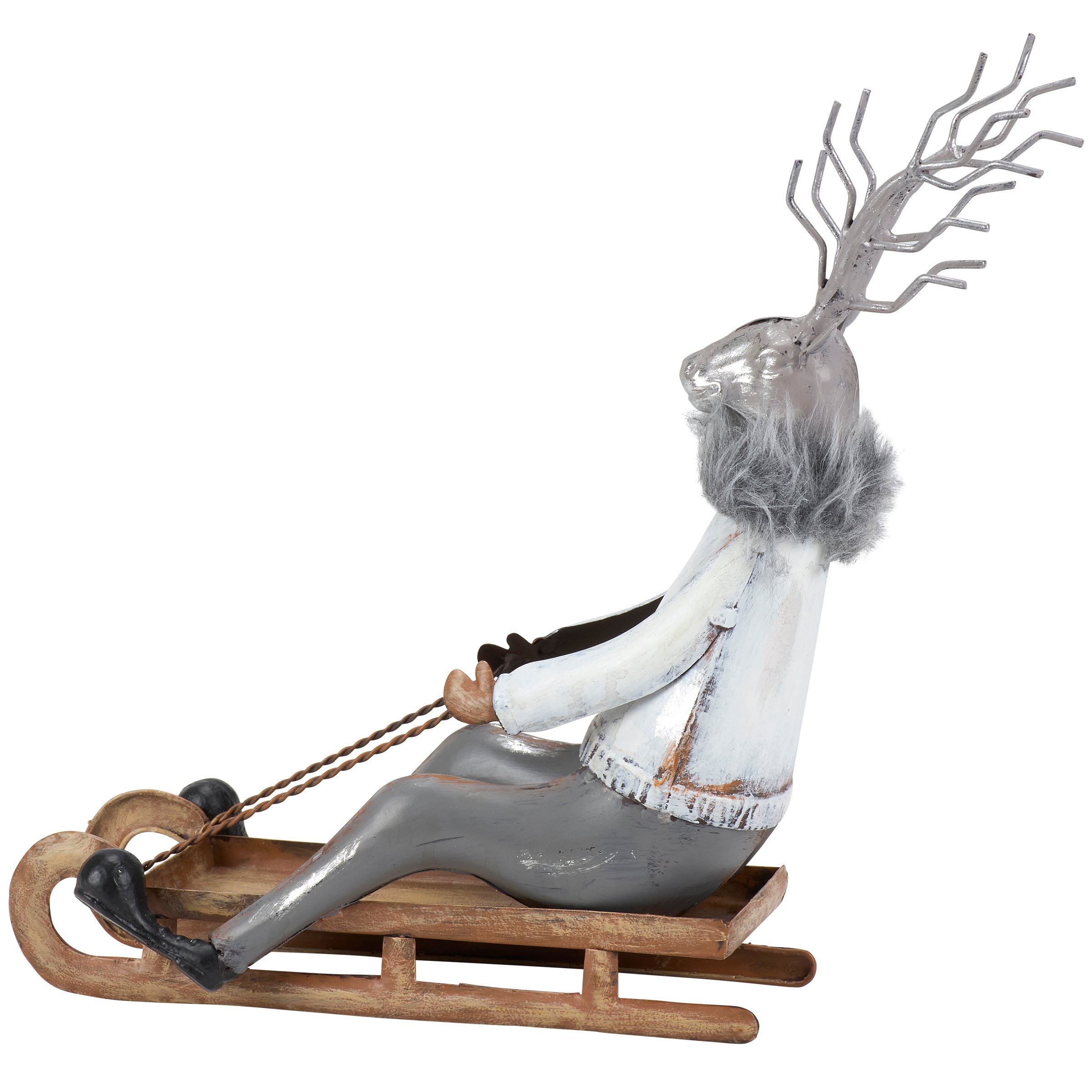 A metal art piece from our Christmas Collection displaying a sledding reindeer character design made with painted metal pieces for a rustic handmade aesthetic. Reindeer features faux fur detail on the clothes and sits on a painted metal sled as well as distressed details and metallic silver accents throughout. Our Sledding Reindeer sitter is designed to free stand on flat surface for display. A rustic winter home accent that easily adds seasonal style to any home or work space.