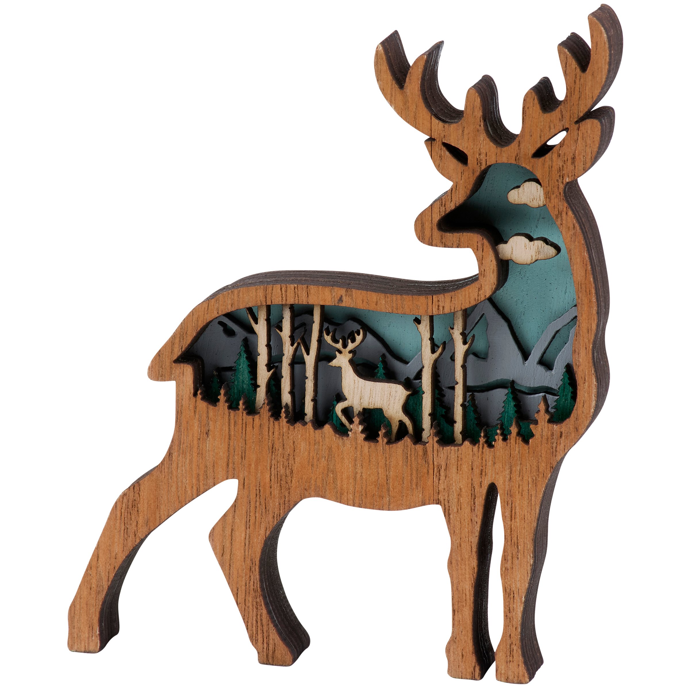 A wooden sitter from our Lake & Cabin Collection featuring a stag shape cut from natural wood with a forest scene of stag displayed inside that is made with layered cutouts of colored wood pieces for added dimension. Our Stag sitter is designed to free stand on flat surface for display. A nature themed home accent that can be easily displayed in any home or work space.