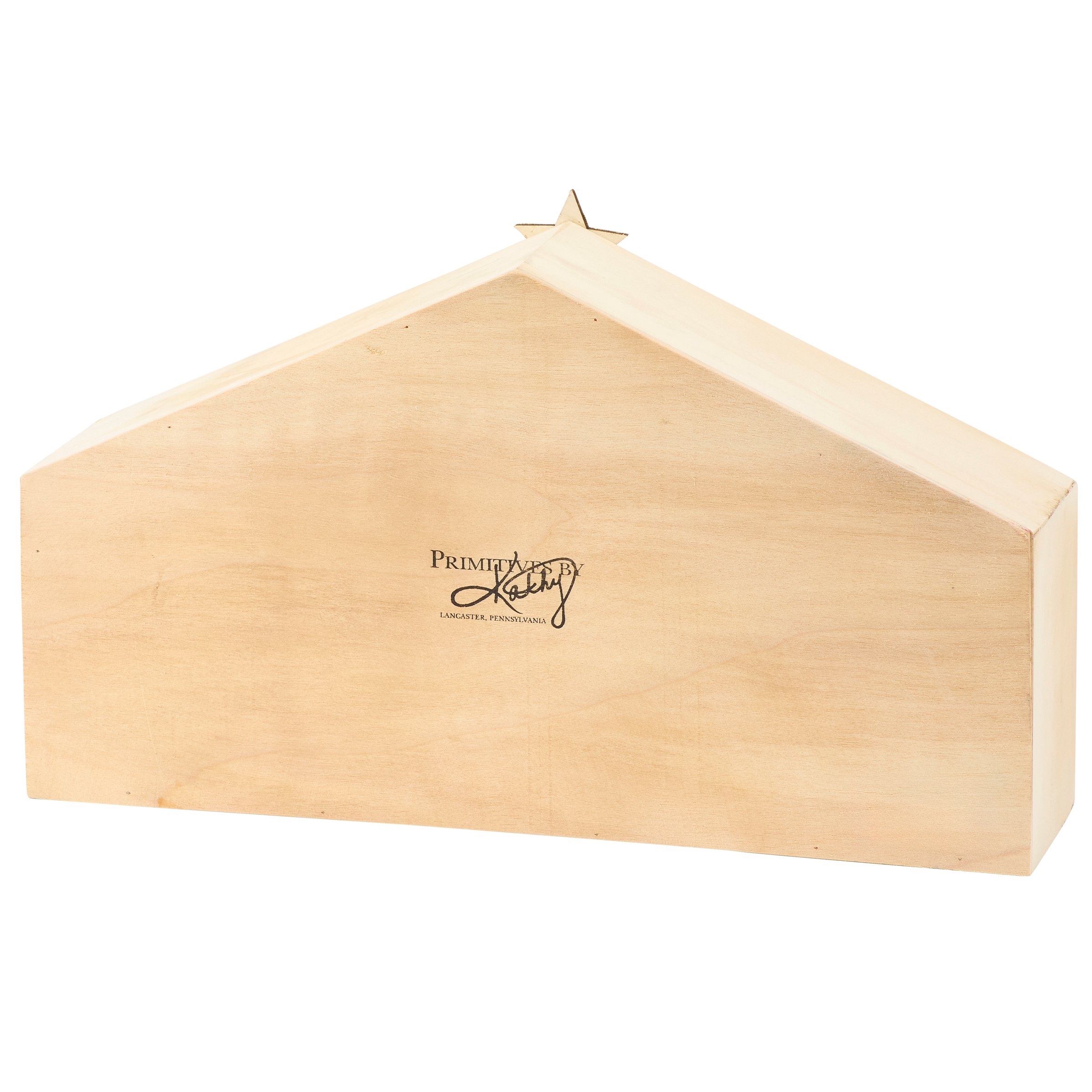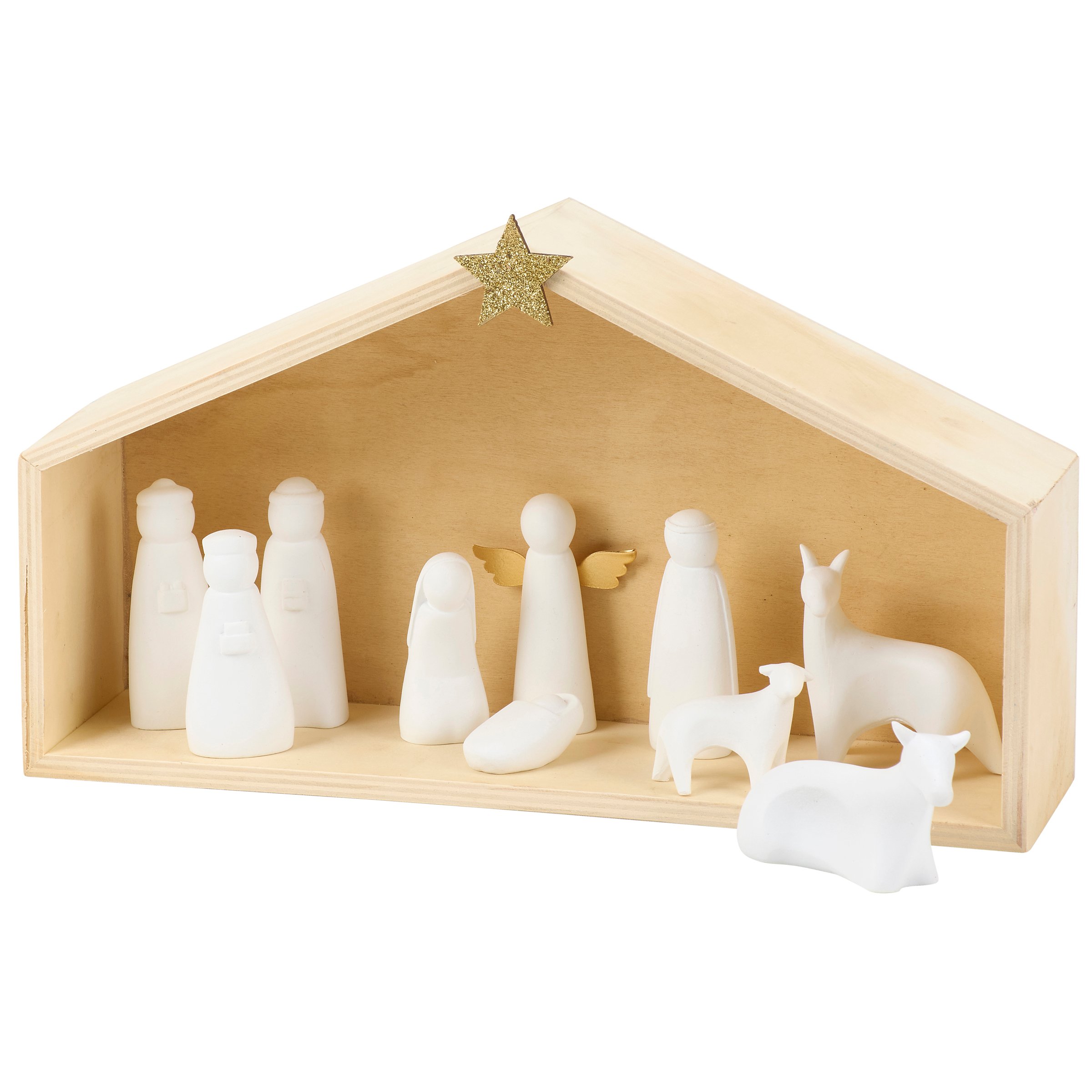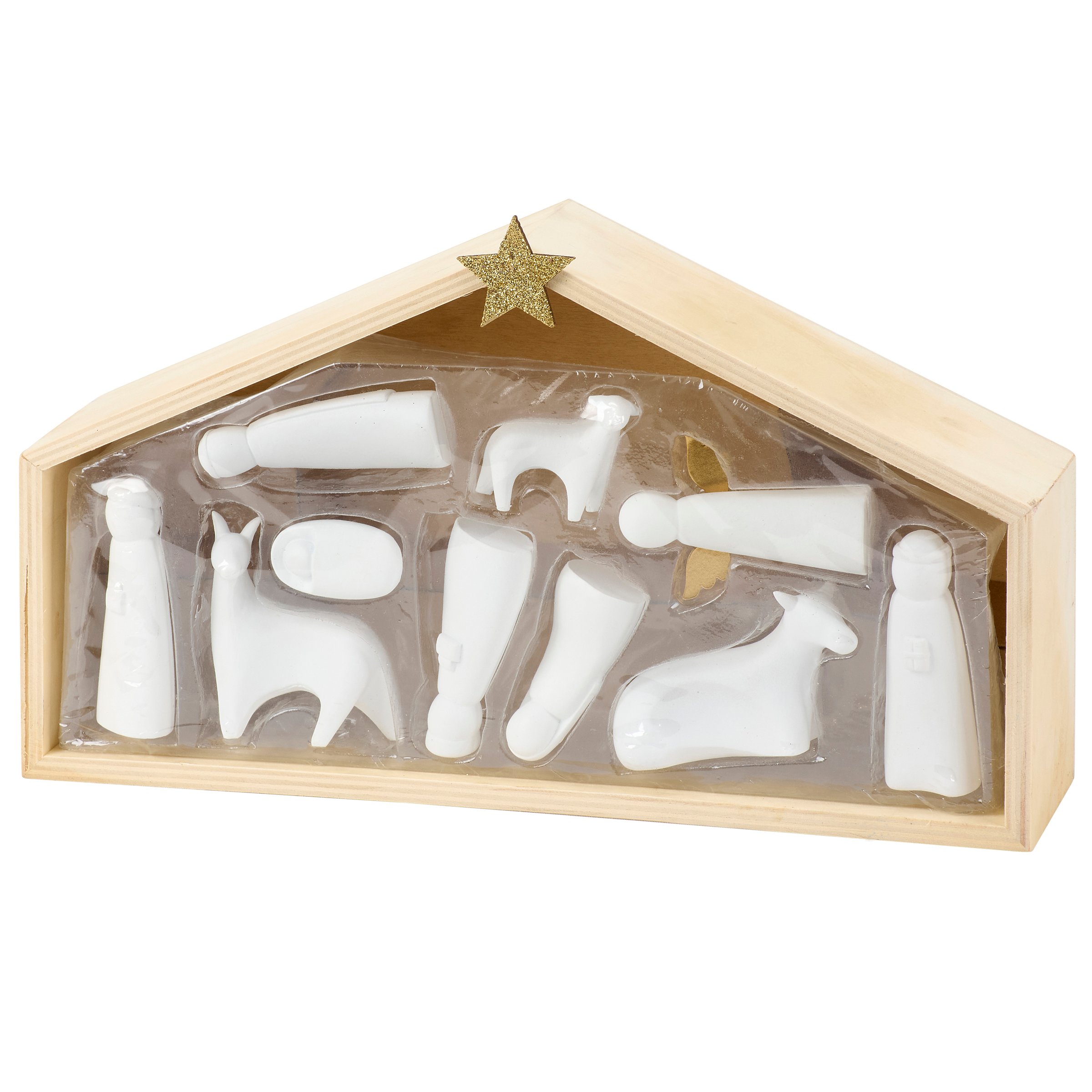 A sitter from our Christmas Collection featuring a simple natural wood manger with gold glitter star accent on top as well as a set of 10 stoneware figures that create a nativity scene inside. Each stoneware figure displays simple individual designs with metallic gold detail on the angel's wings. Our Stoneware Nativity sitter is packaged to protect the stoneware pieces while easily displaying the full set. A nativity themed home accent perfect for seasonal displays.