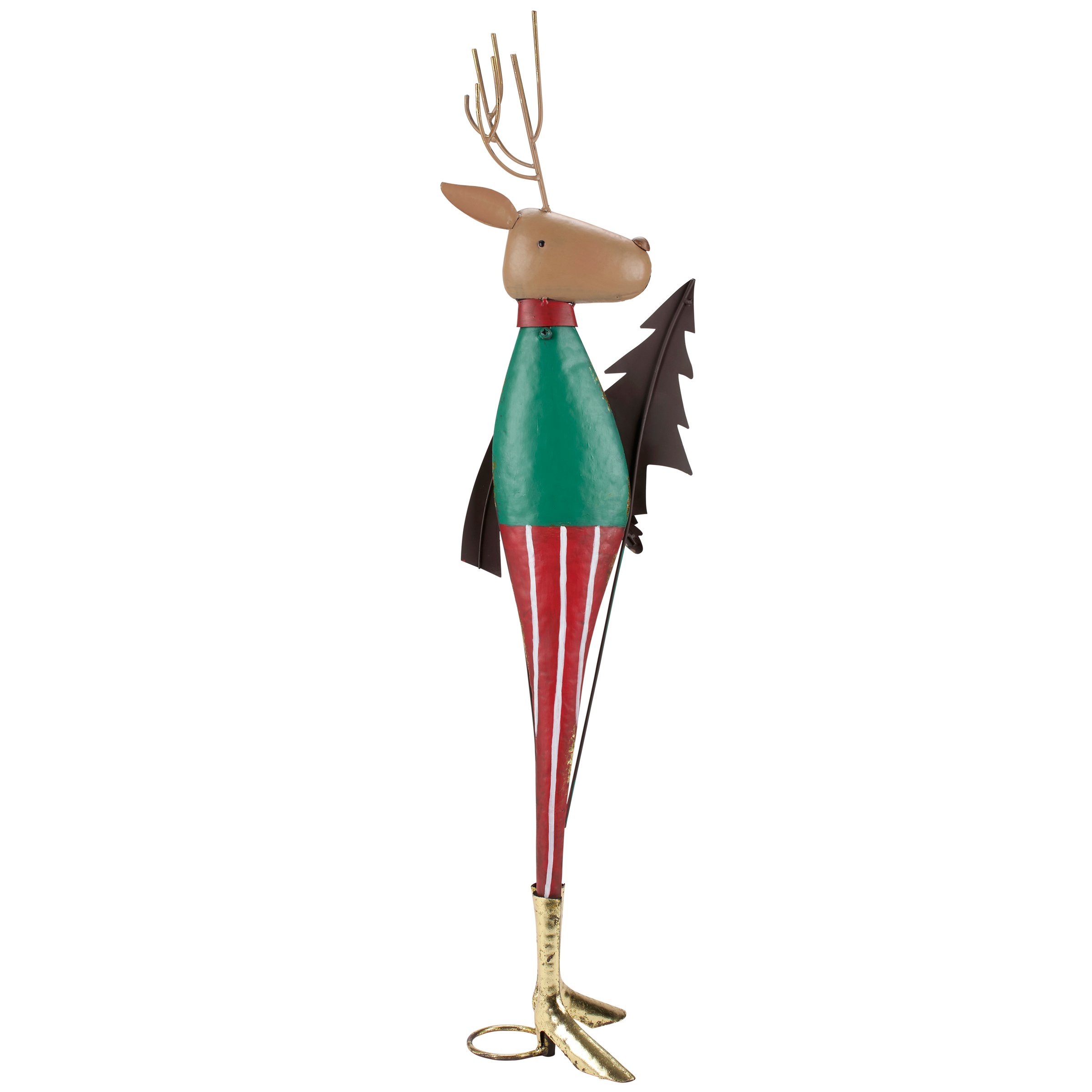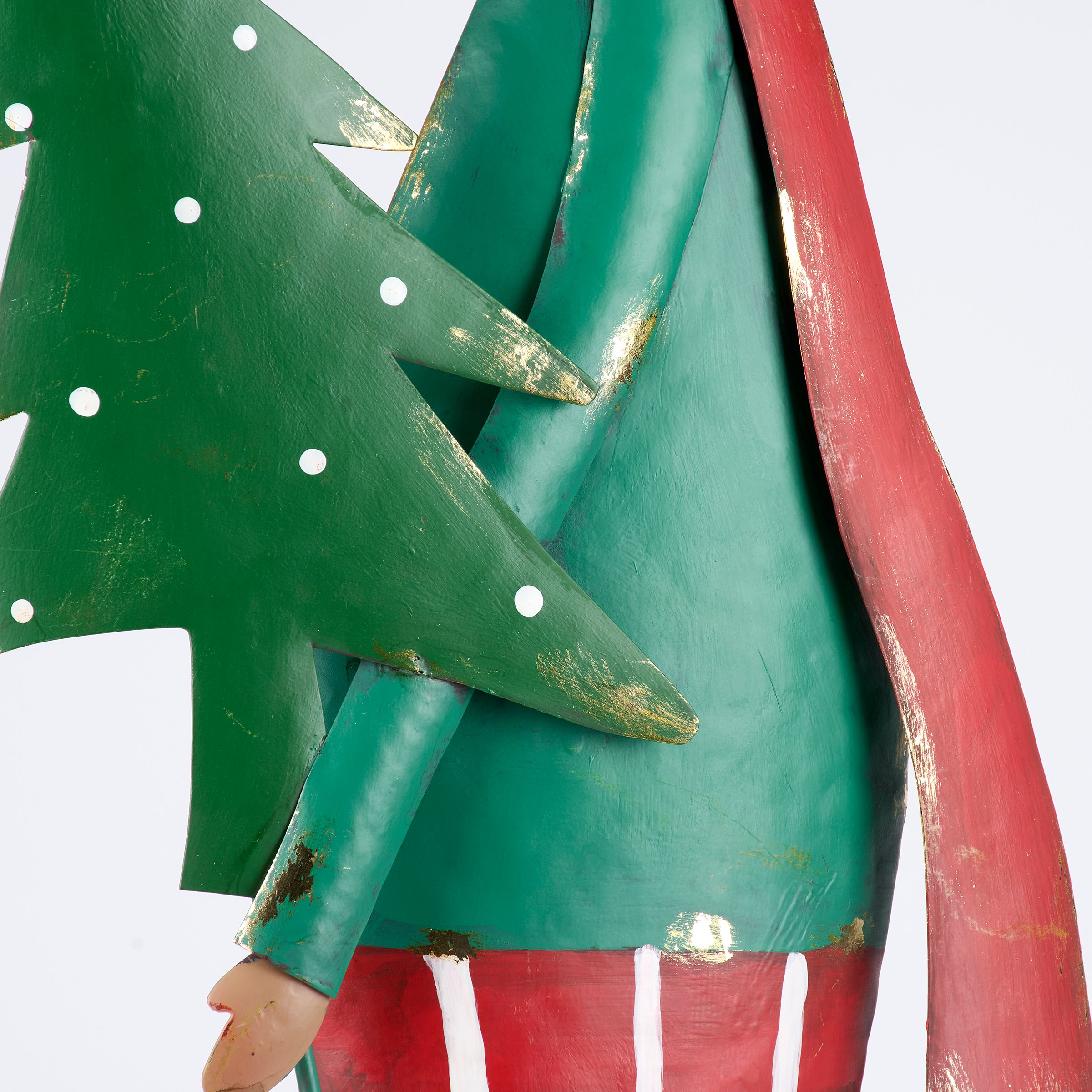 A metal art piece from our Christmas Collection displaying a winter reindeer character design made with painted metal pieces for a rustic handmade aesthetic. Christmas reindeer features painted winter clothing details and a Christmas tree in his hands as well as glitter and metallic gold accents throughout. Our Tall Deer Christmas Tree sitter is designed to free stand on flat surface for display. A rustic Christmas home accent that easily adds seasonal style to any home or work space.