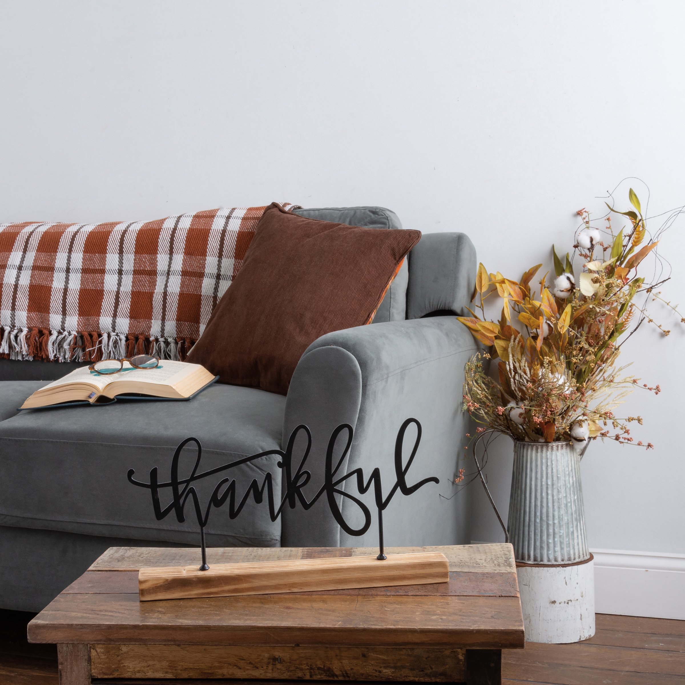 A decorative sitter from our Fall & Harvest Collection featuring a metal sign boasting an inspirational word standing on a natural wood base. Hand lettered "Thankful" sentiment is perfect for everyday and seasonal use. Our Thankful sign can free-stand alone.