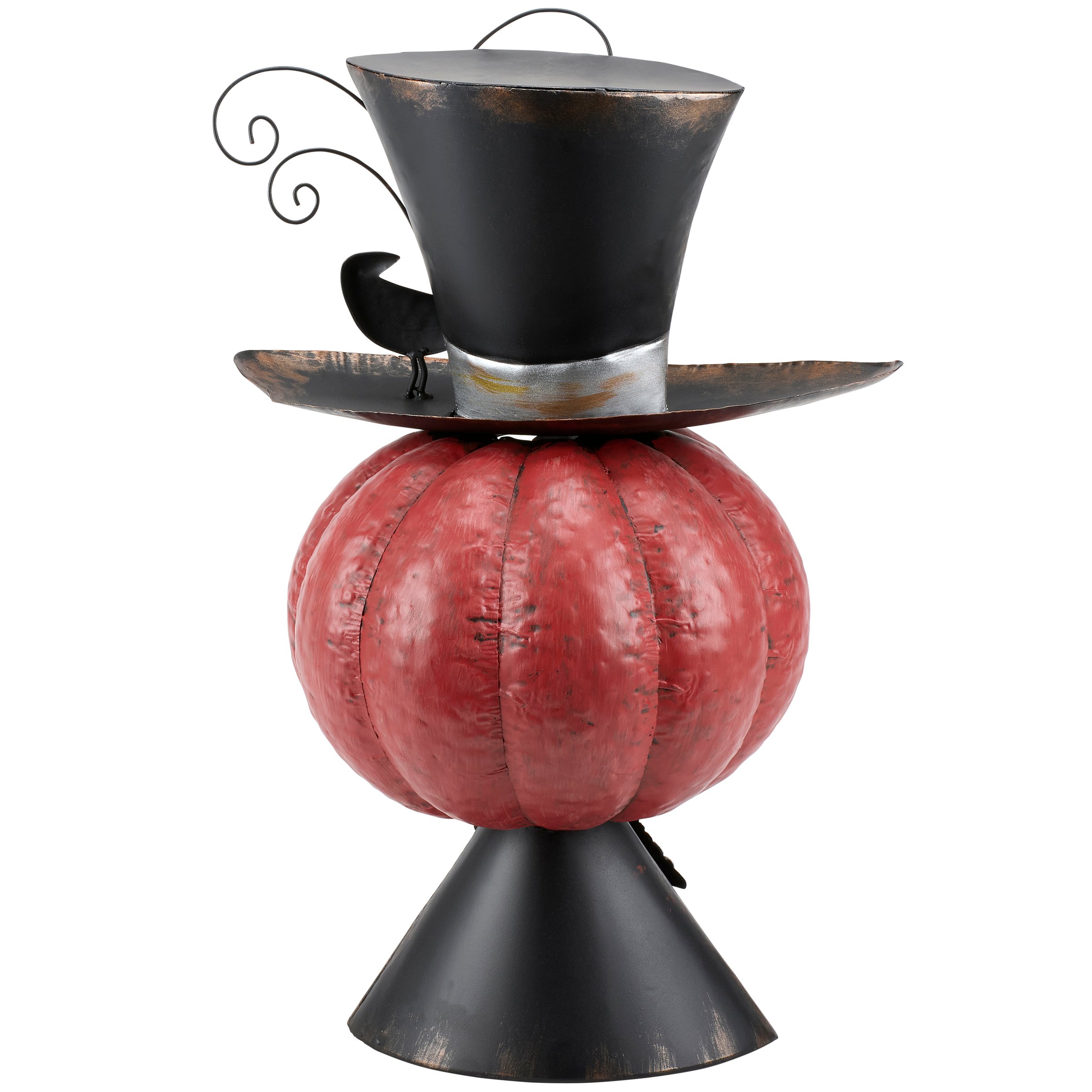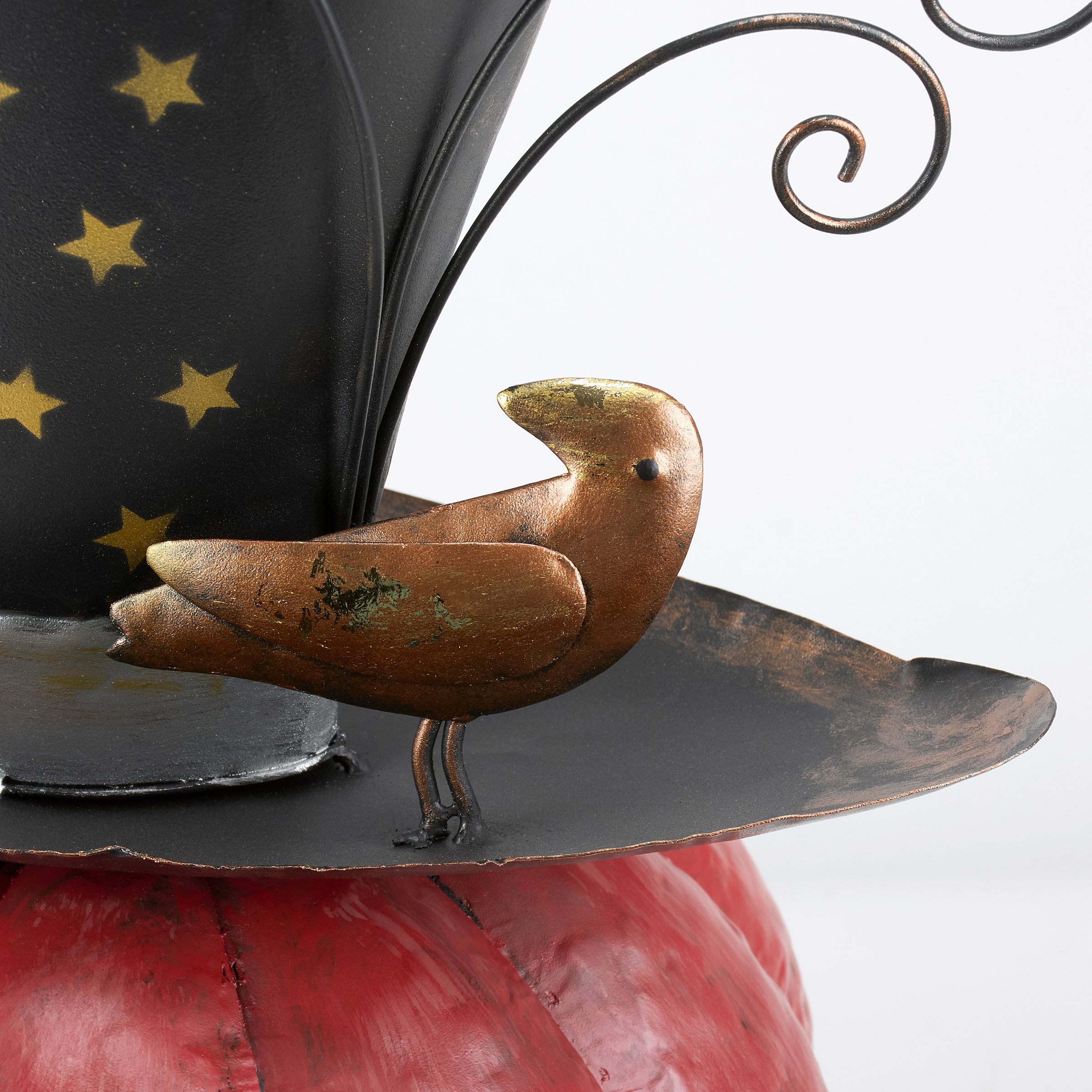 A metal art piece from our Halloween Collection displaying a whimsical jack o'lantern head design made with colorful painted metal pieces for a handmade aesthetic. Halloween jack o'lantern features top hat detail with a bird attached as well as metallic gold accents throughout. Our Top Hat Jack sitter is designed to free stand on flat surface for display. A whimsical Halloween home accent that easily adds seasonal style to any home or work space.