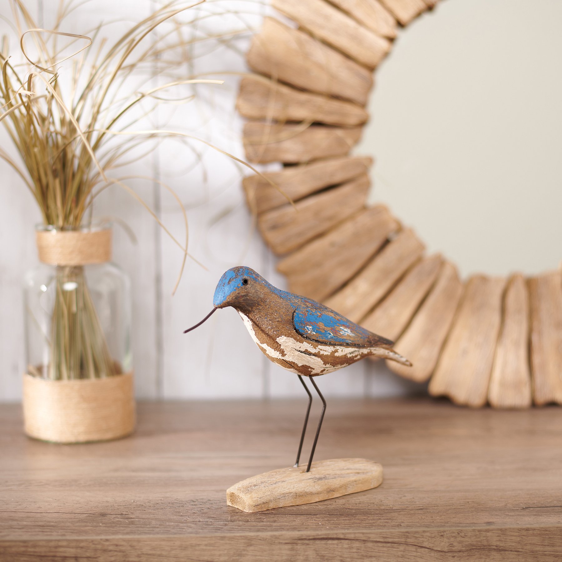 A decorative sitter from our Beach Collection featuring a willet bird design made of natural wood with distressed details. Bird stands on driftwood style base. Our Willet sitter is designed to free-stand on any flat surface. A primitive option for beach-themed everyday home décor.
